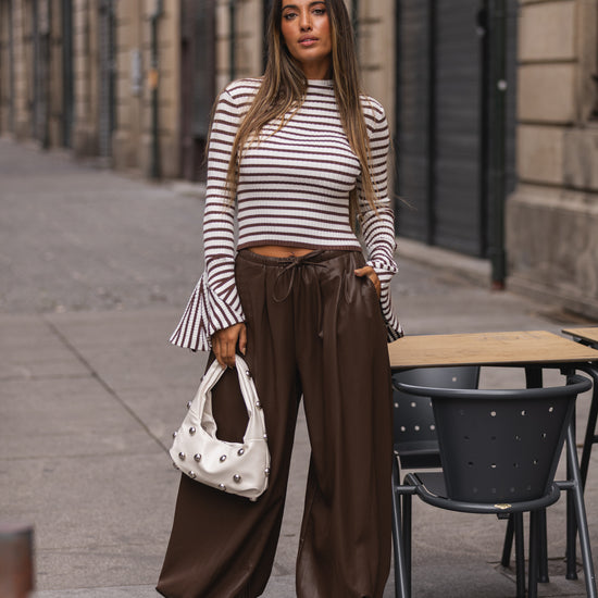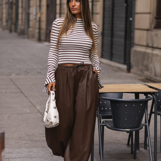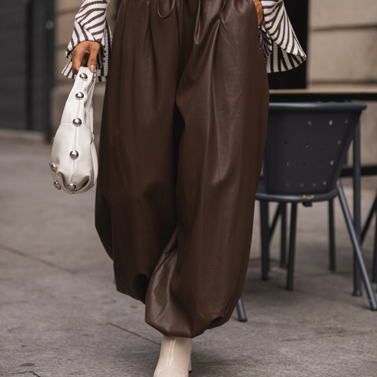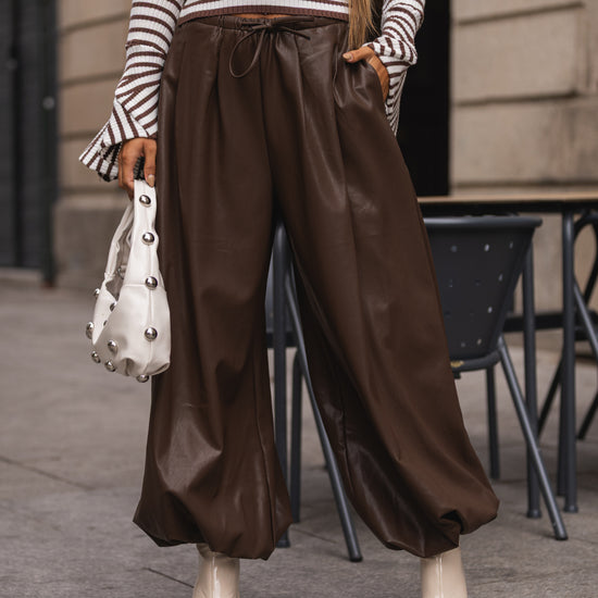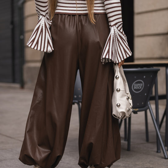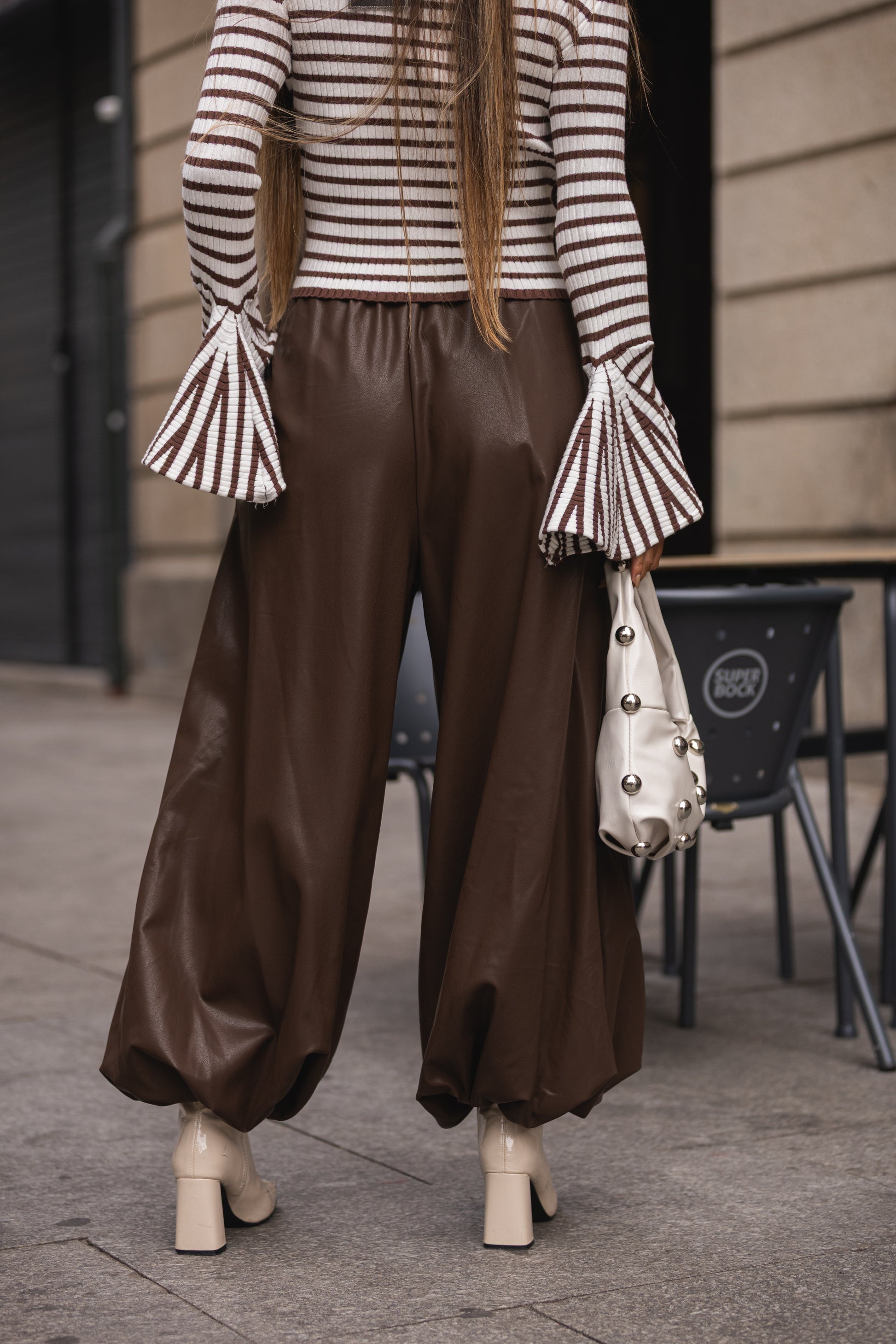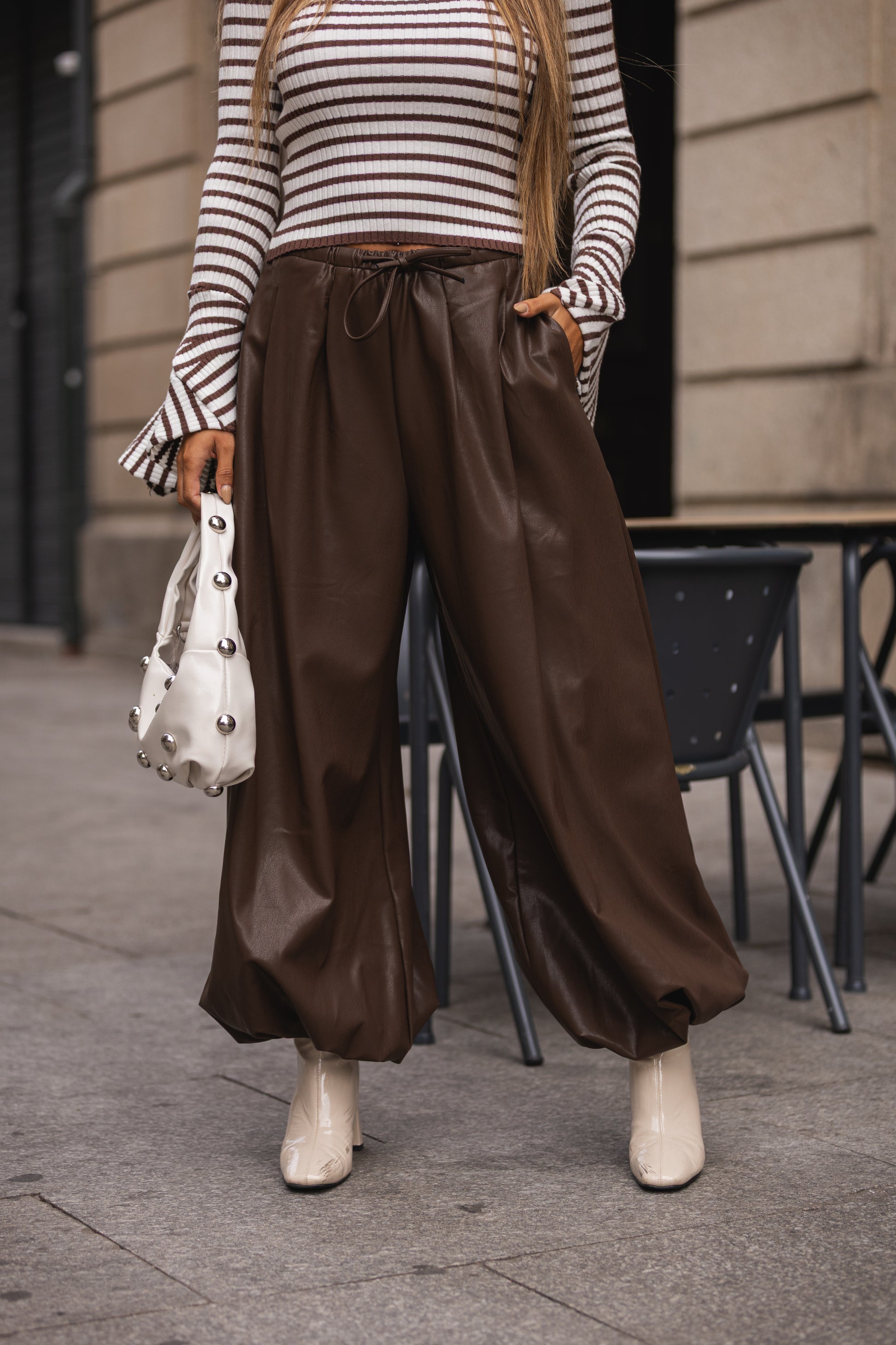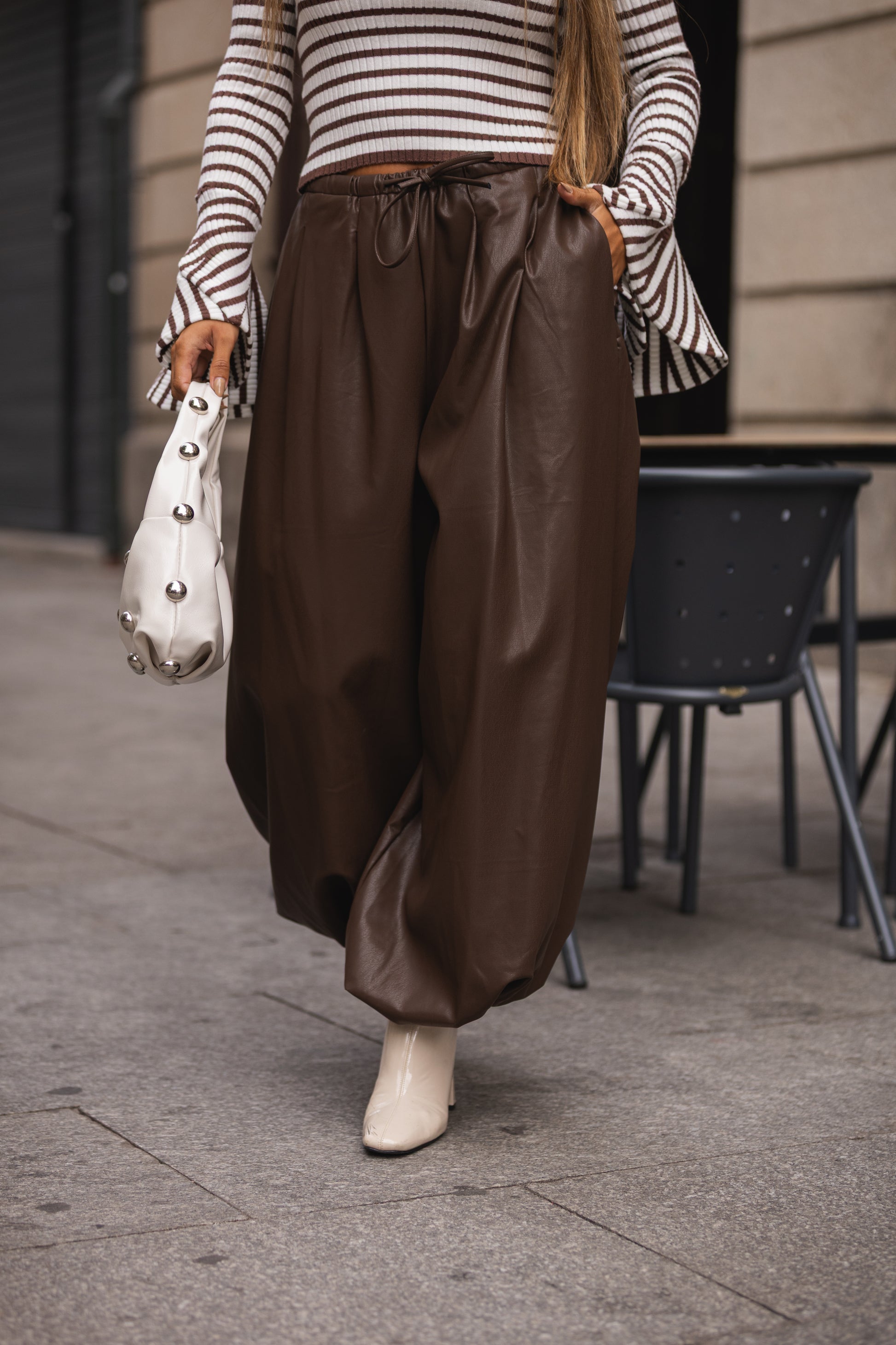 Calça em ecopele, tem algum elastano, veste grannde por ter elastico na cintura e ser solta ao longo da perna.