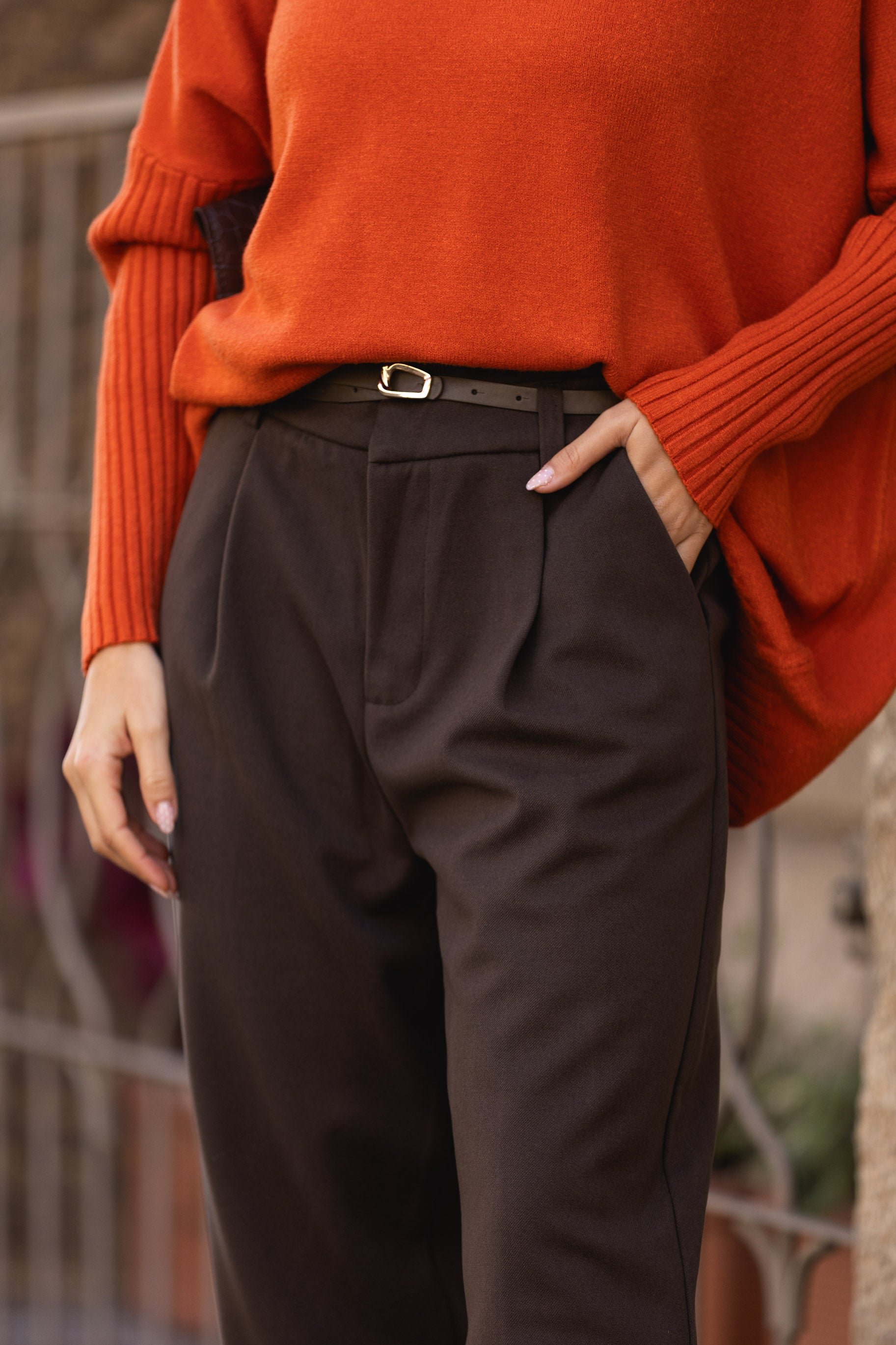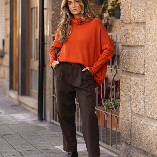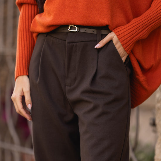 Calça de cinta subida em fazenda - castanha