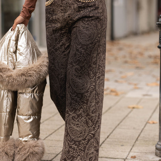 Calça ganga c/ padrão castanho c/ brilhos nos bolsos