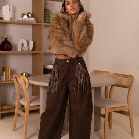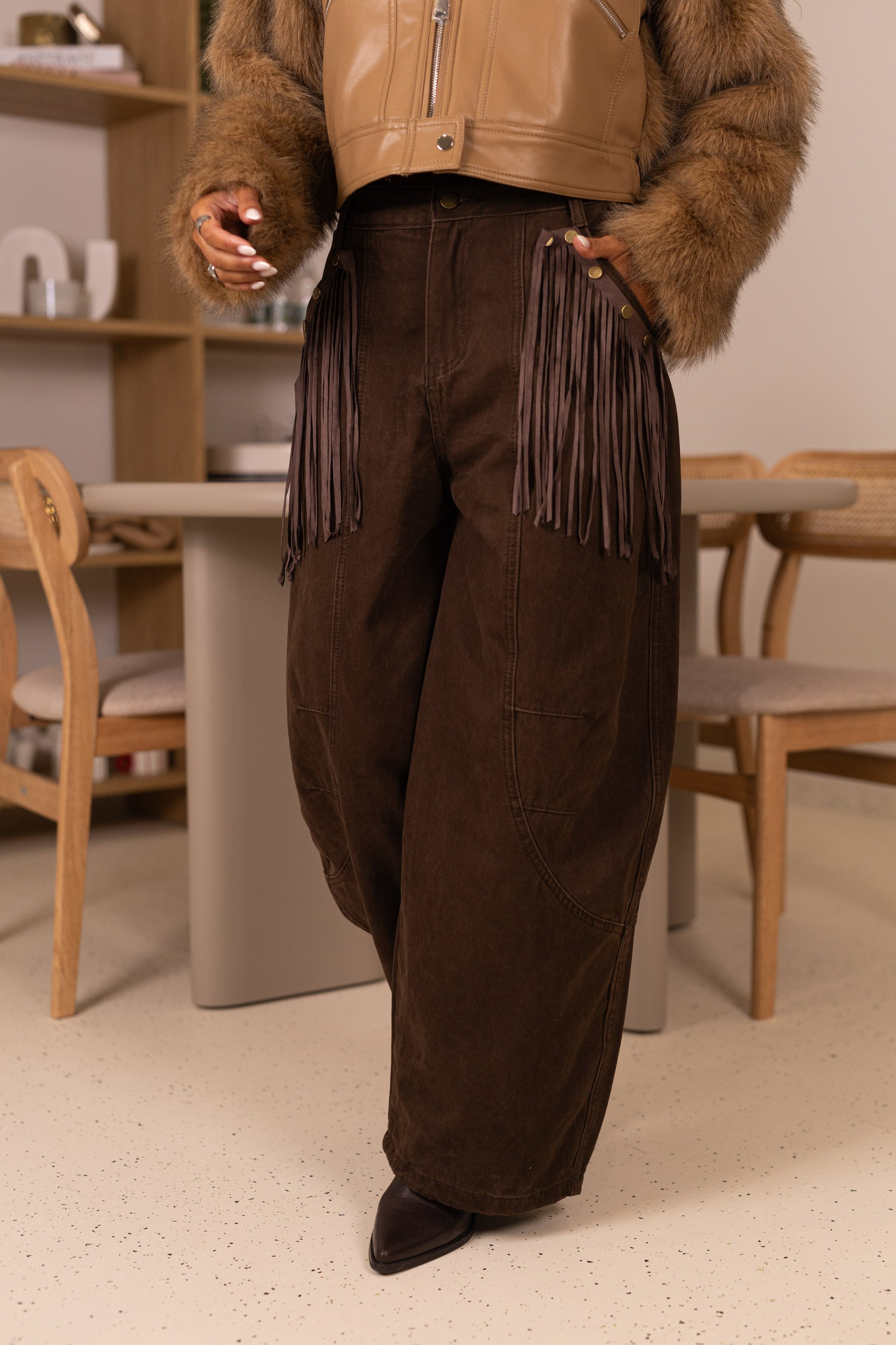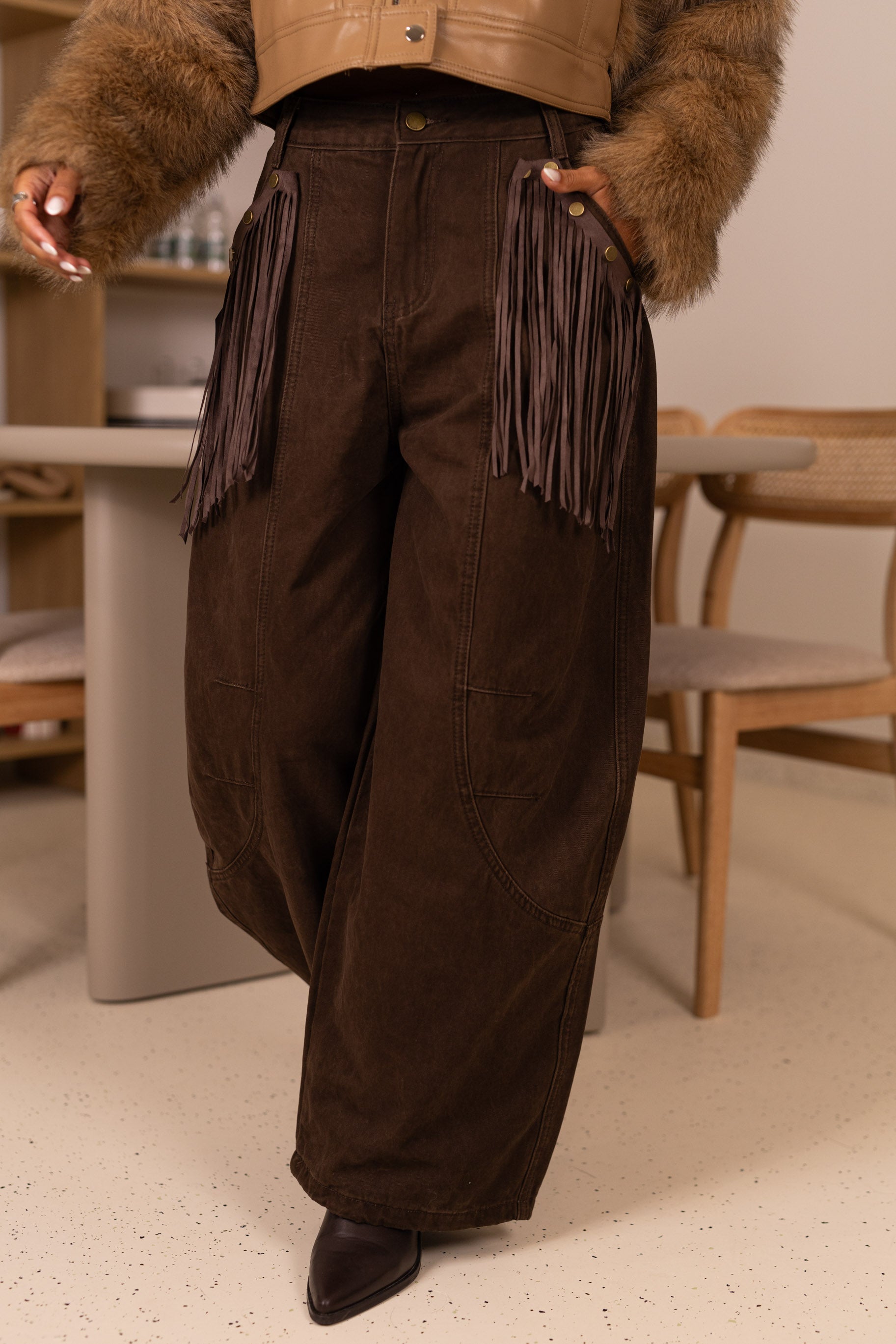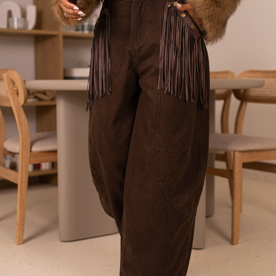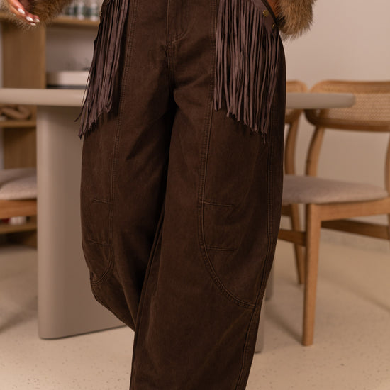 Calça ganga castanhas c/ franjas nos bolsos removiveis
