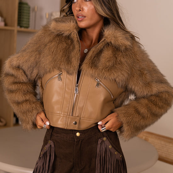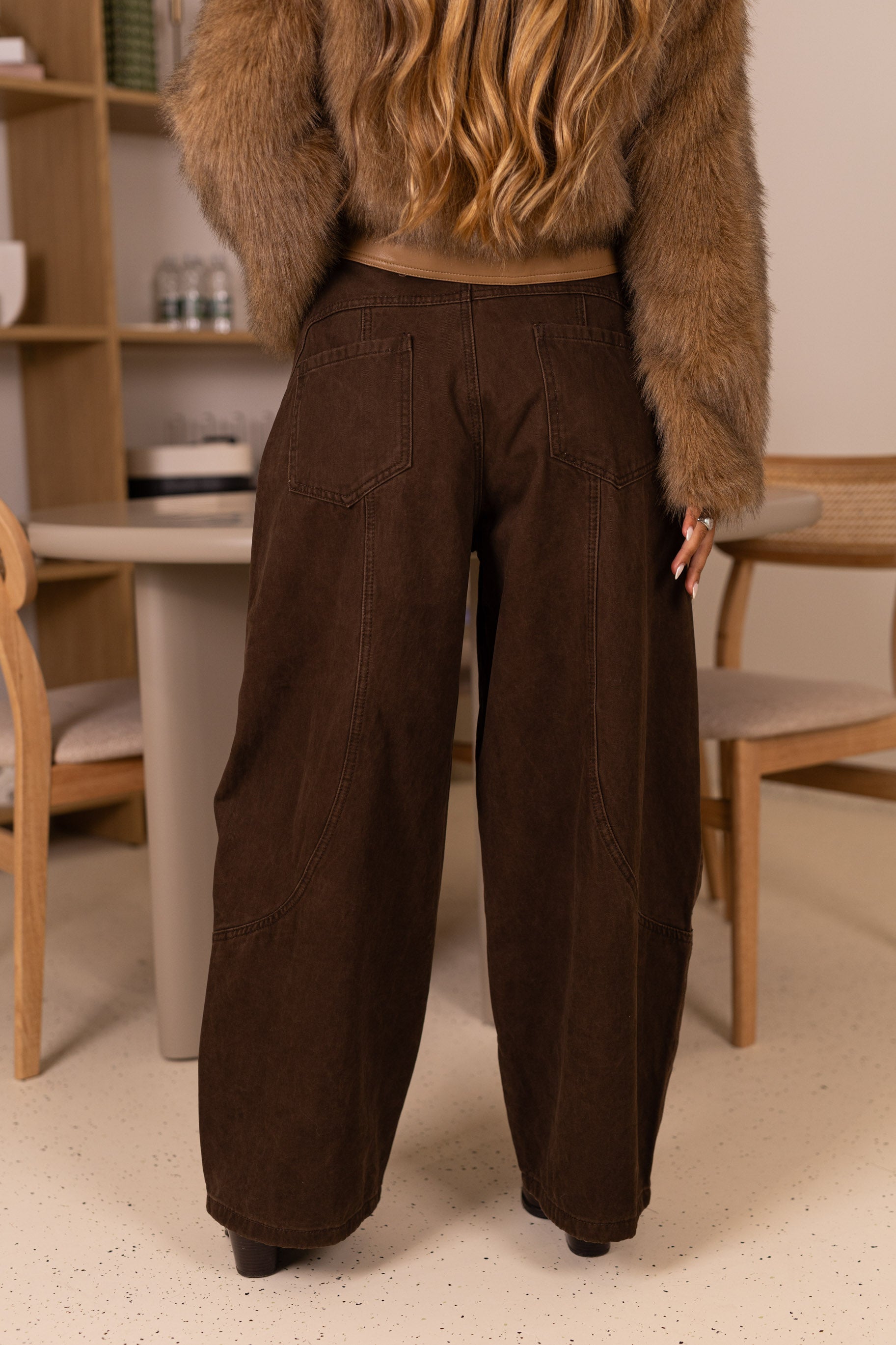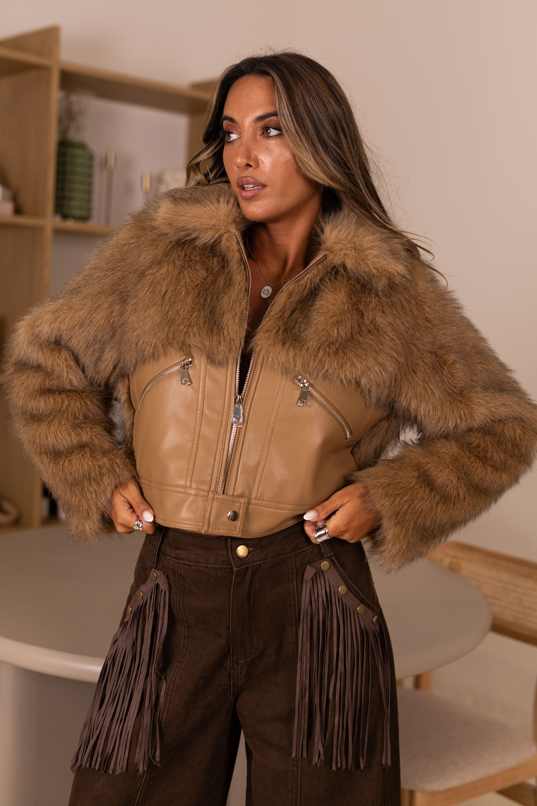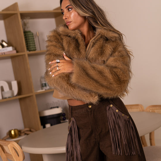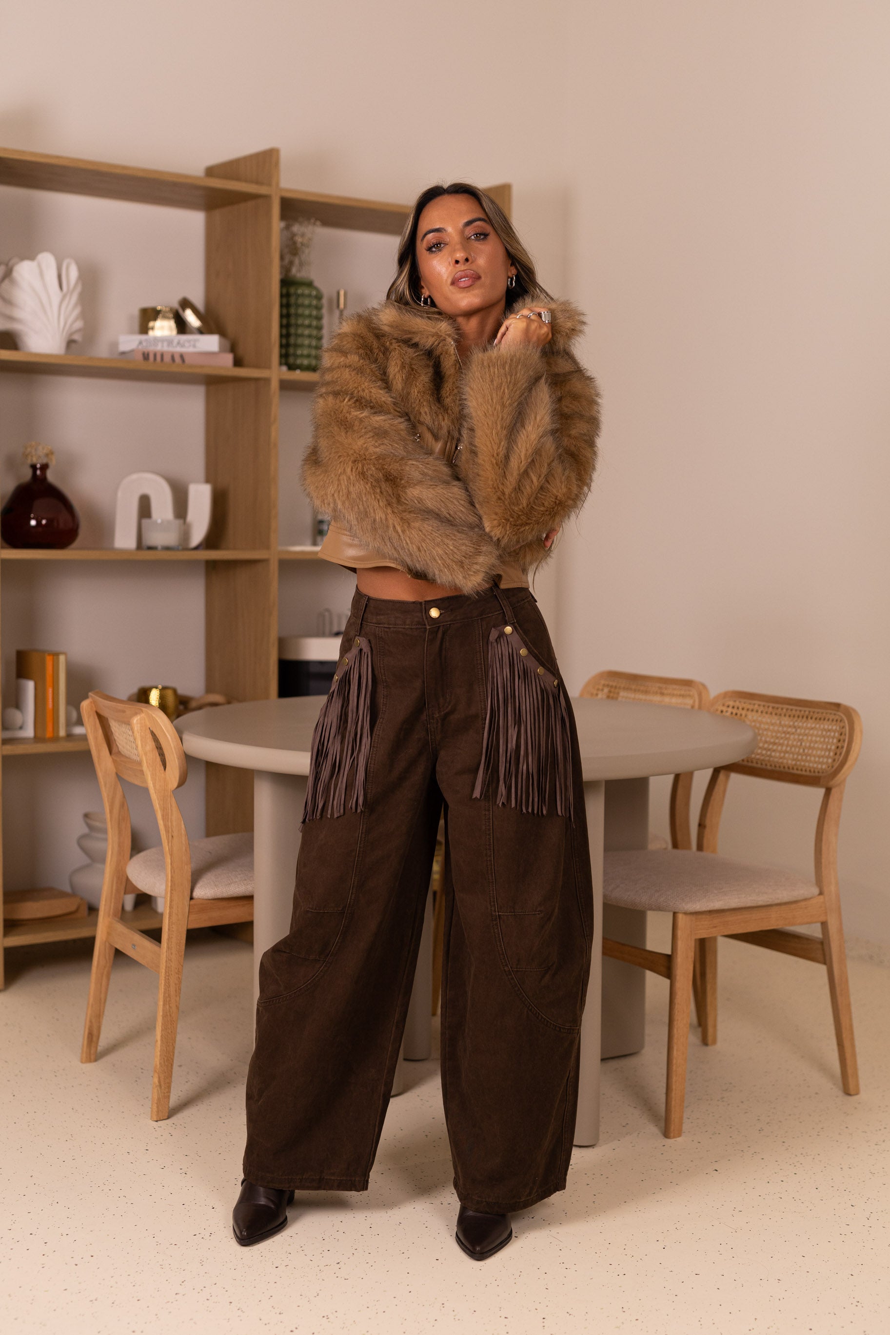 Calça ganga castanhas c/ franjas nos bolsos removiveis
