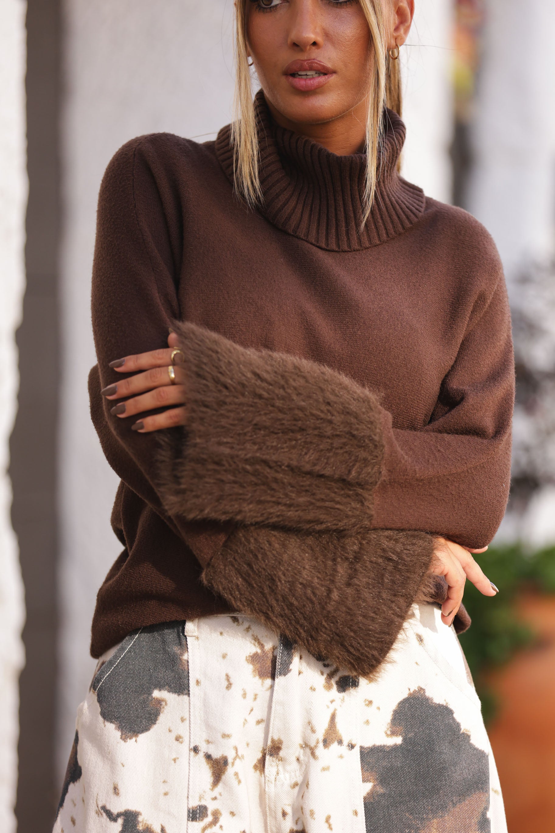 Camisola em malha, com pormenor de pêlo na manga e a gola é soltinha. É tamanho único e serve bem a L/XL