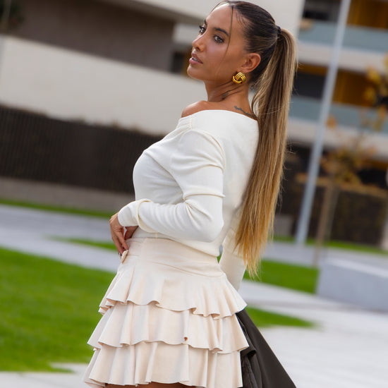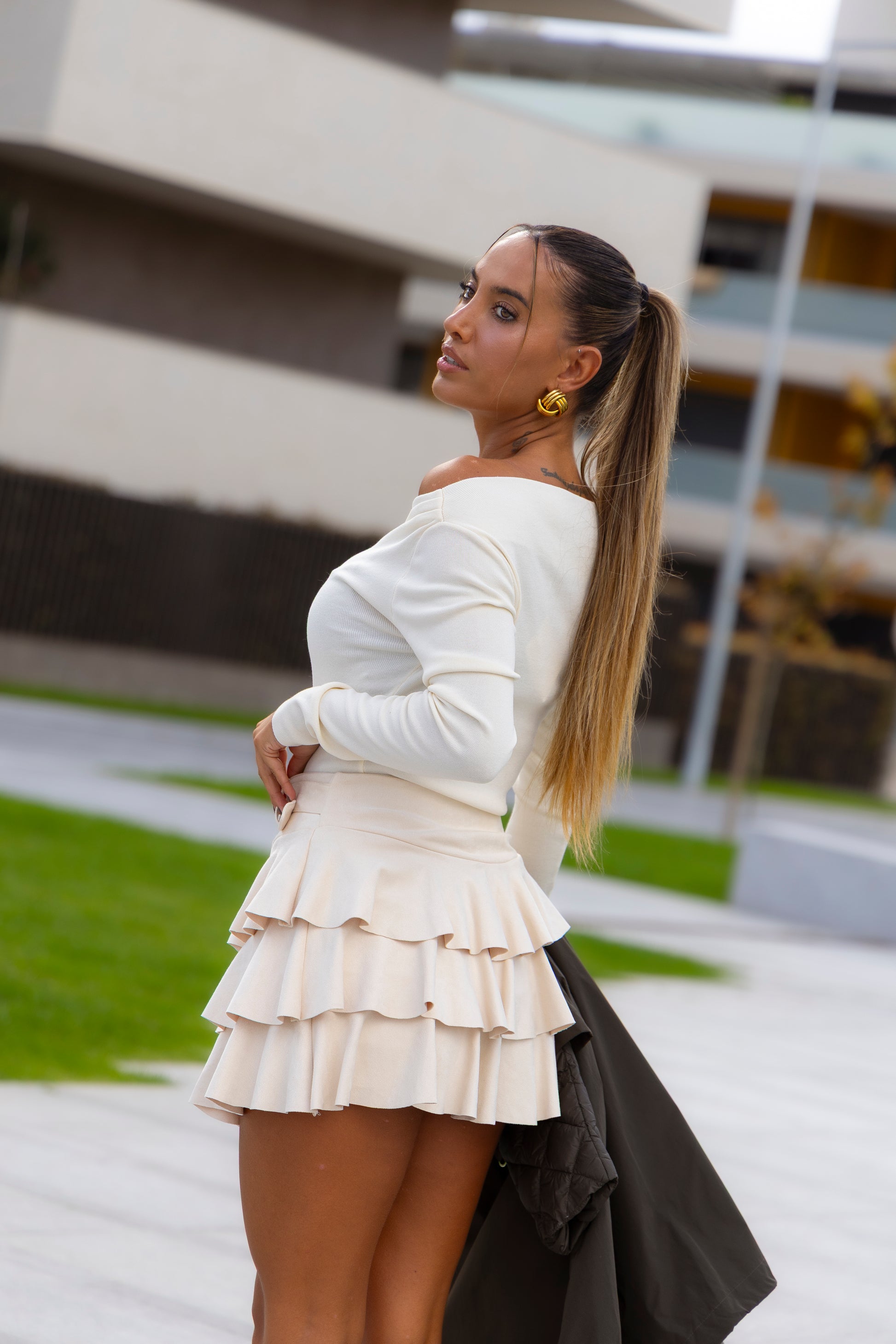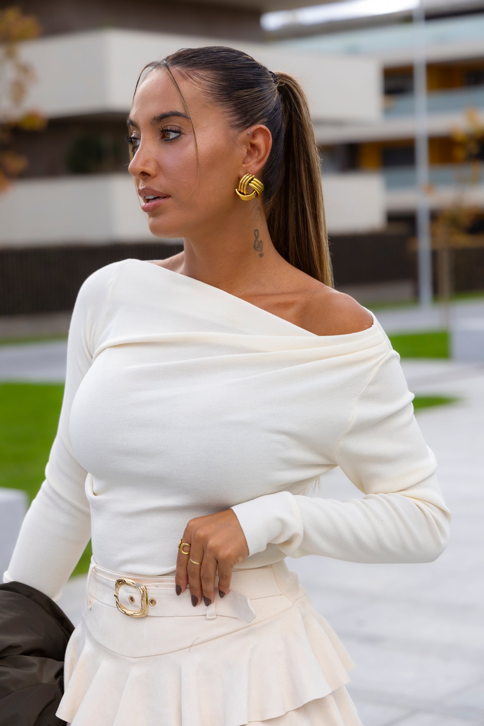 Camisola em malha com pormenor drapeado, podem usar a mostrar o ombro ou normal.