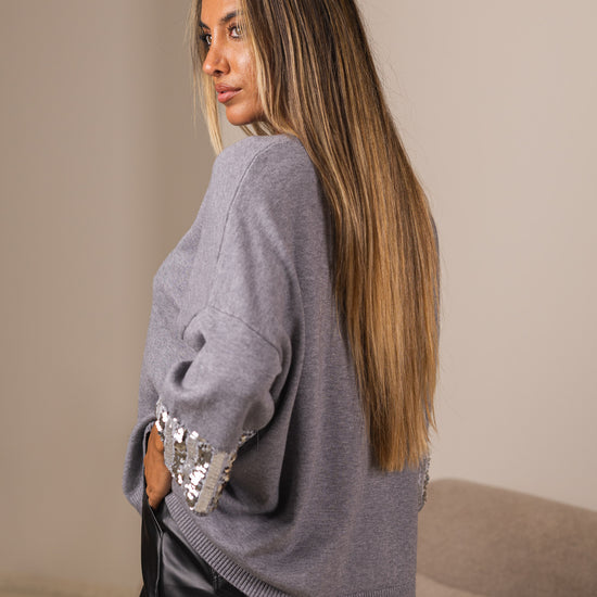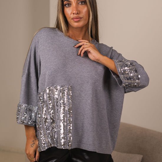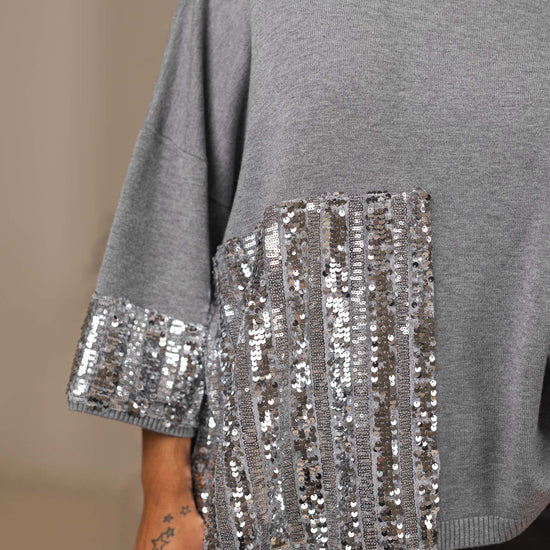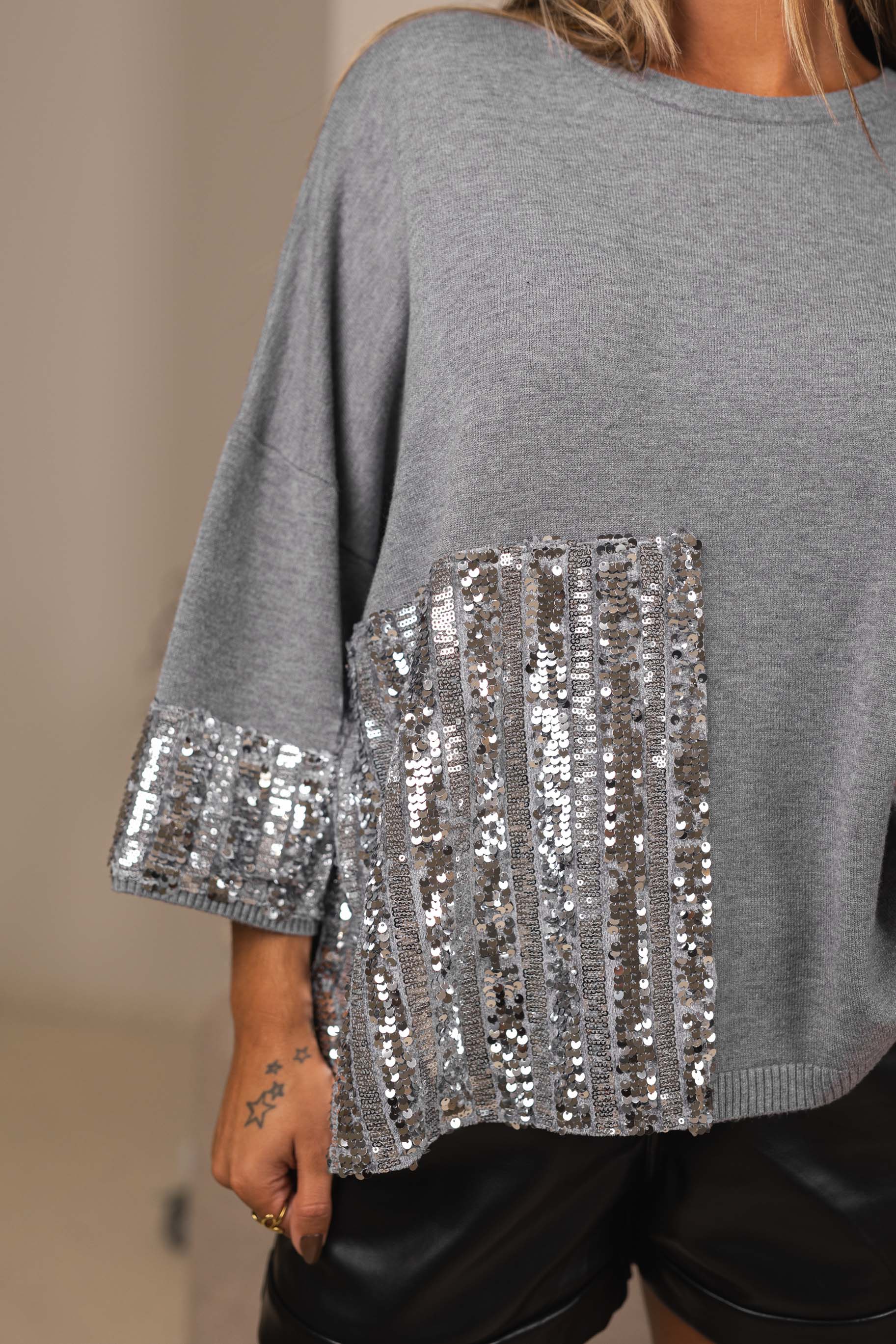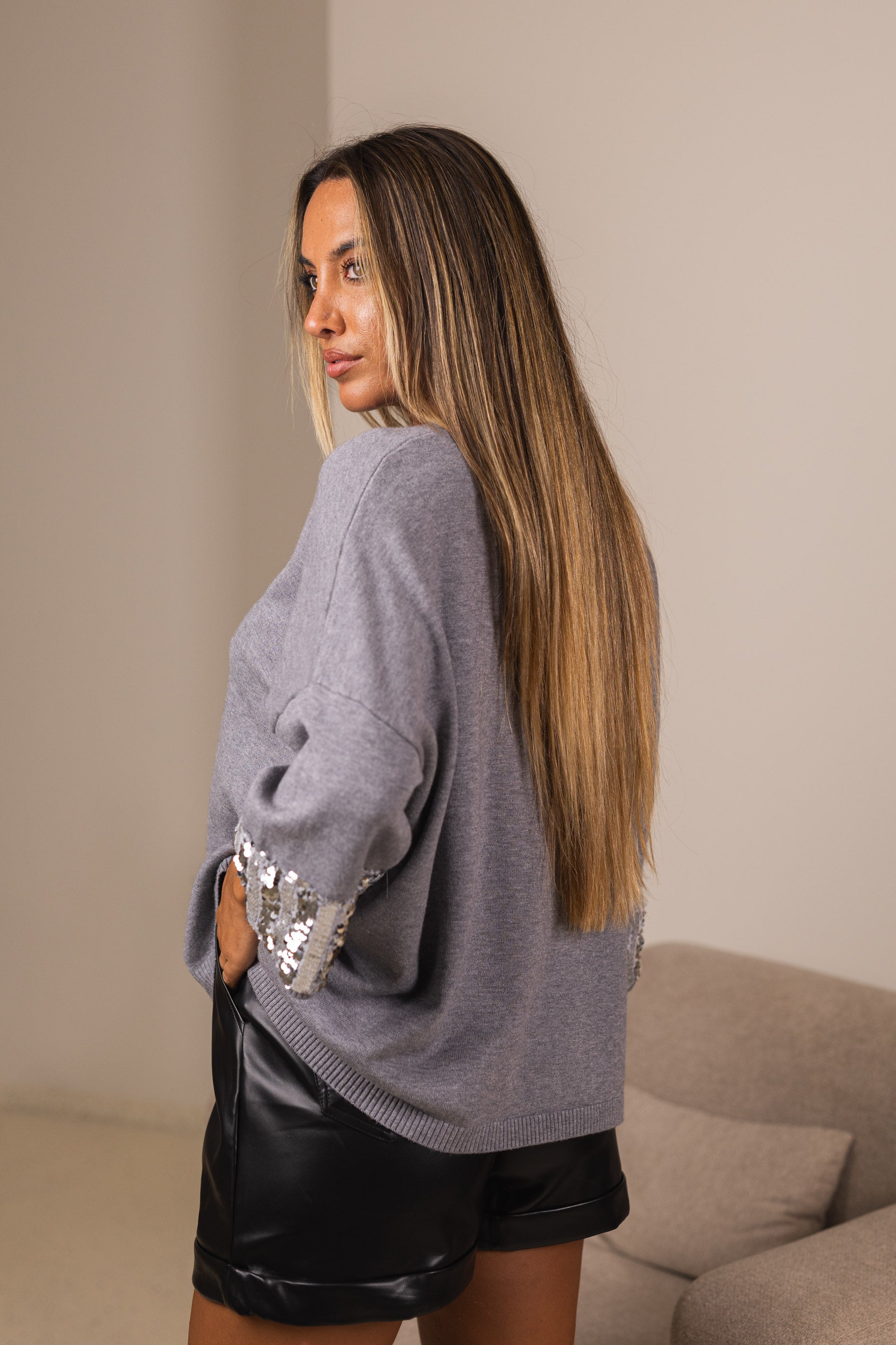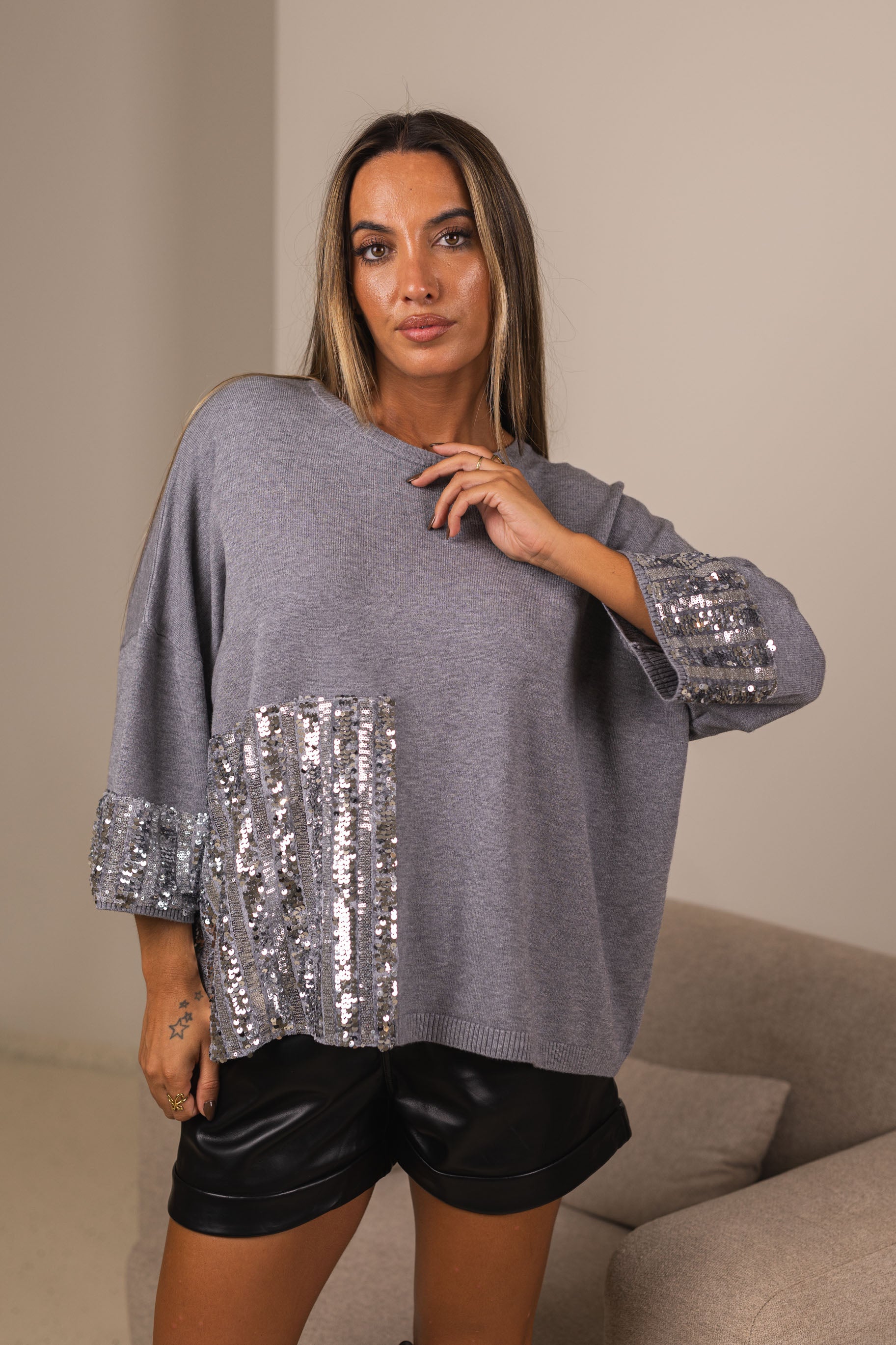 Camisola em malha liso atras e com lantejoulas na parte da frente e nas mangas, veste largo por toda.