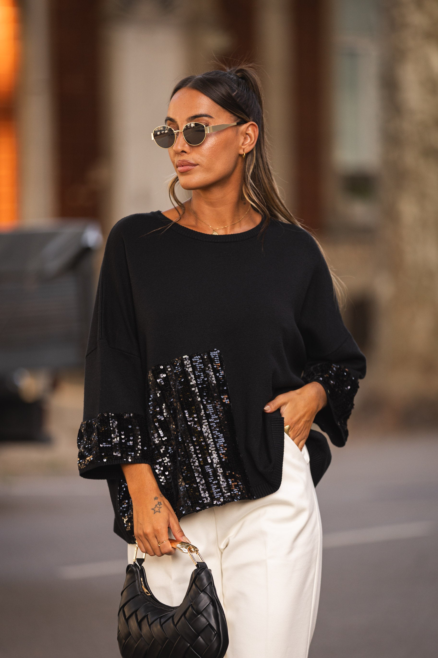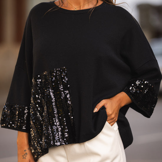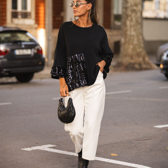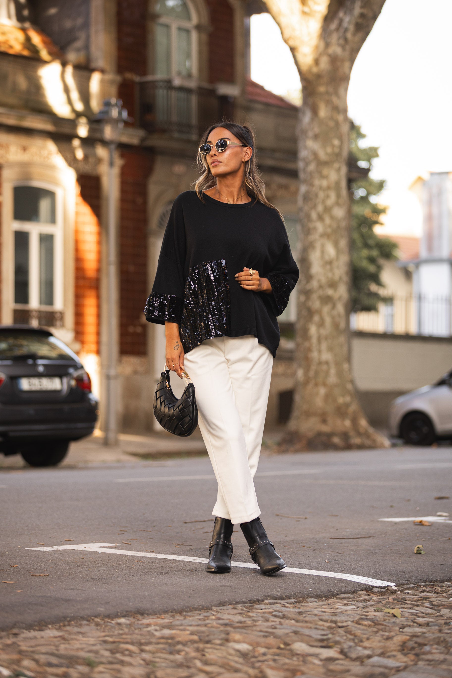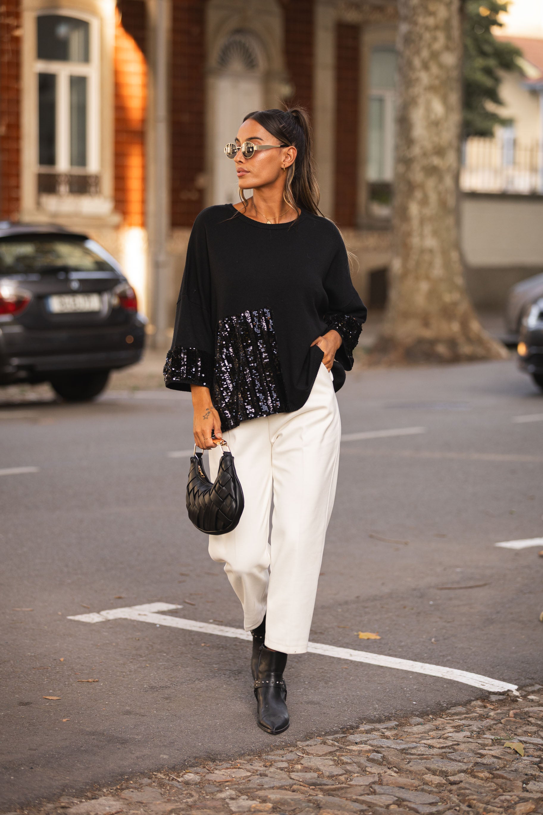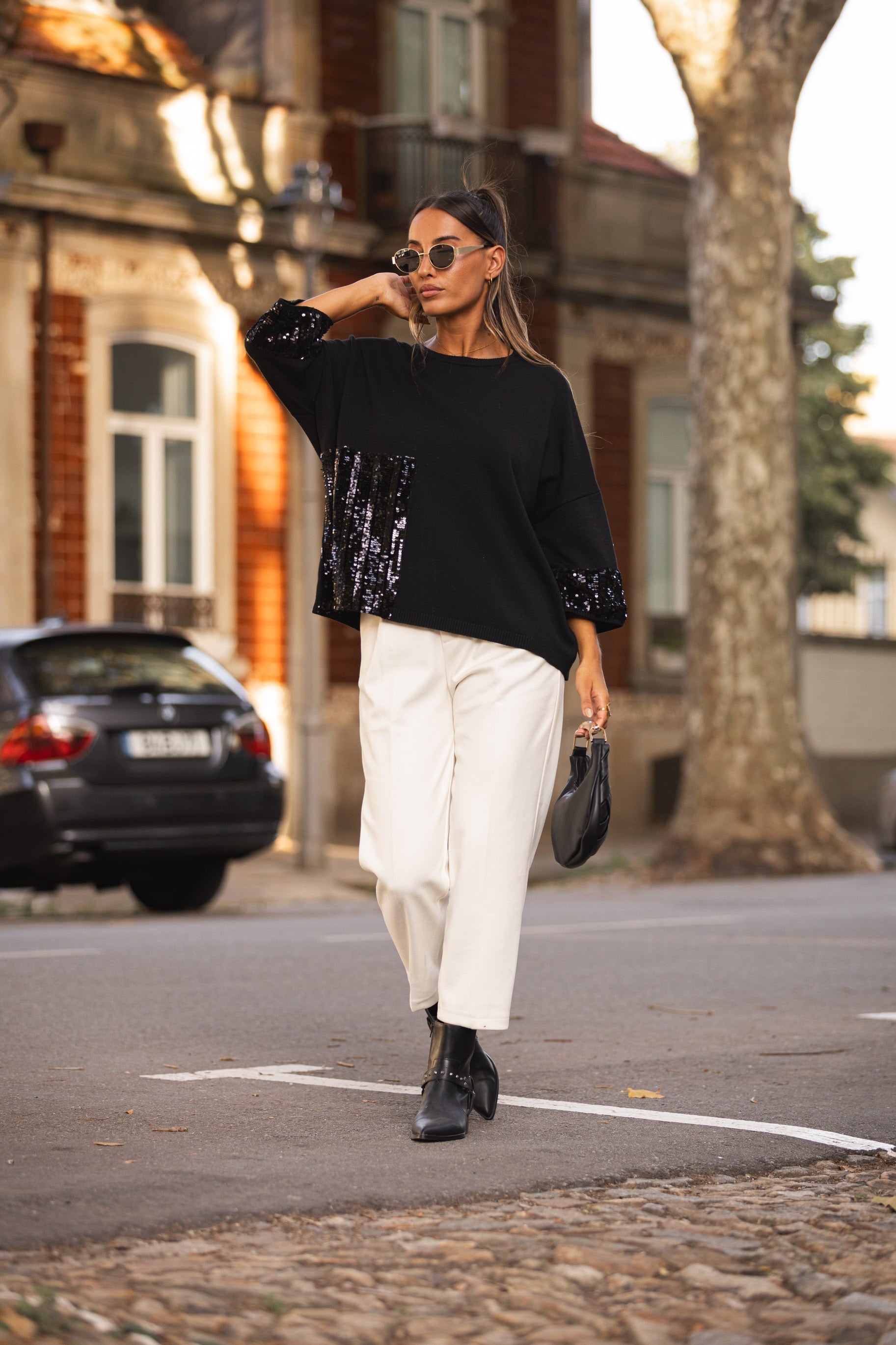 Camisola em malha liso atras e com lantejoulas na parte da frente e nas mangas, veste largo por toda.