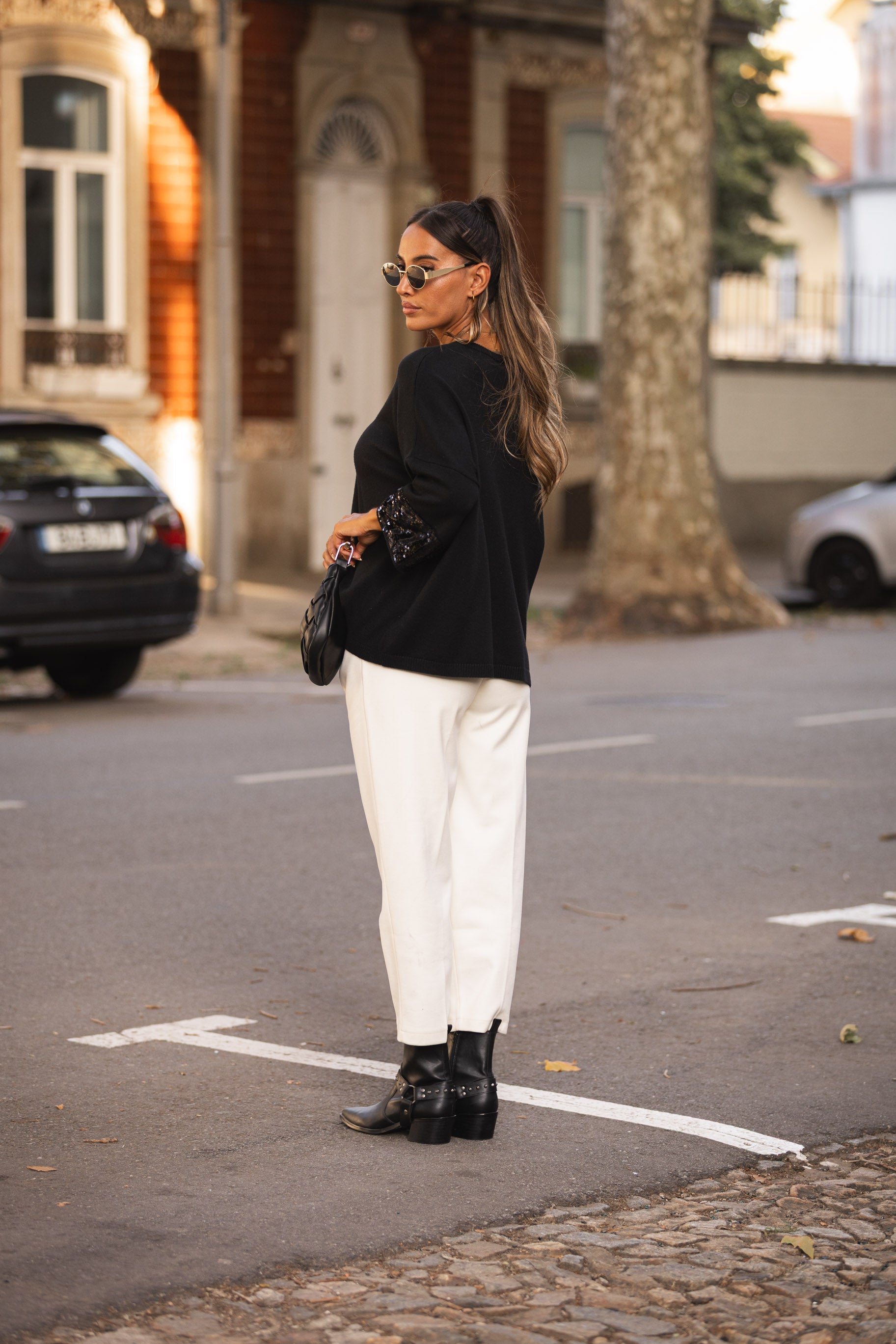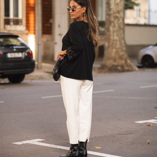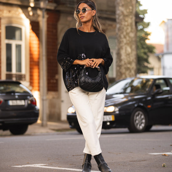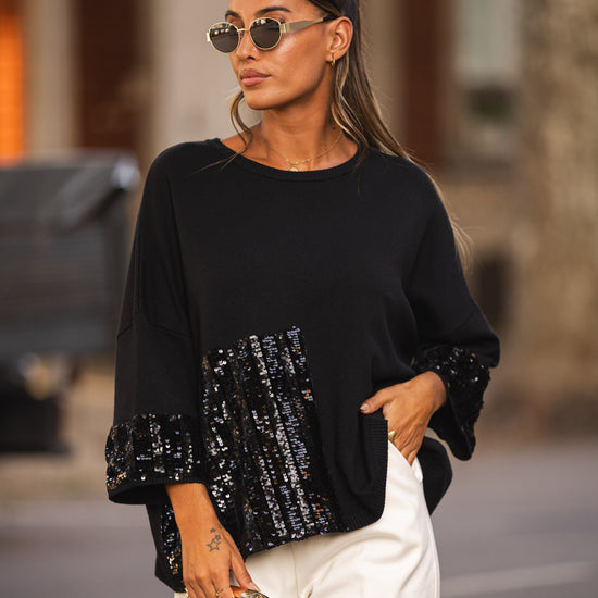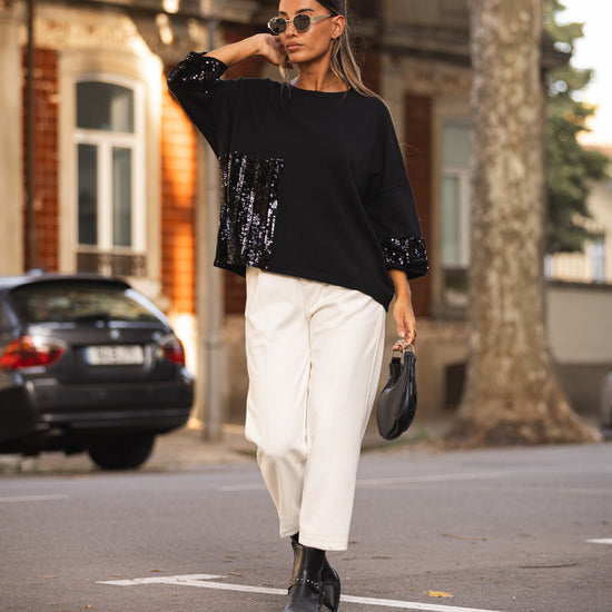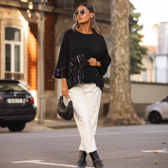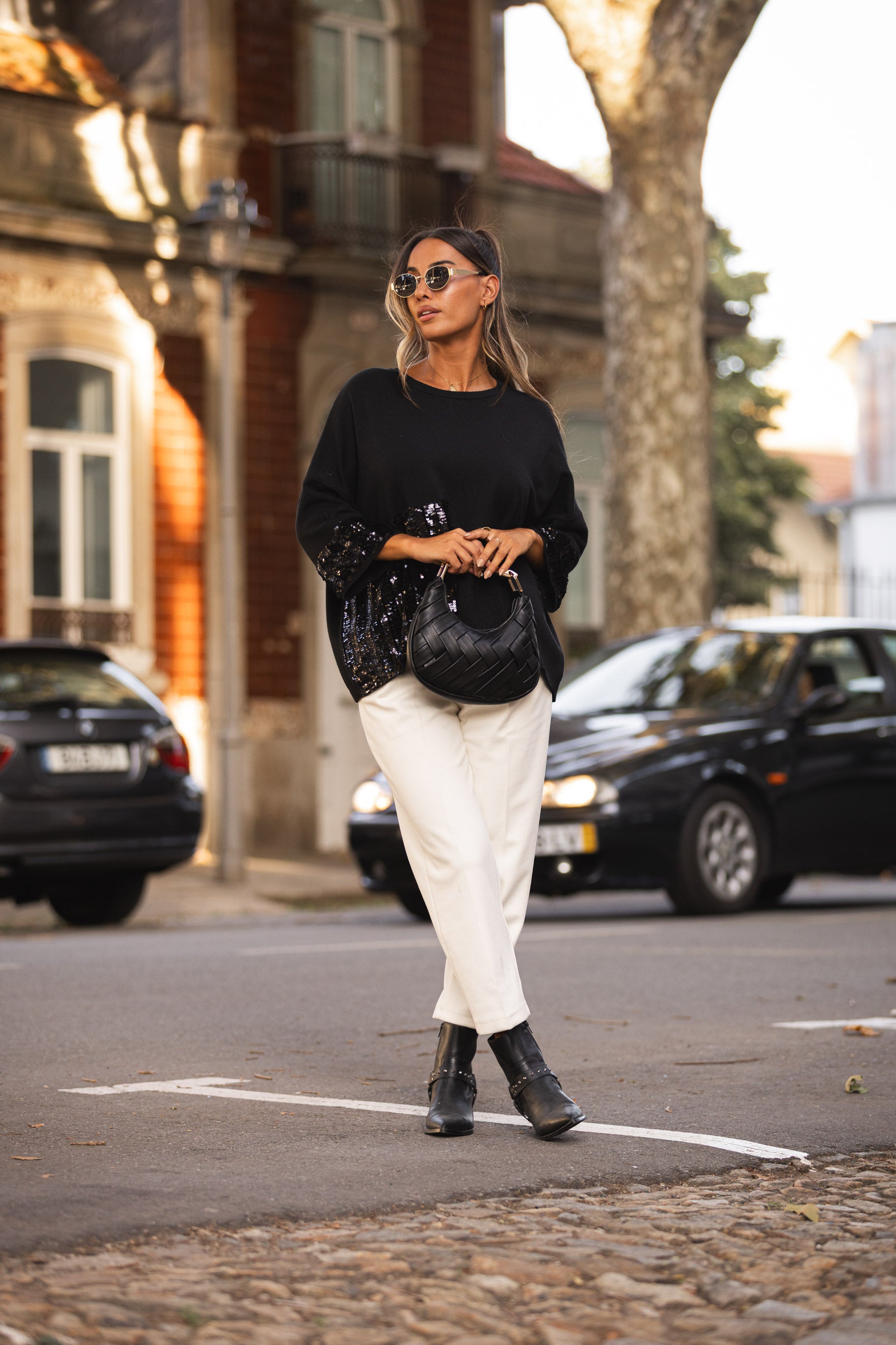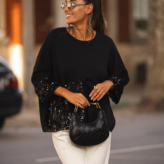 Camisola em malha liso atras e com lantejoulas na parte da frente e nas mangas, veste largo por toda.