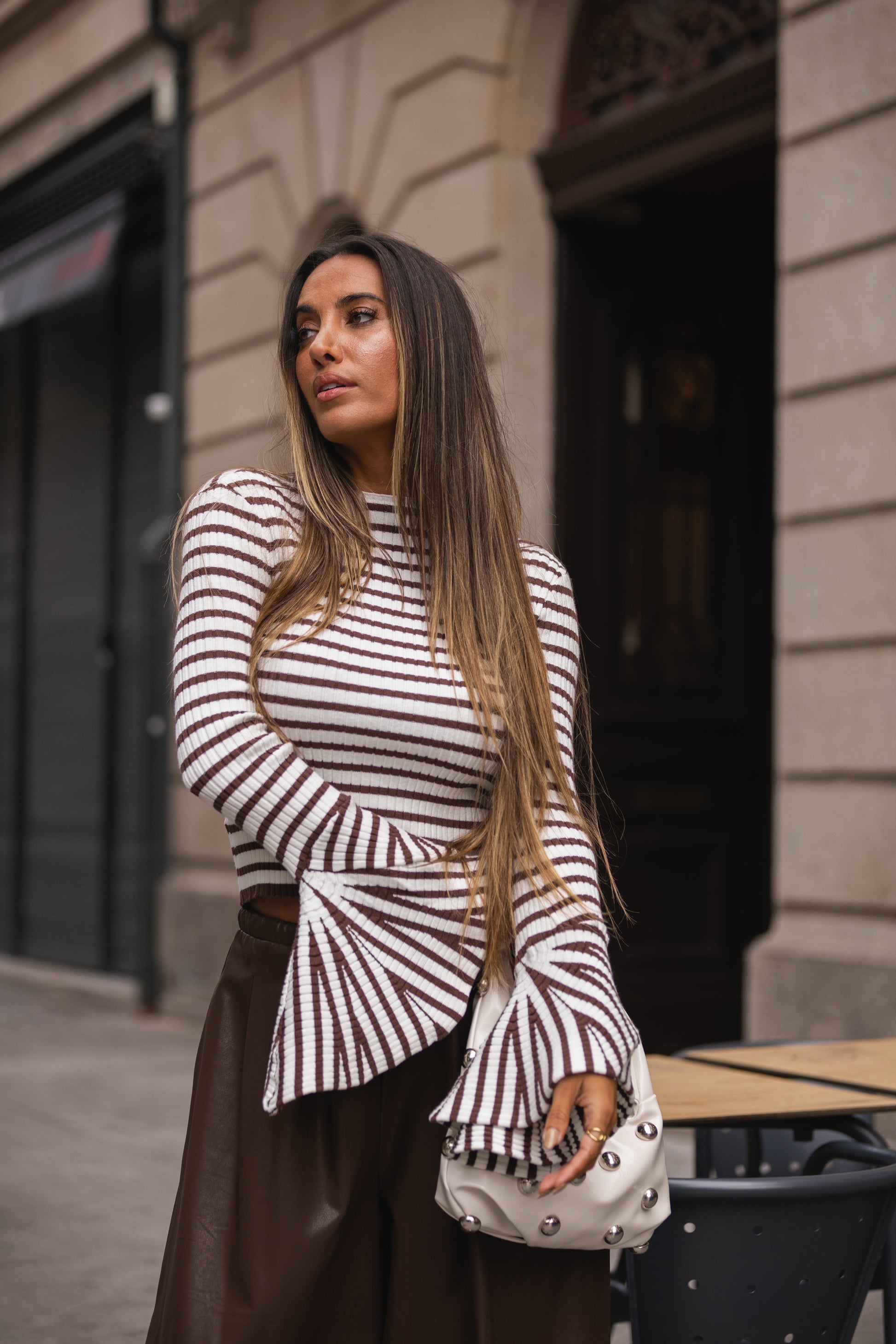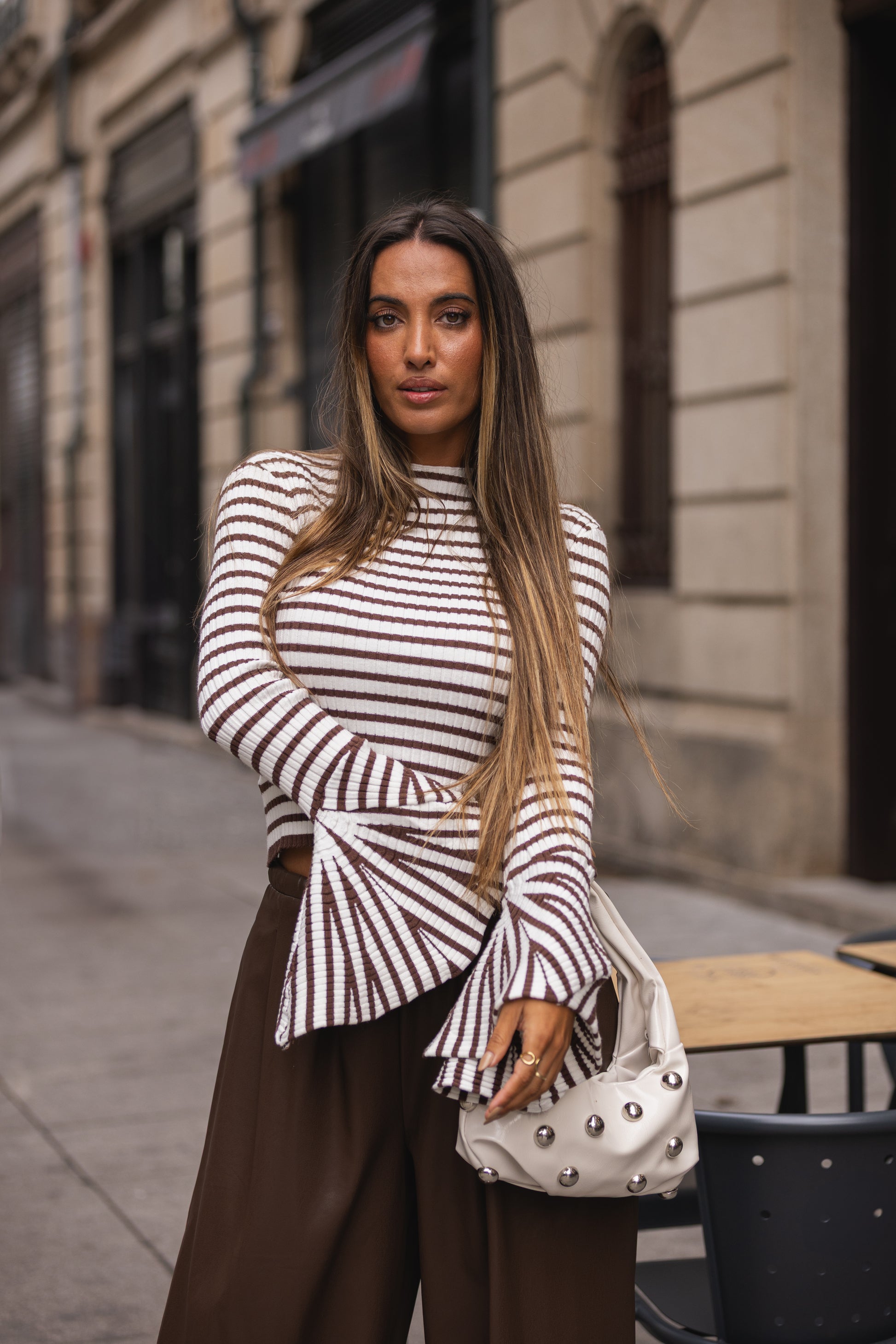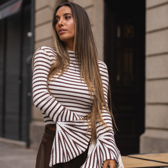 Esta camisola de malha justa é a definição de conforto e estilo descontraído. Com um padrão de riscas, ela traz um visual moderno e versátil, ideal para compor looks casuais.