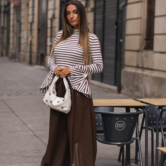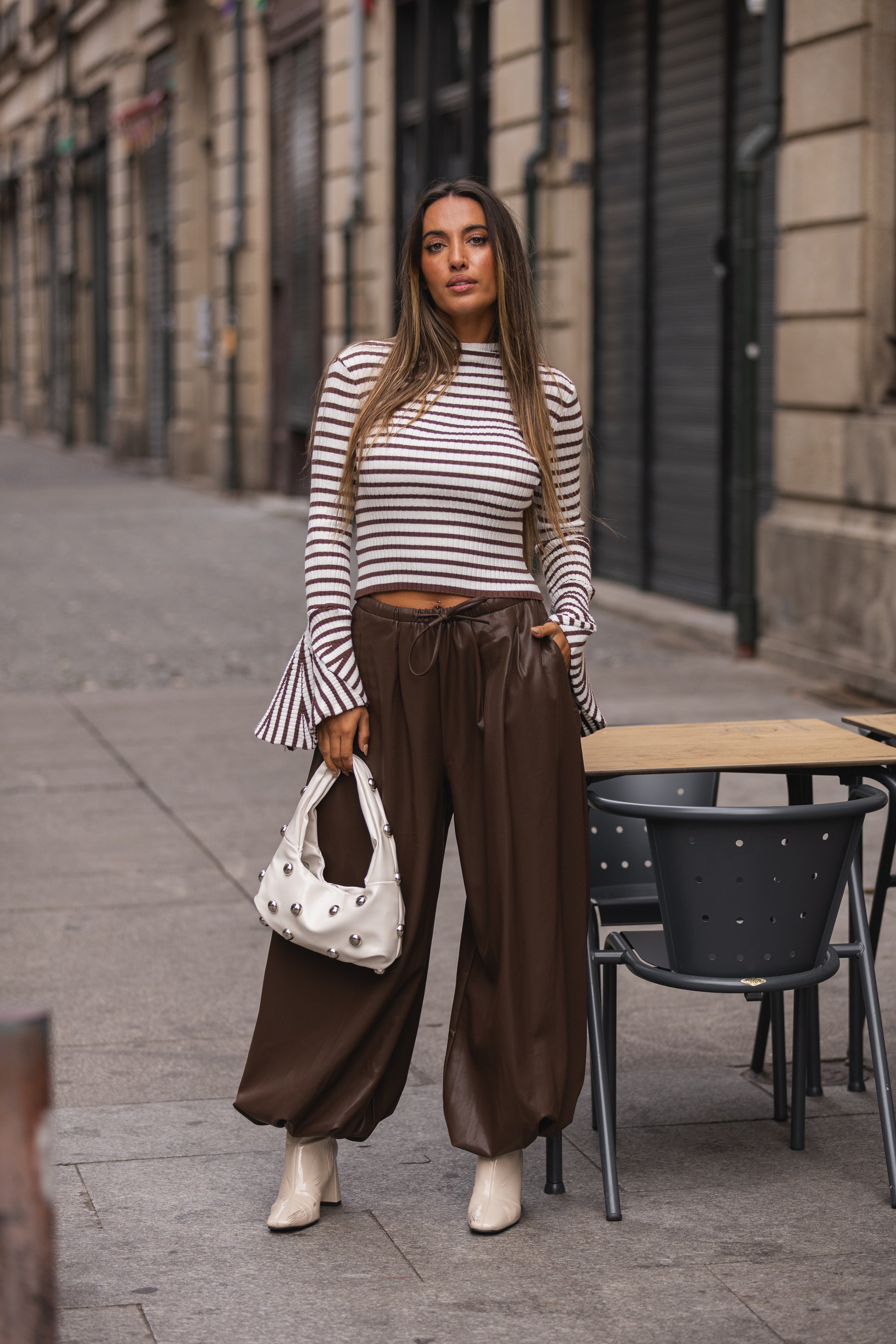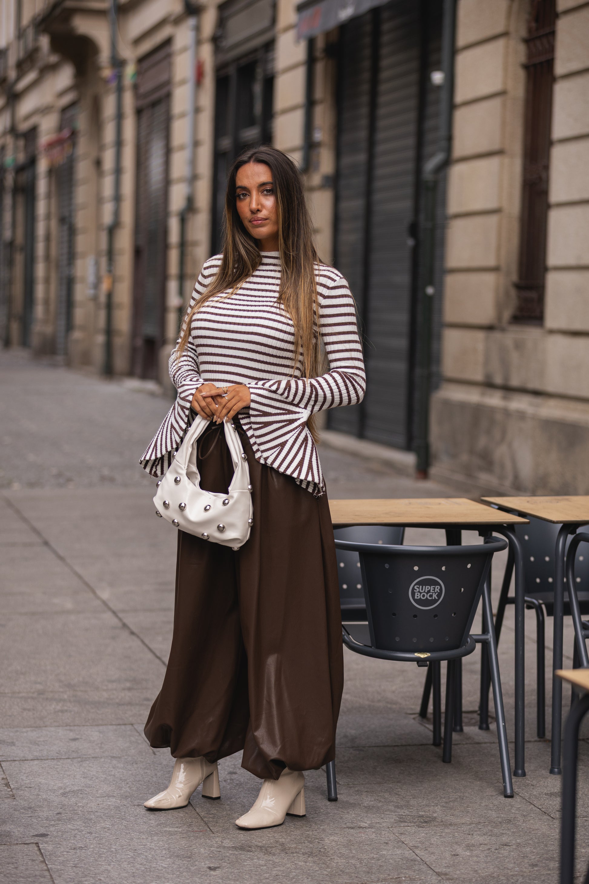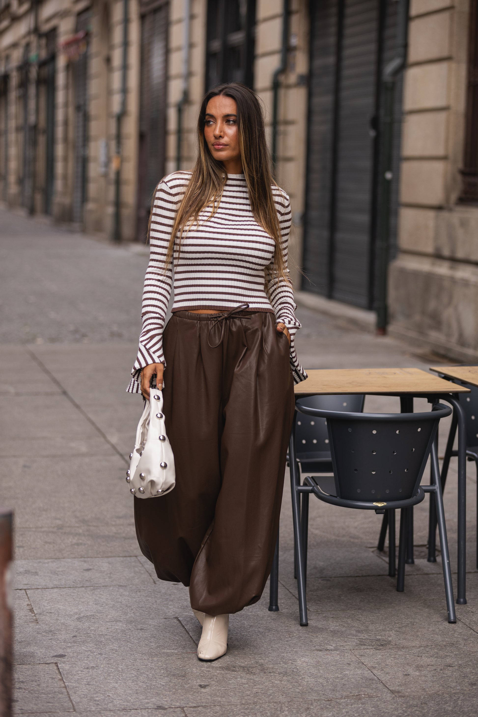 Esta camisola de malha justa é a definição de conforto e estilo descontraído. Com um padrão de riscas, ela traz um visual moderno e versátil, ideal para compor looks casuais.