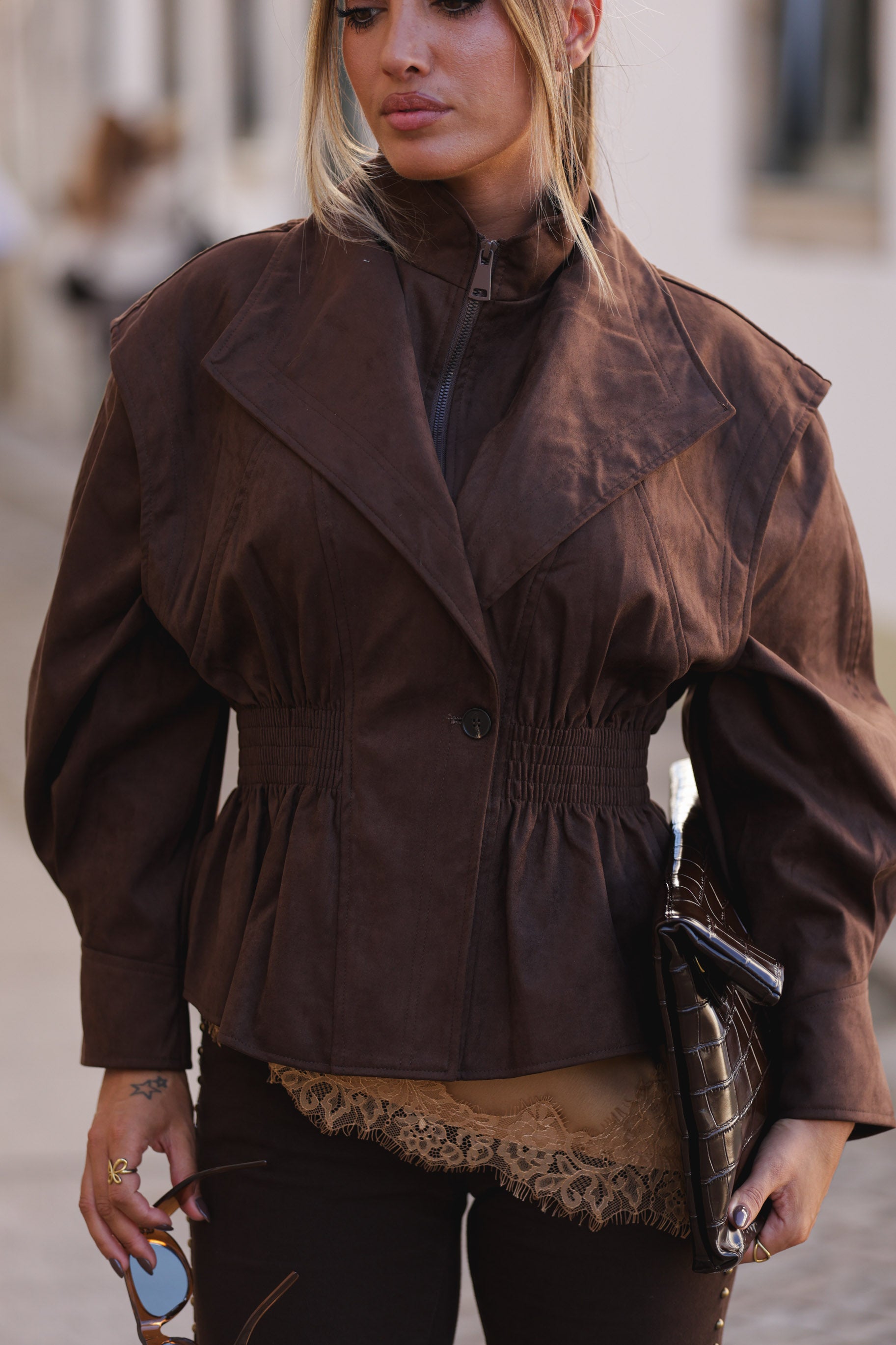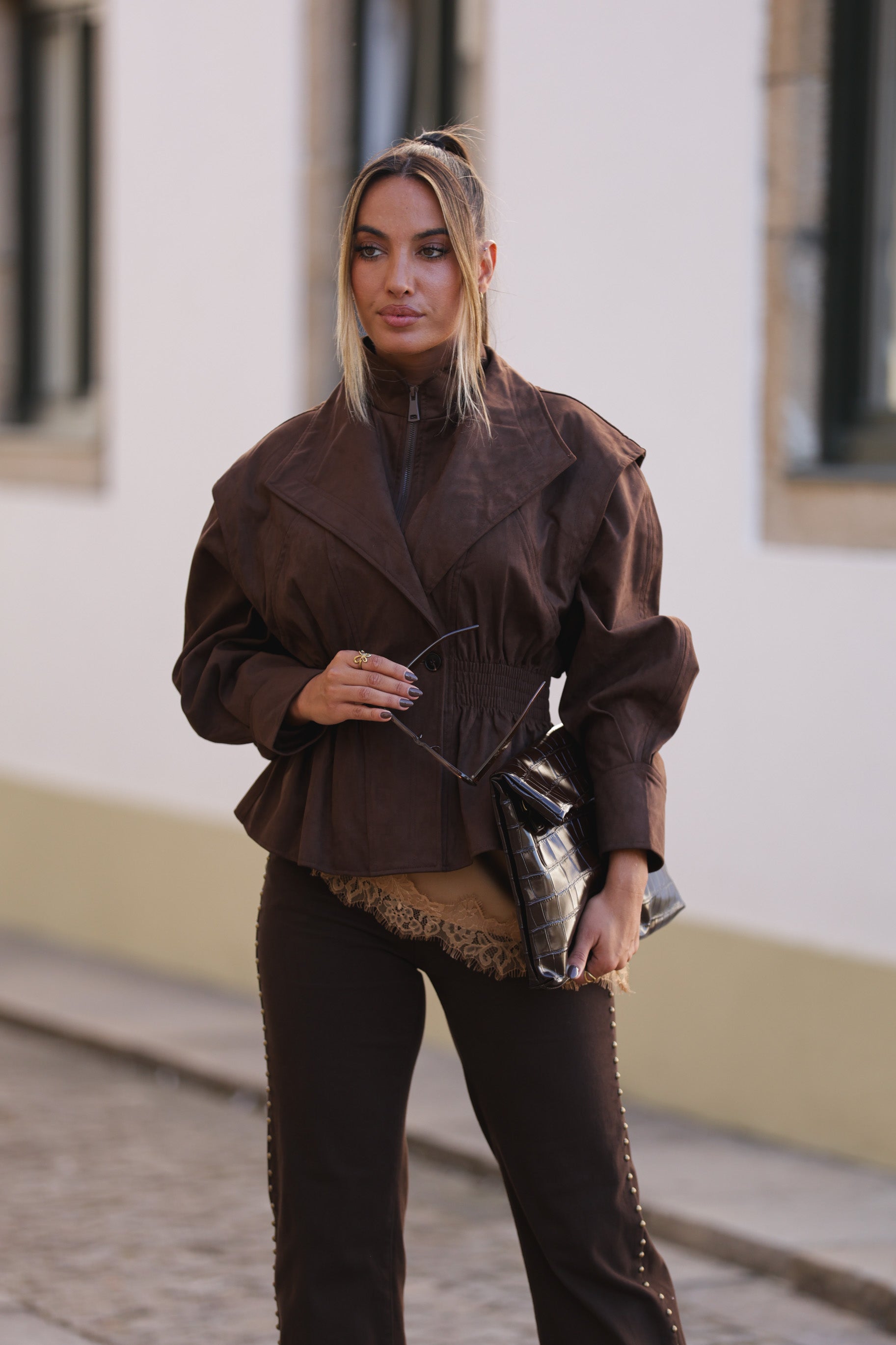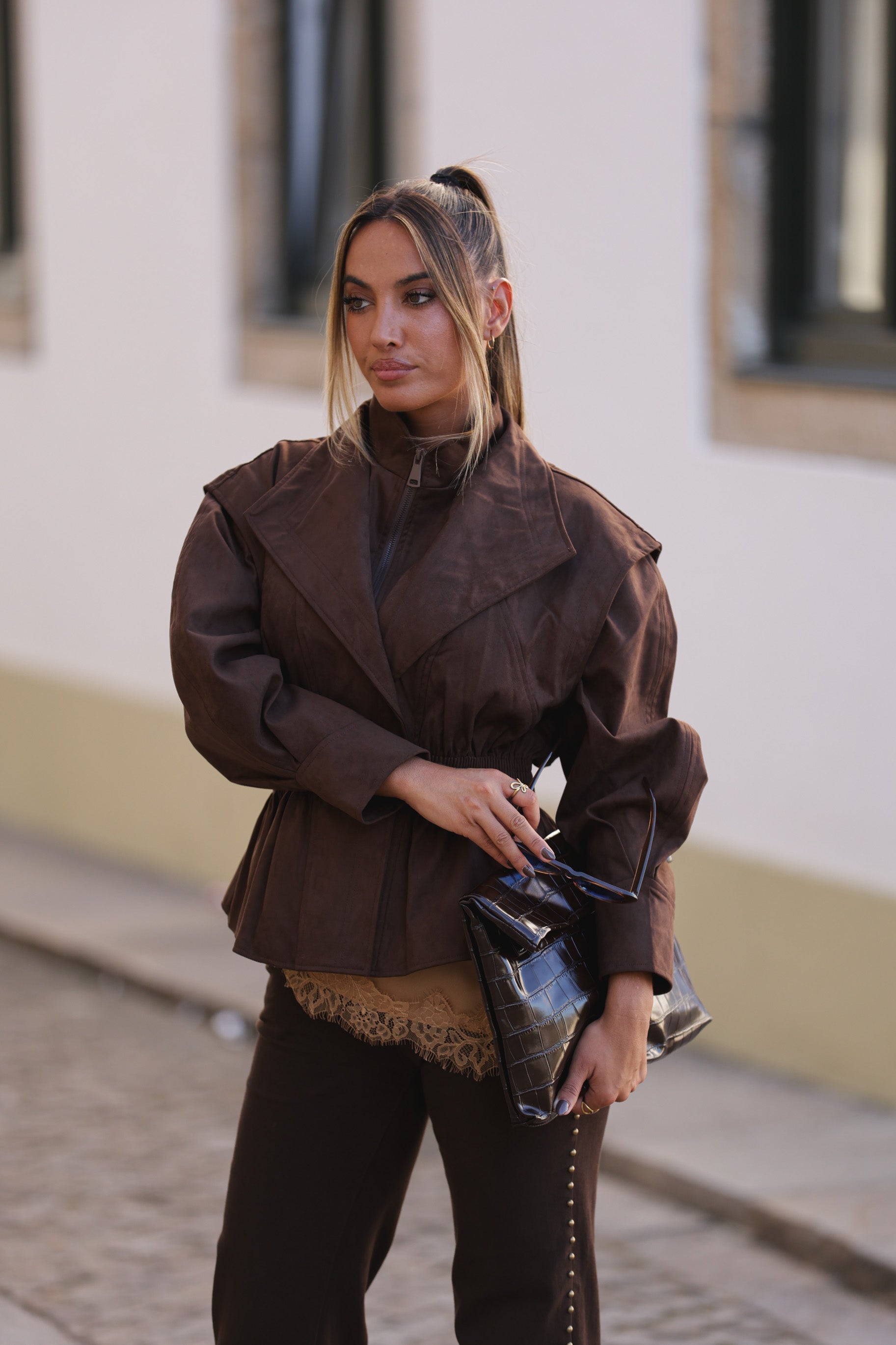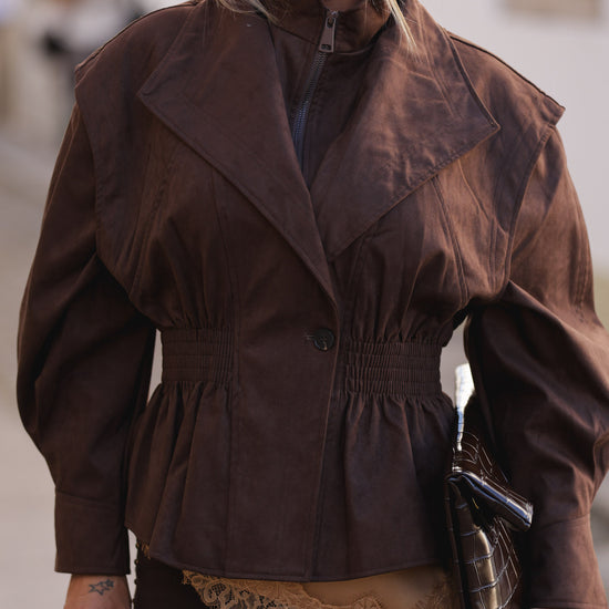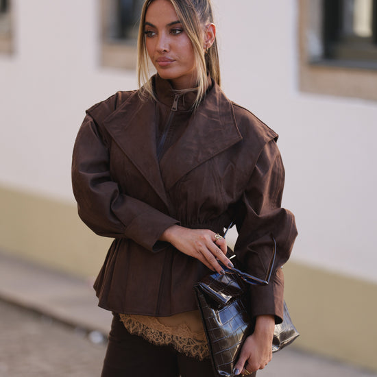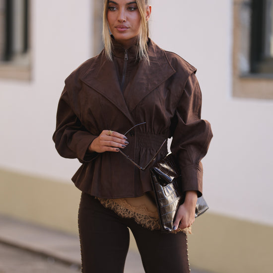 Casaco pele de pessego cintado - castanho