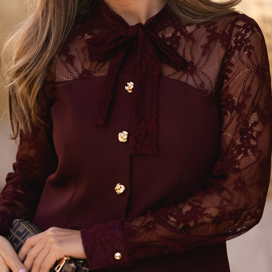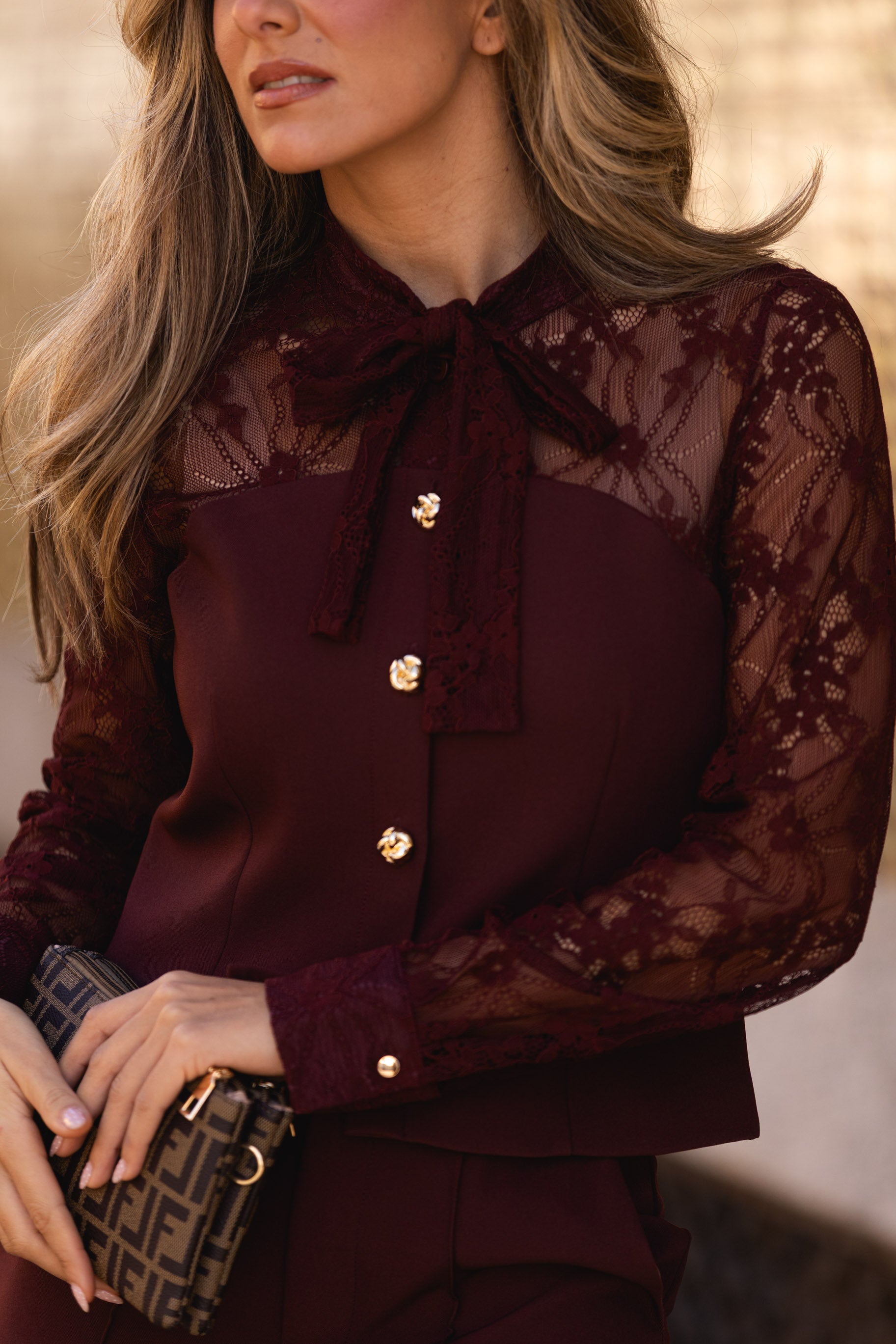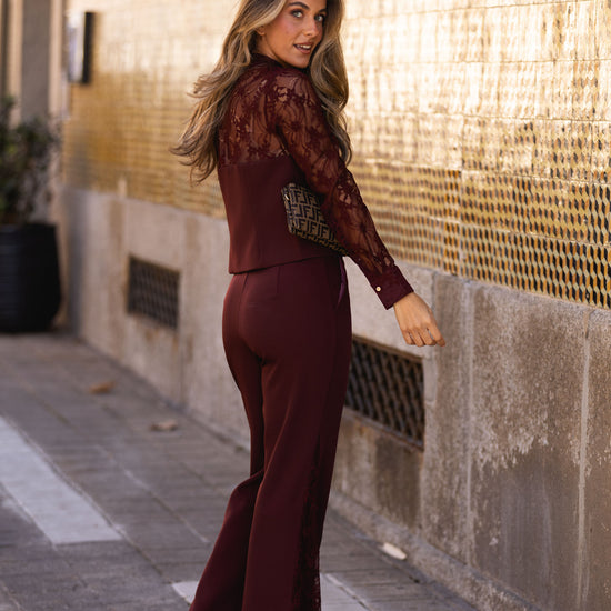 Conjunto composto por calça e camisa, com botões dourados e pormenores em renda.