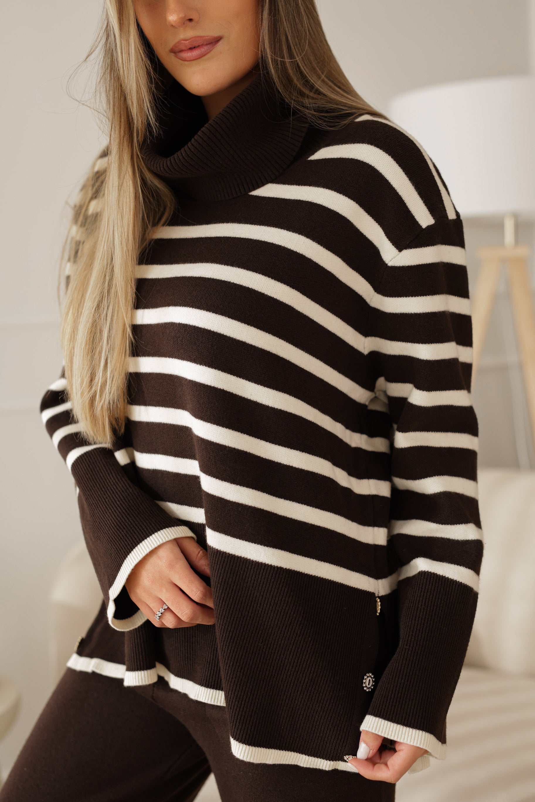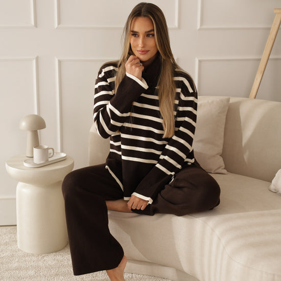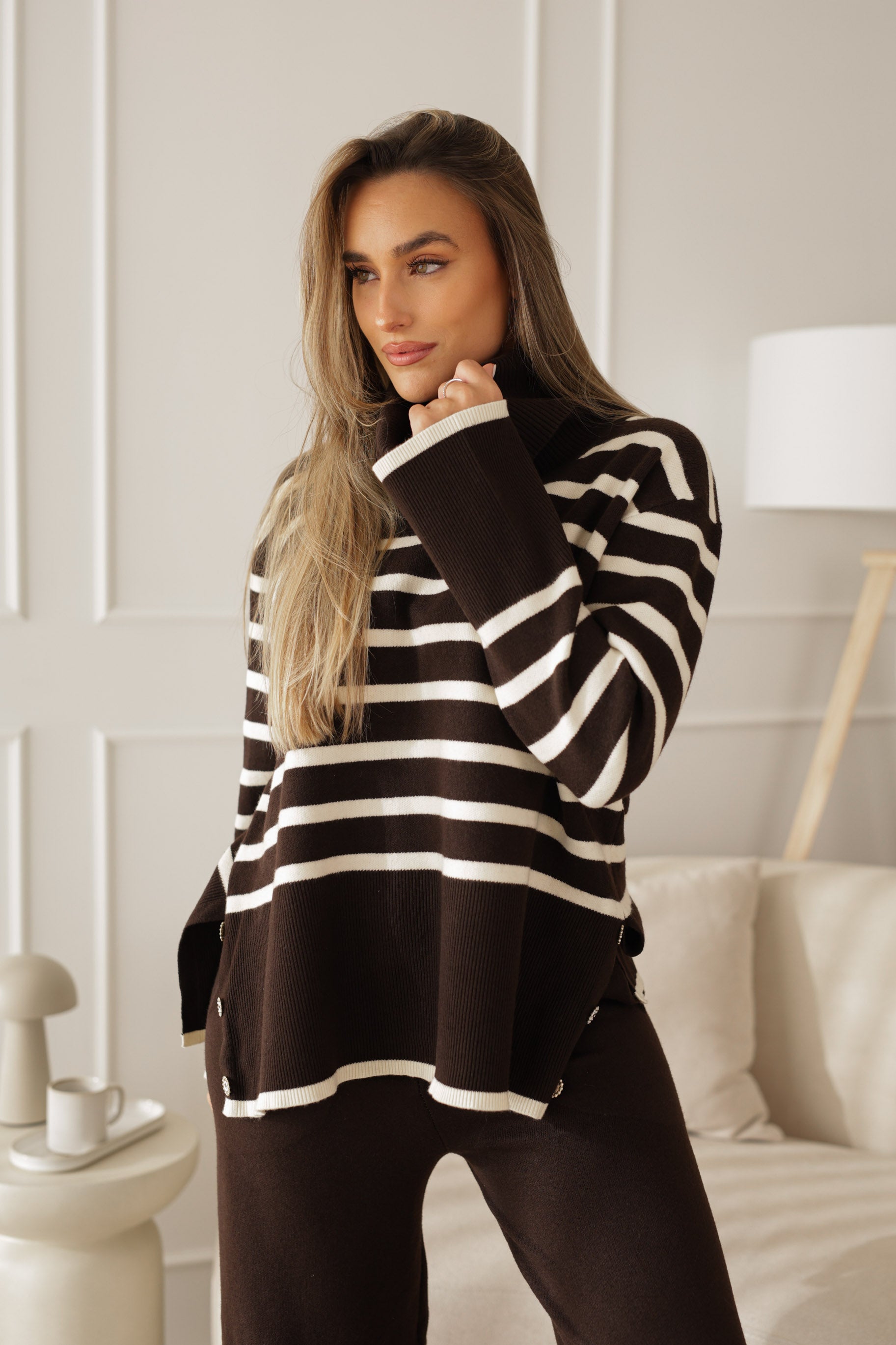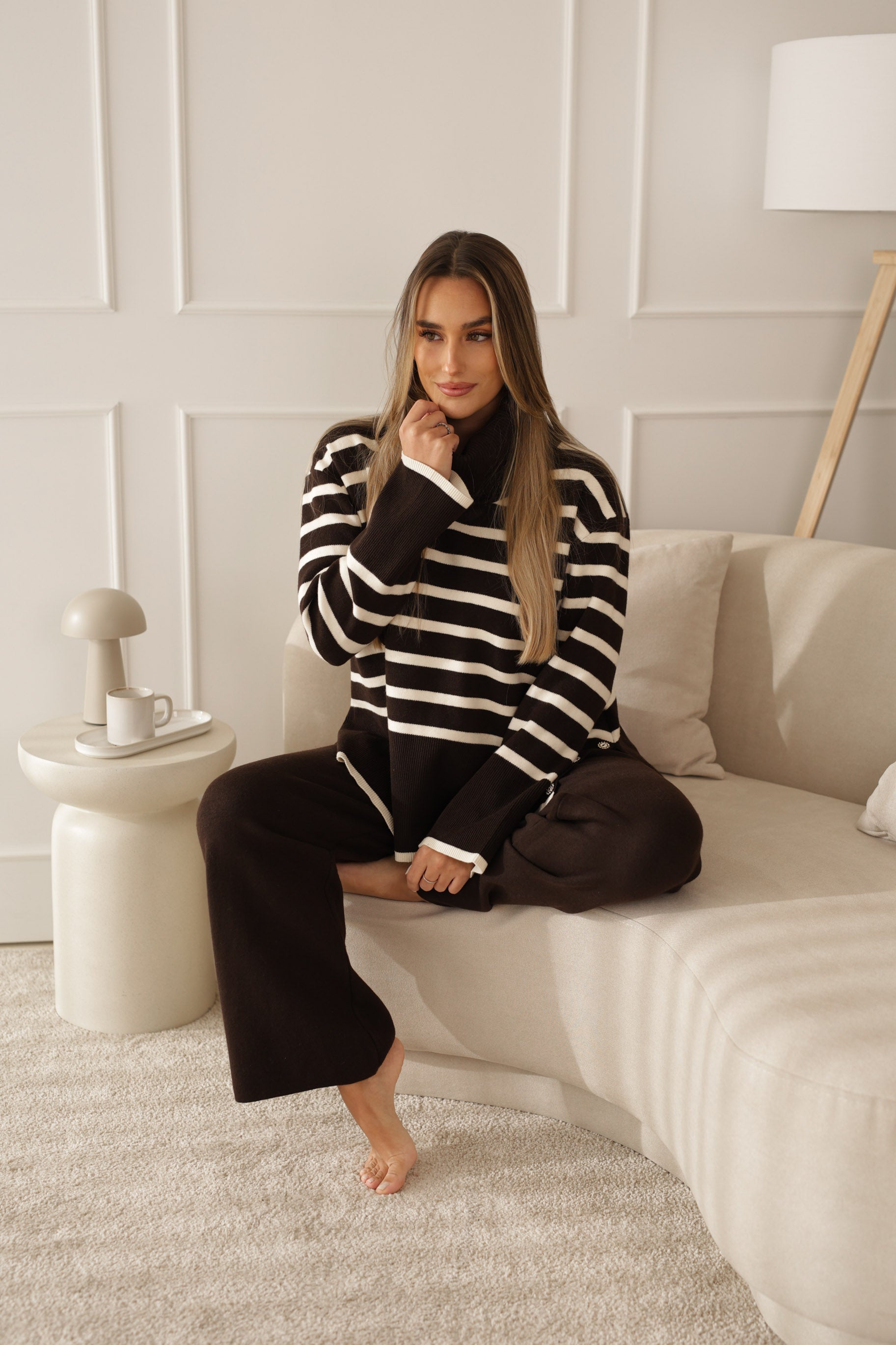 Conjunto de calça e camisola em malha compacta. A camisola com gola larga e é soltinha por todo, o conjunto é tamanho único e serve bem até L.