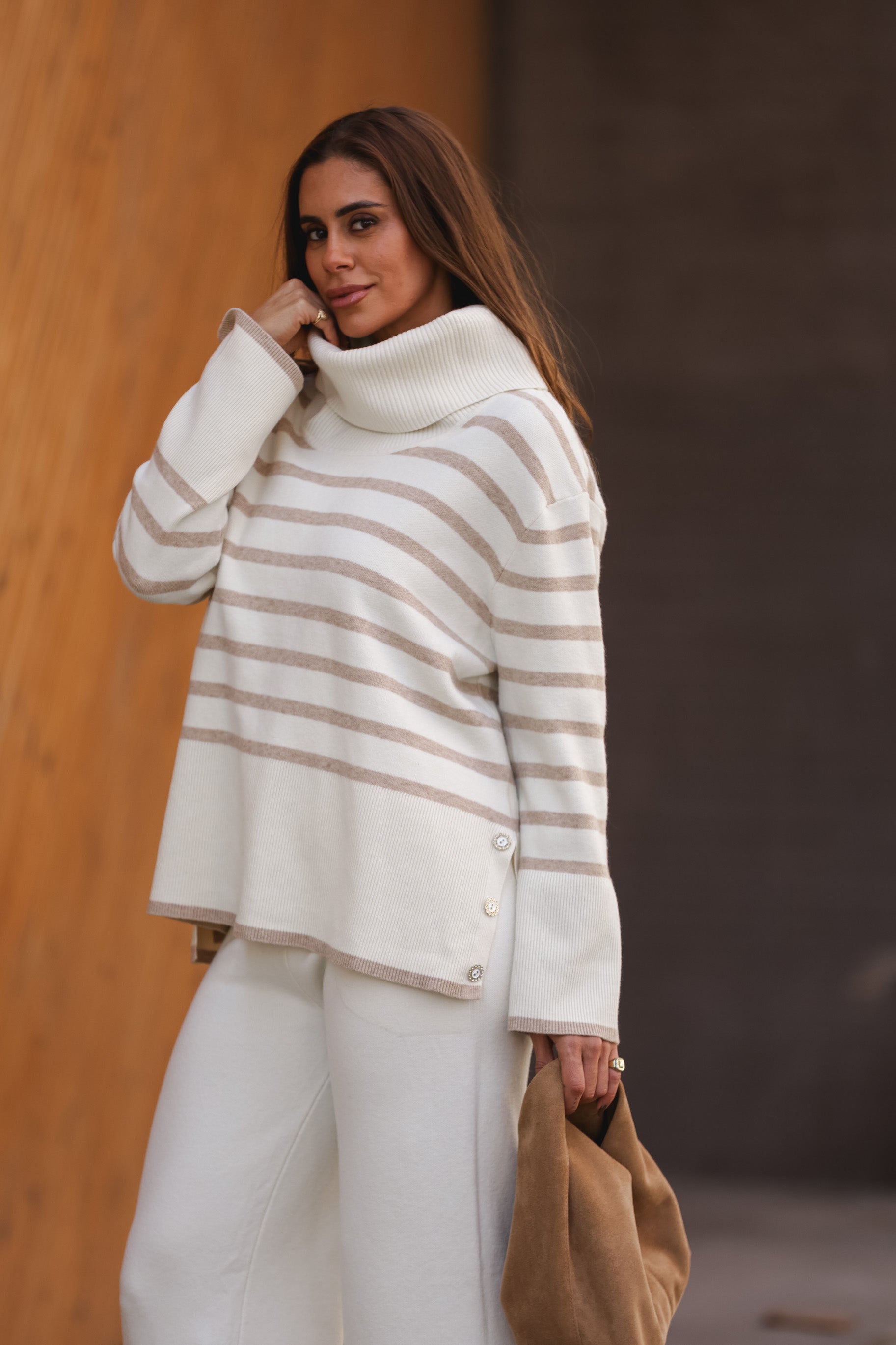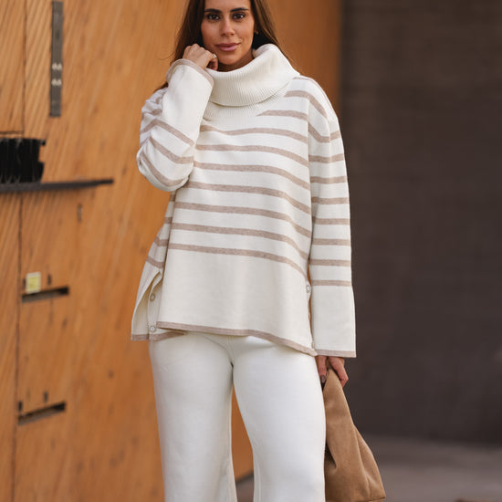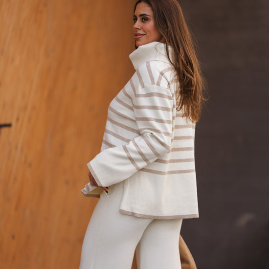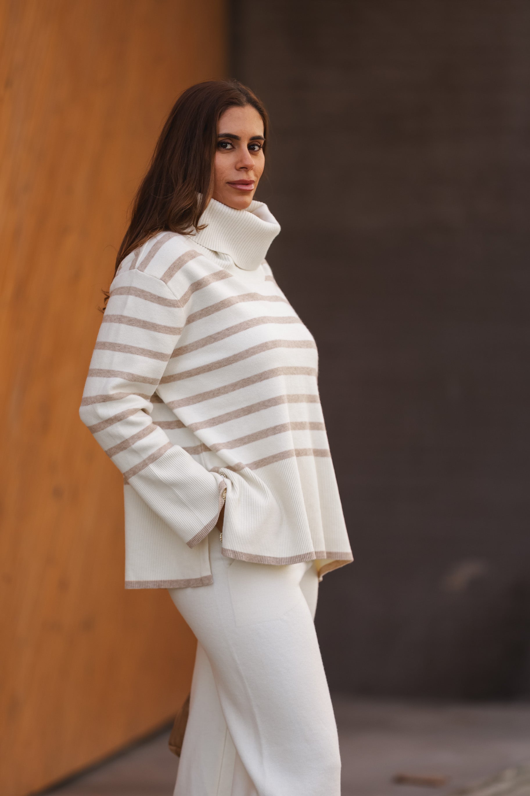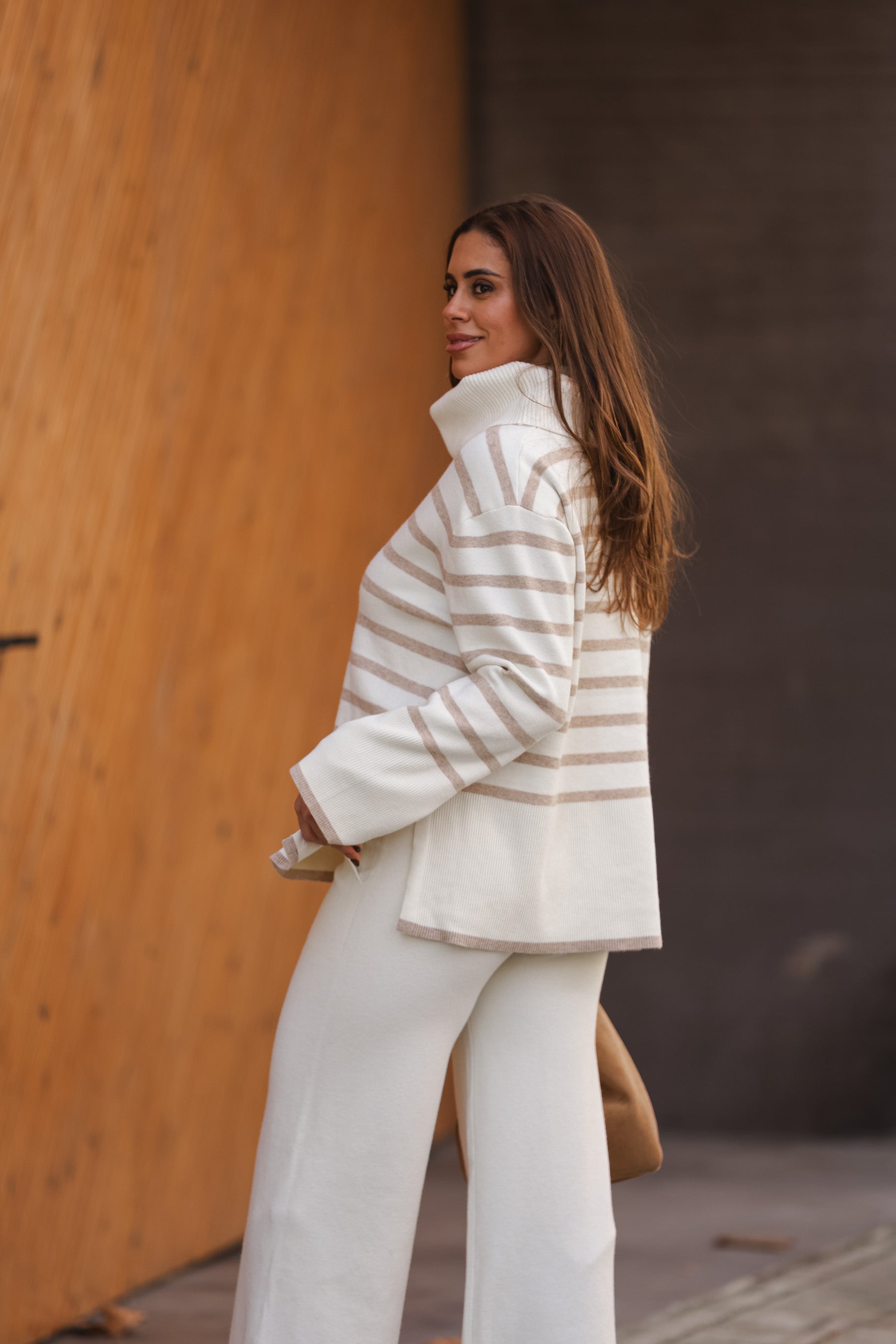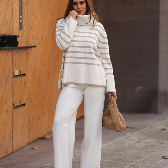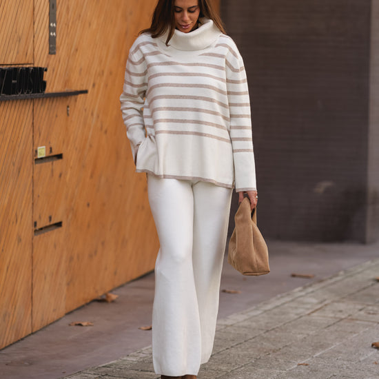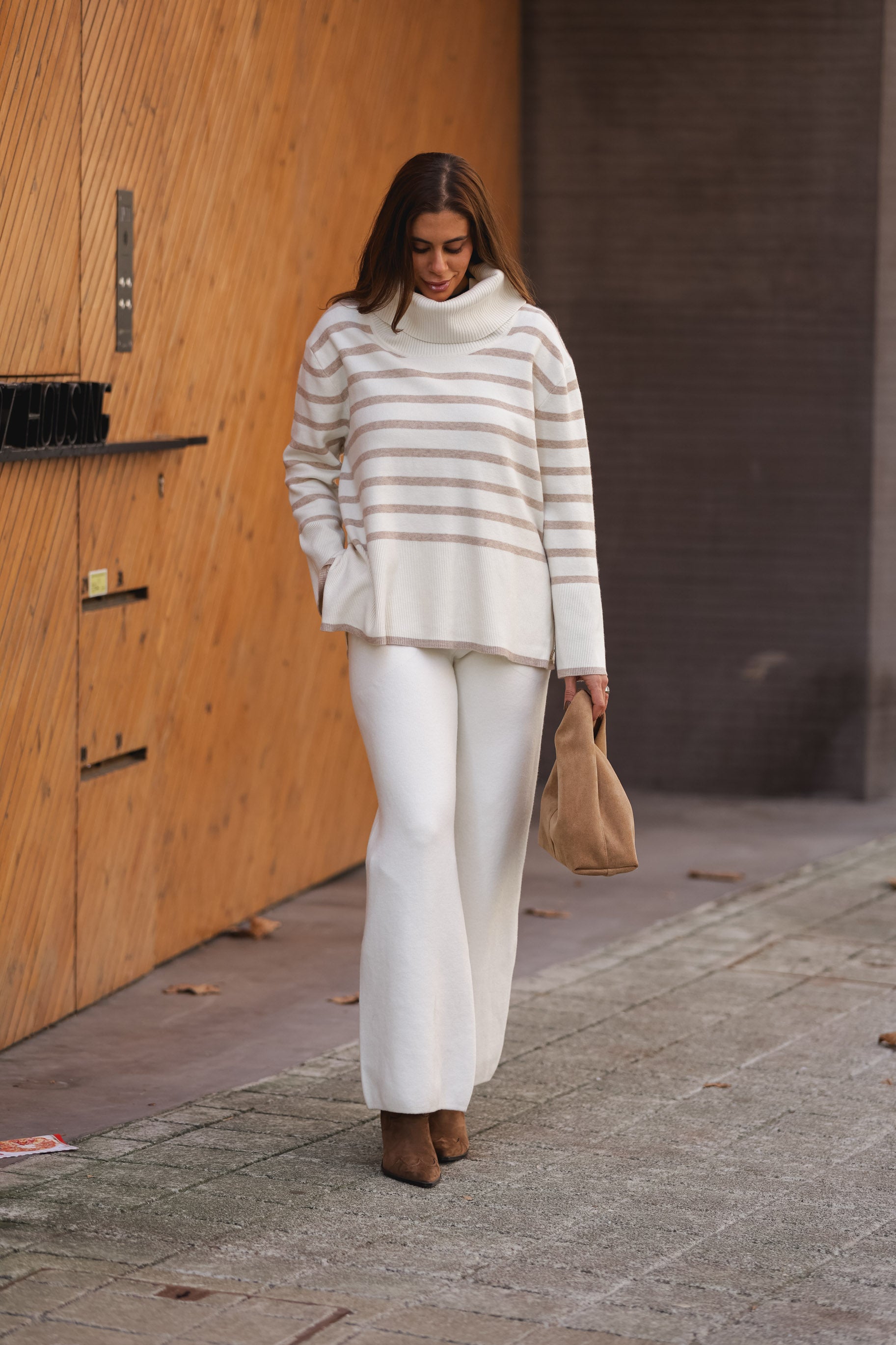 Conjunto de calça e camisola em malha compacta. A camisola com gola larga e é soltinha por todo, o conjunto é tamanho único e serve bem até L.