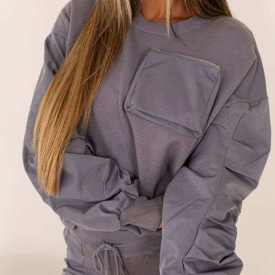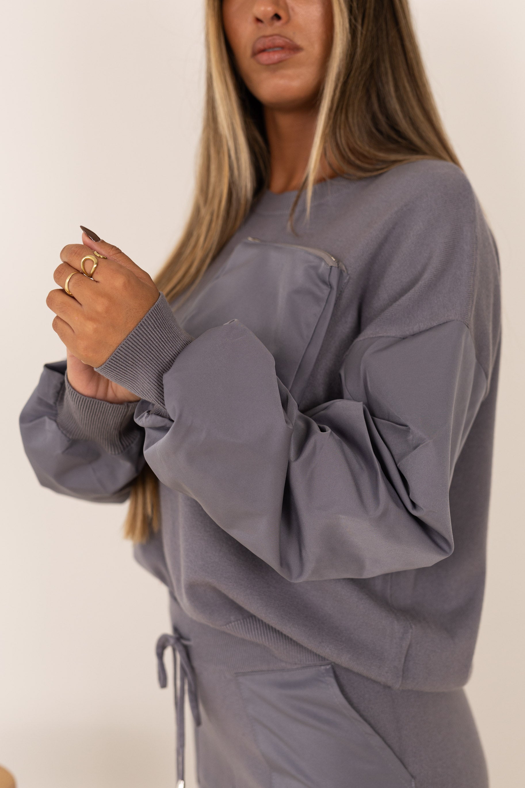 Conjunto de calça e camisola em malha compacta. Tanto a camisola como a calça têm pormenor de bolso impermeável. A modelo está com o S/M .