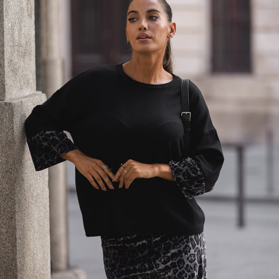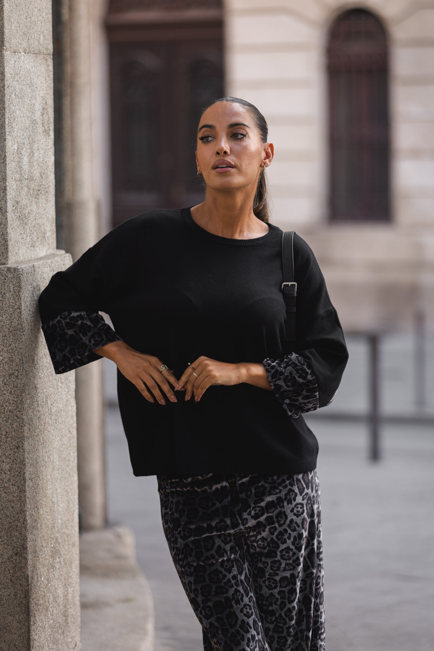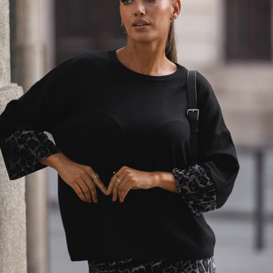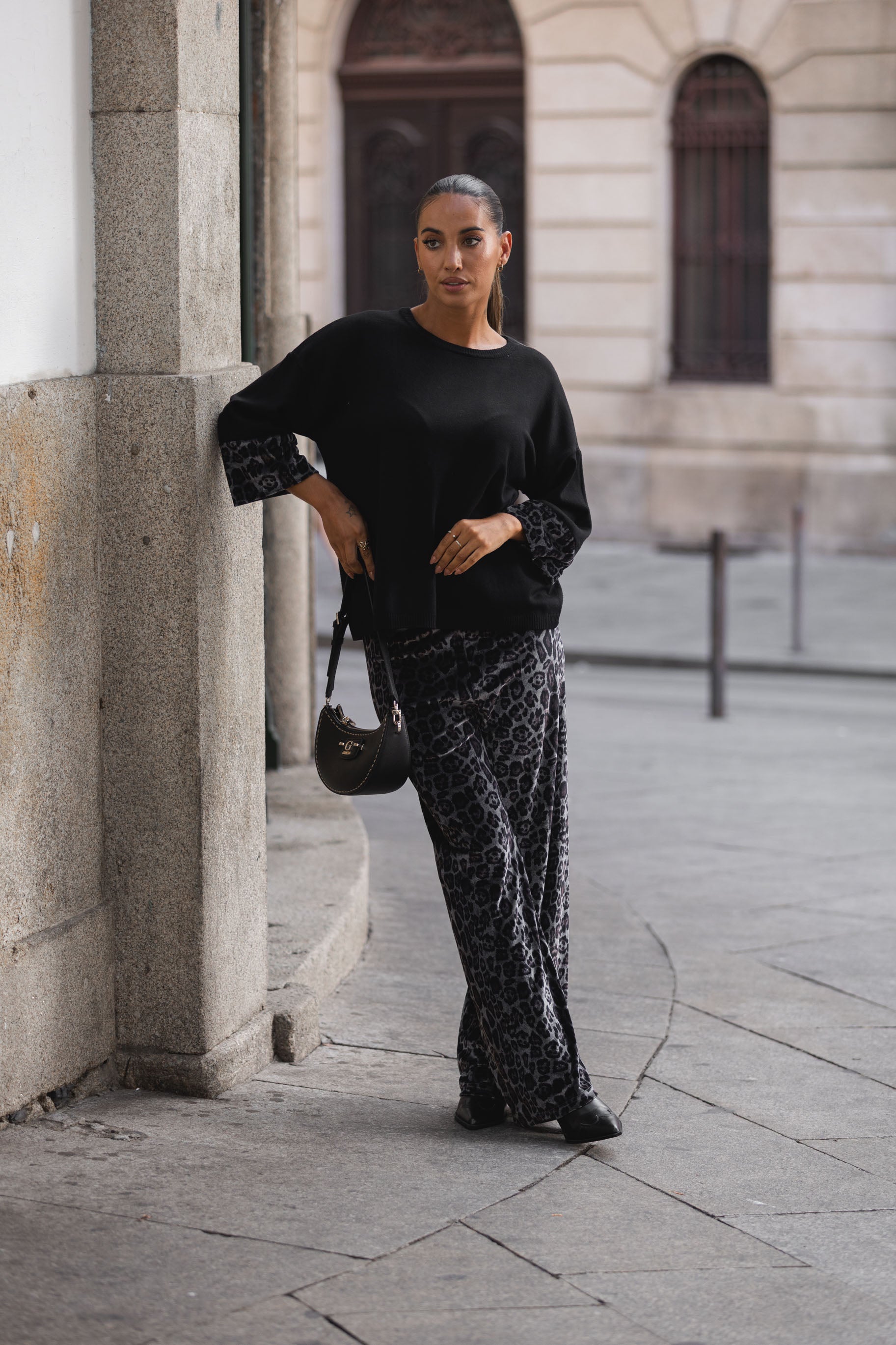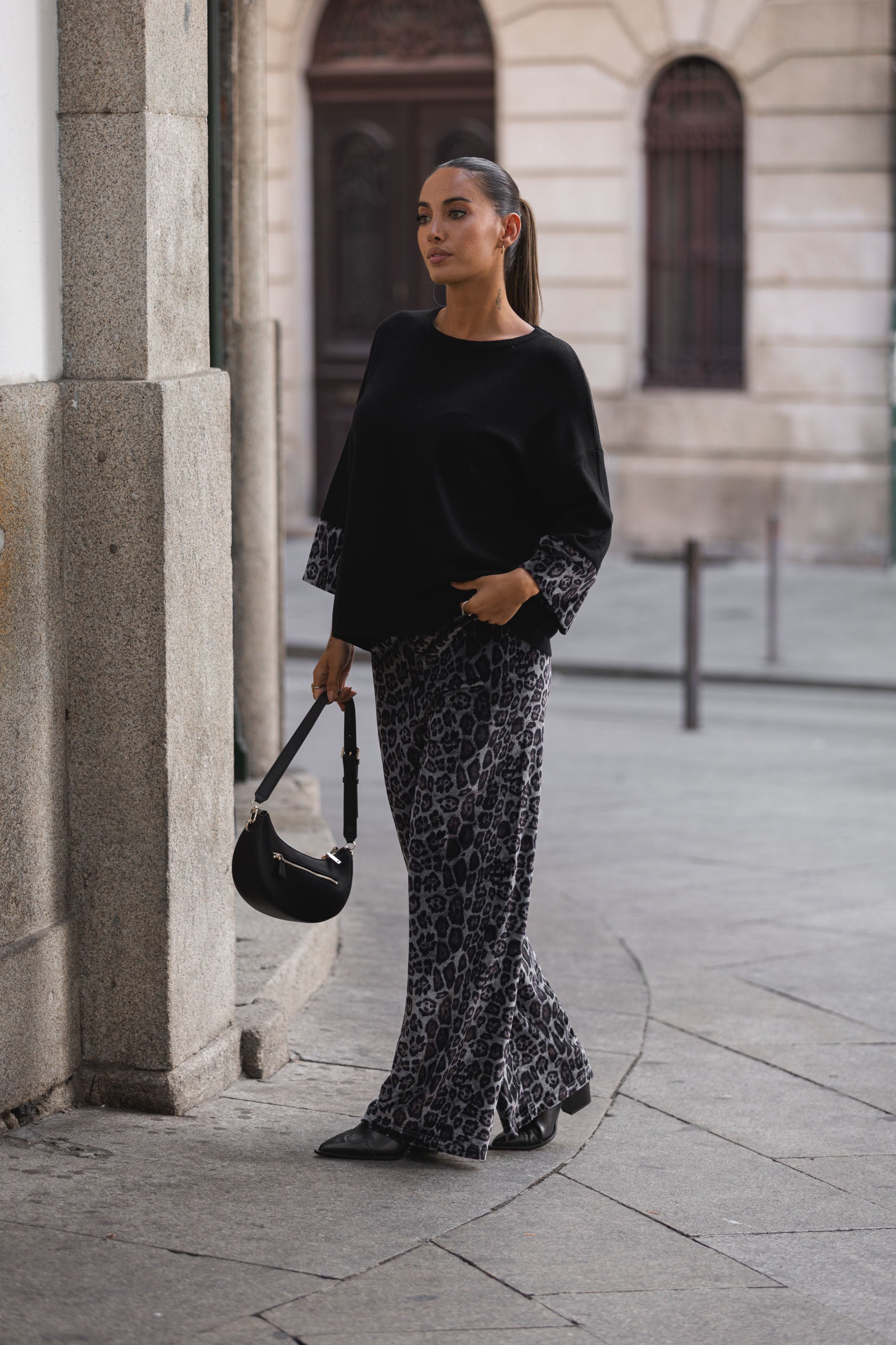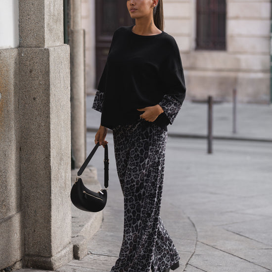 Conjunto composto por calça e camisola em malha compacta.