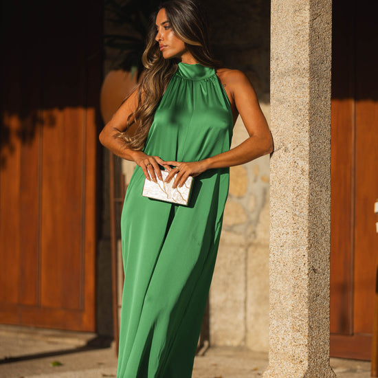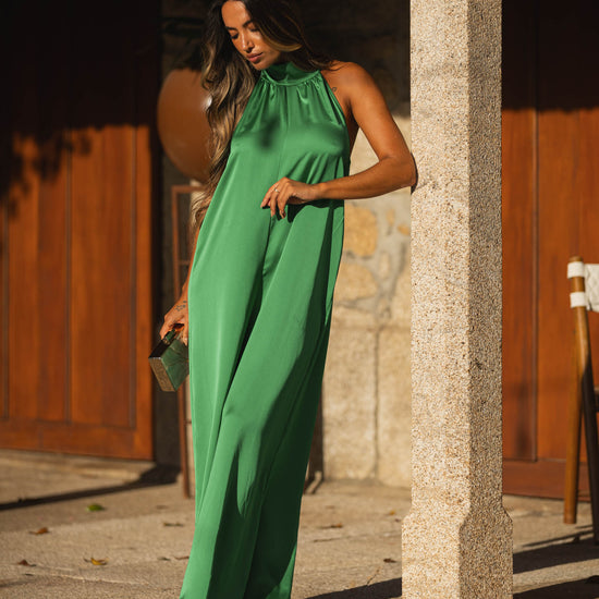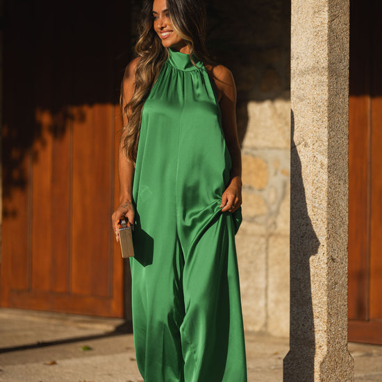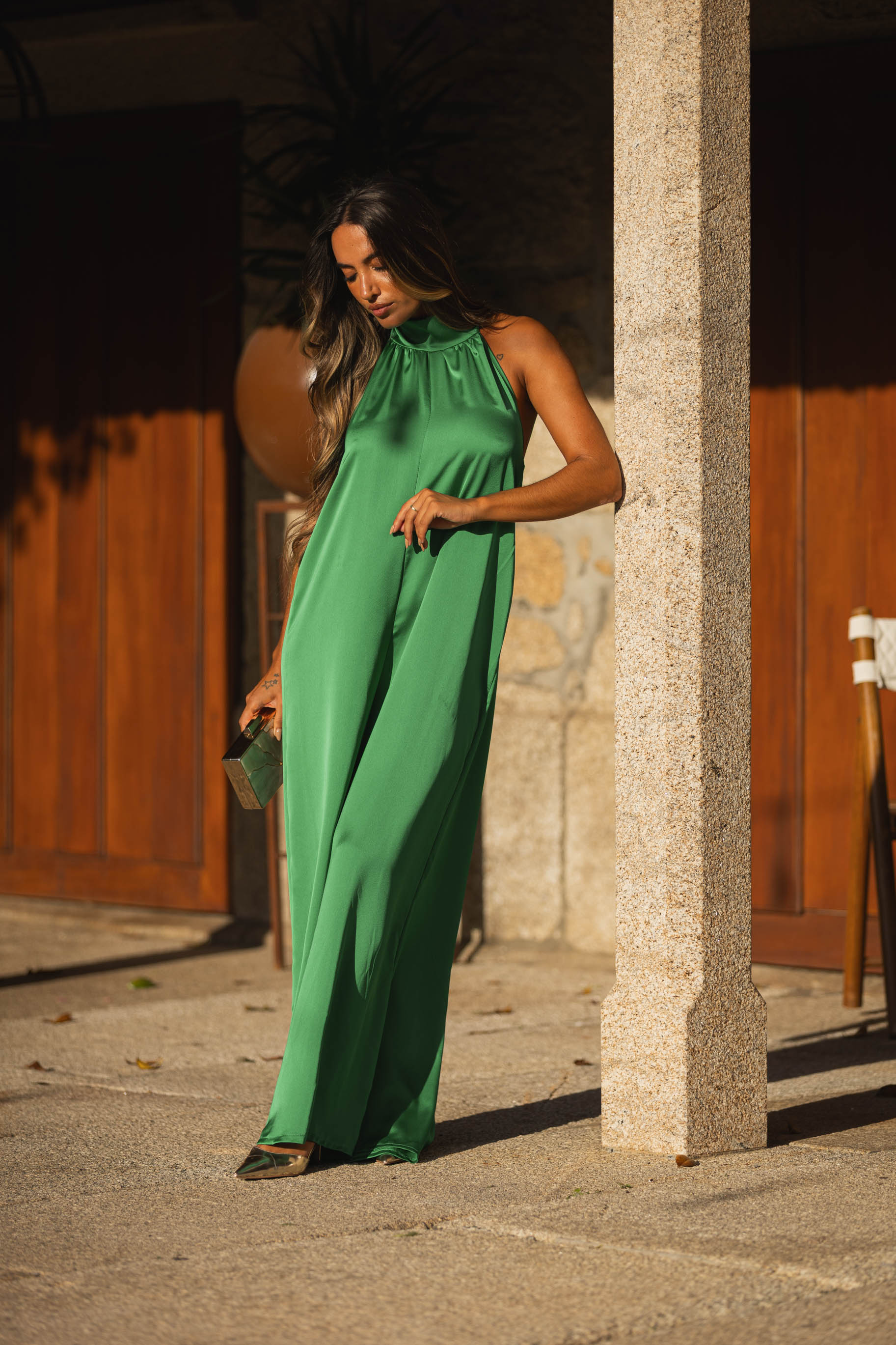 Jumpsuit em cetim, de amarrar ao pescoço, com elástico nas costas.