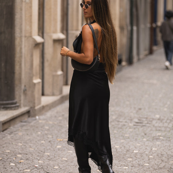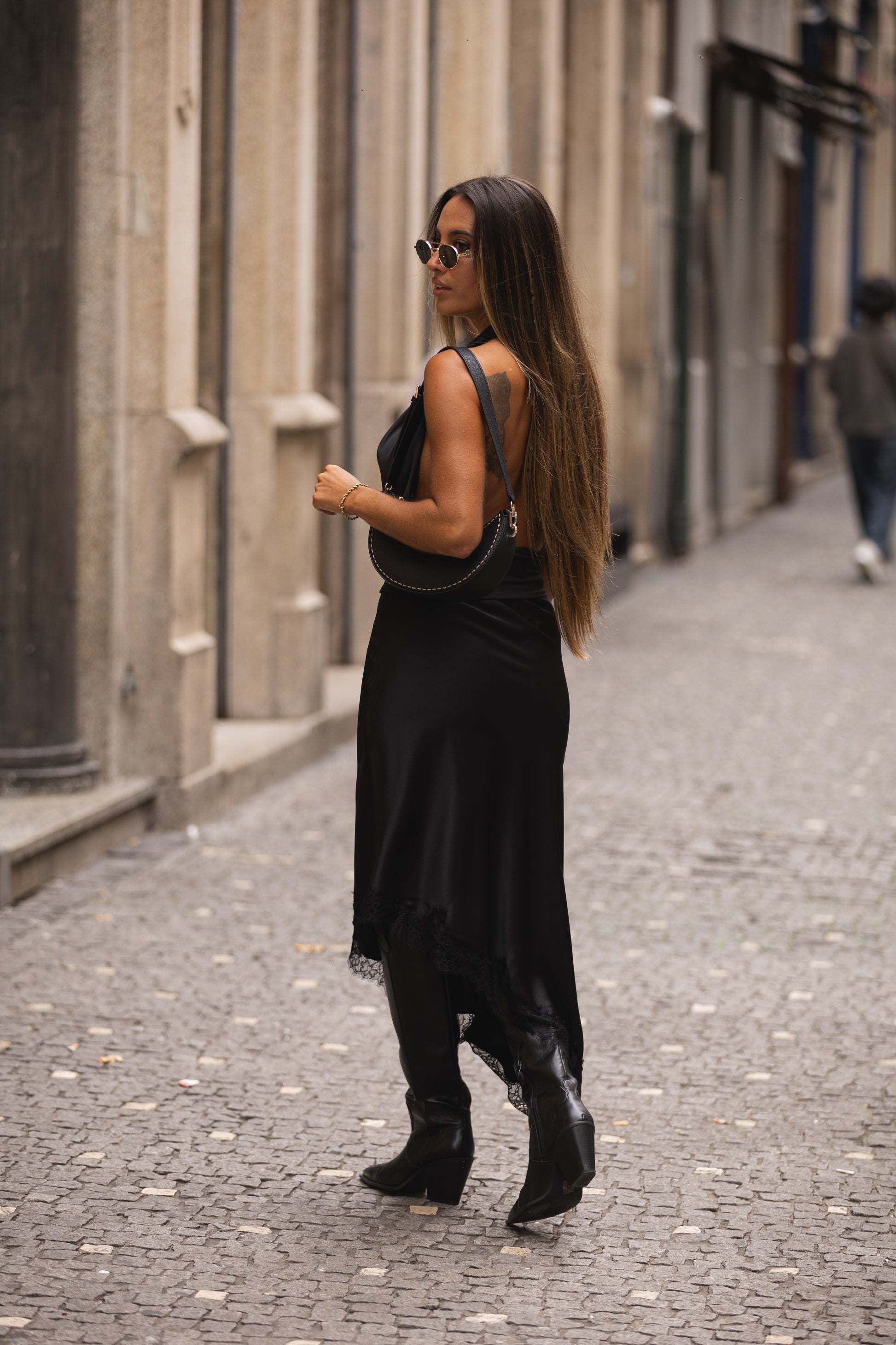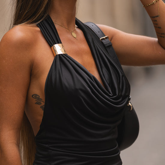 A modelo está com o S. Top com elástico e com as costas à mostra.