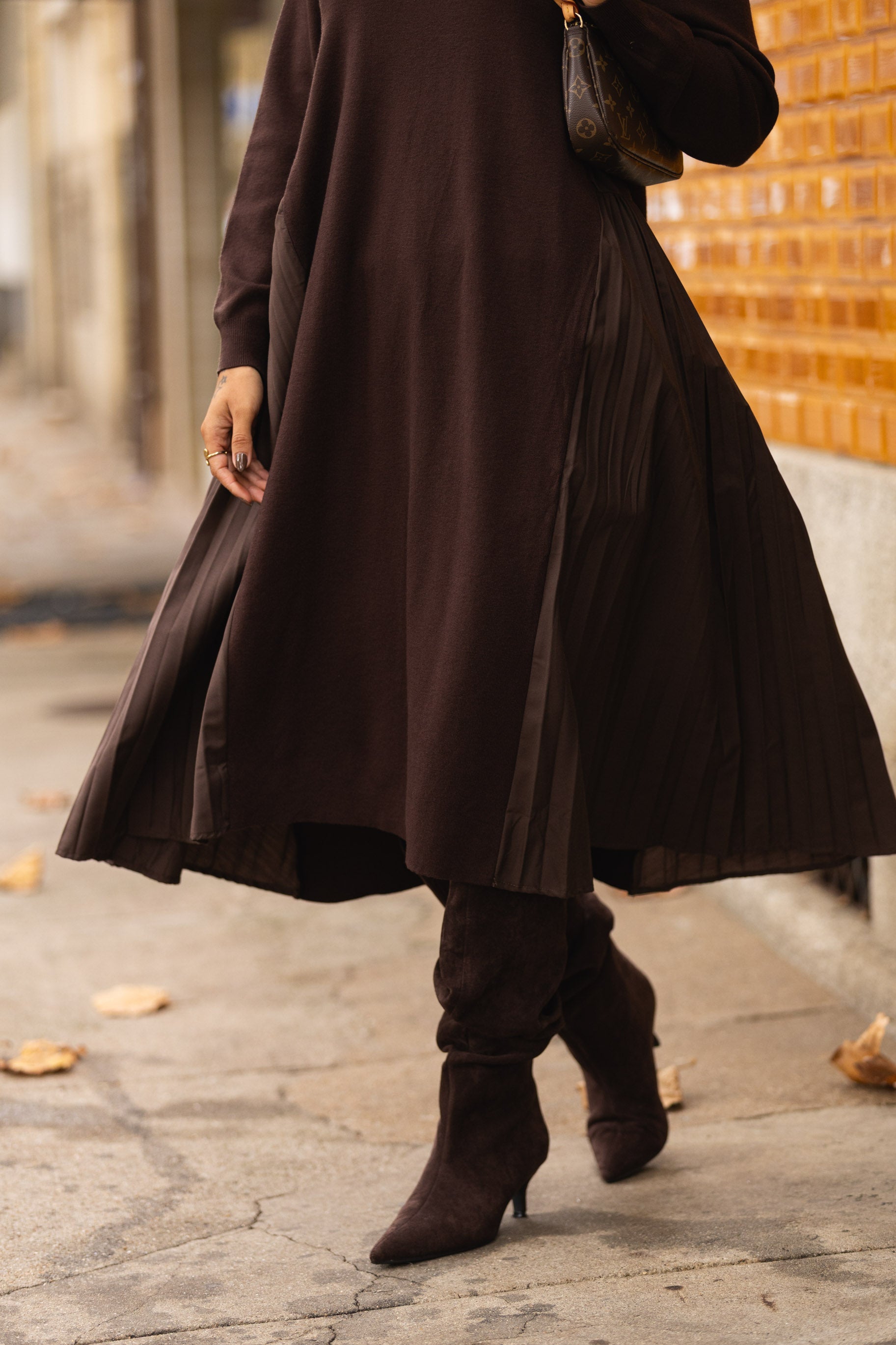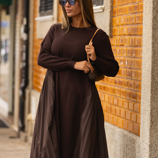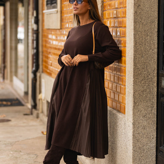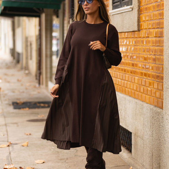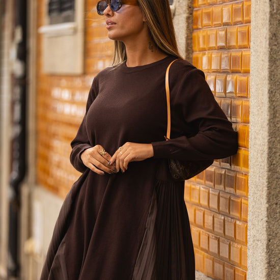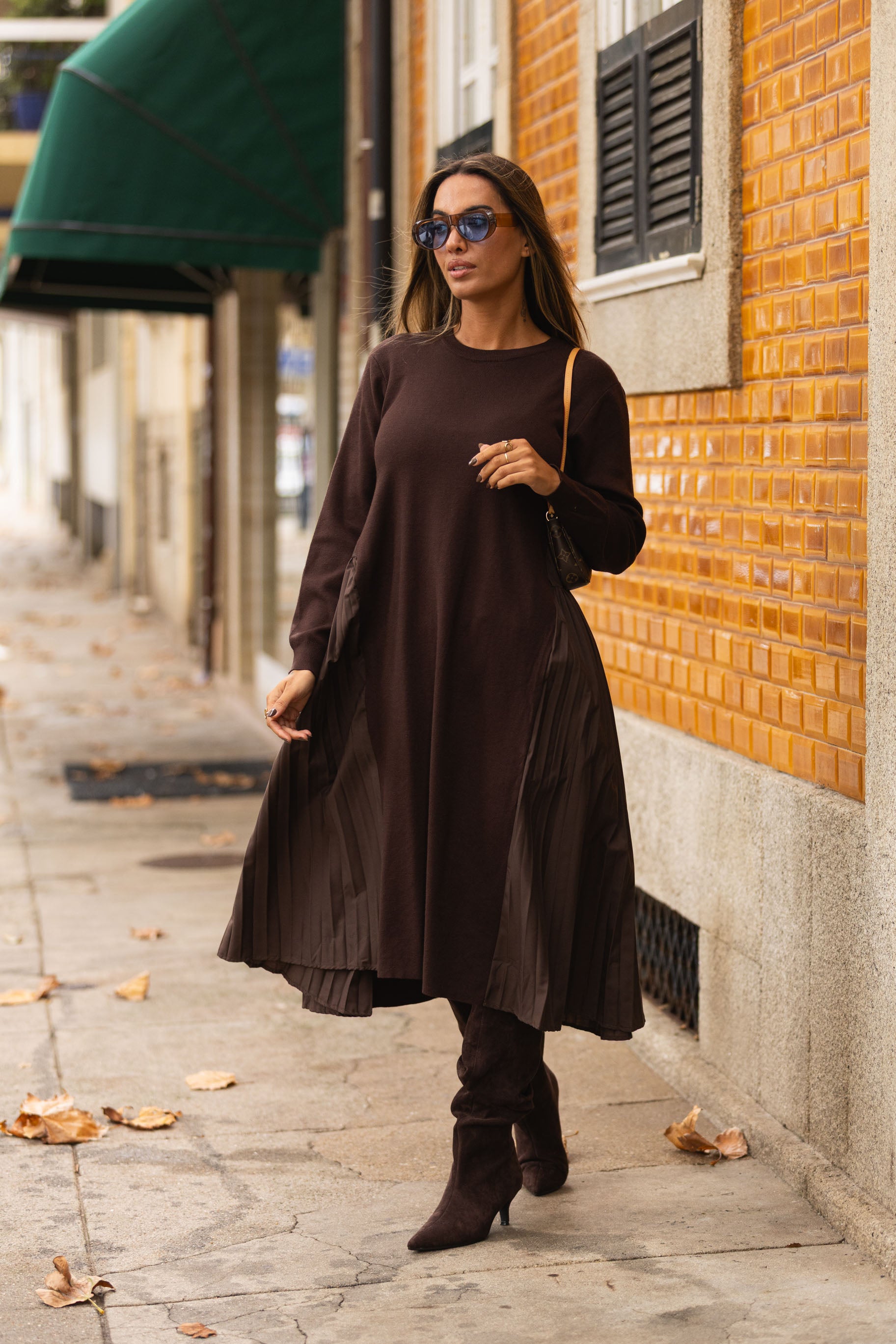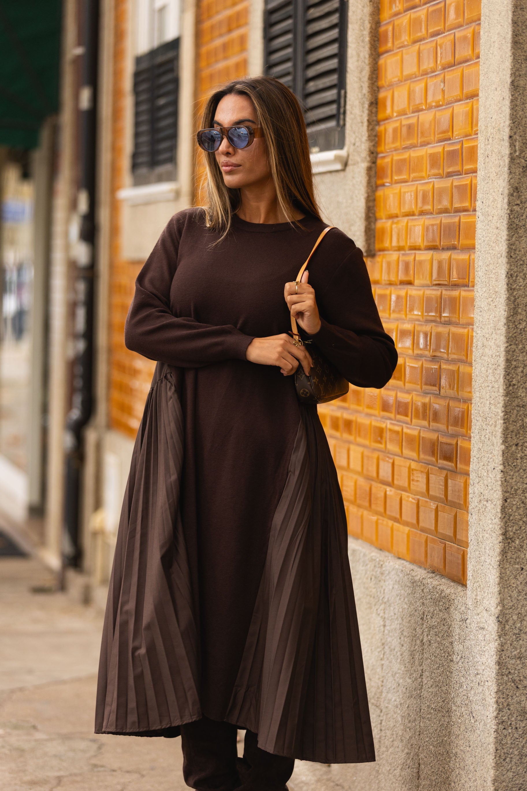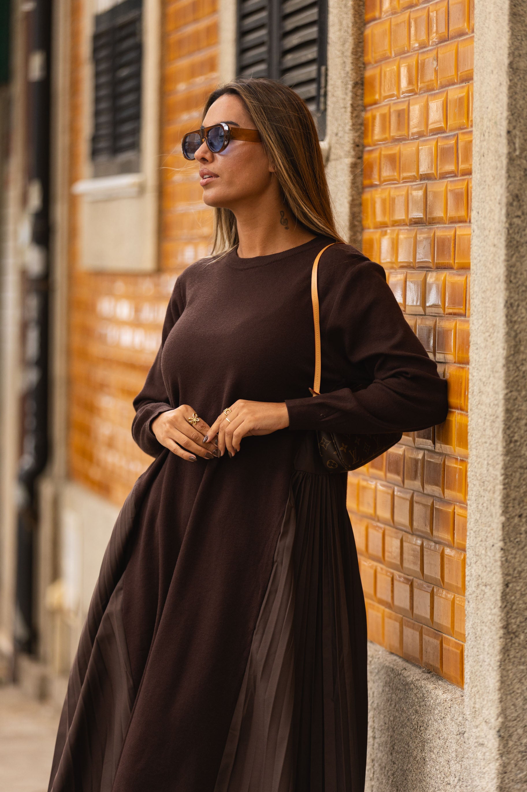 Vestido em malha estilizado, com pelissado lateral. Veste larguinho, a modelo está com o S/M.