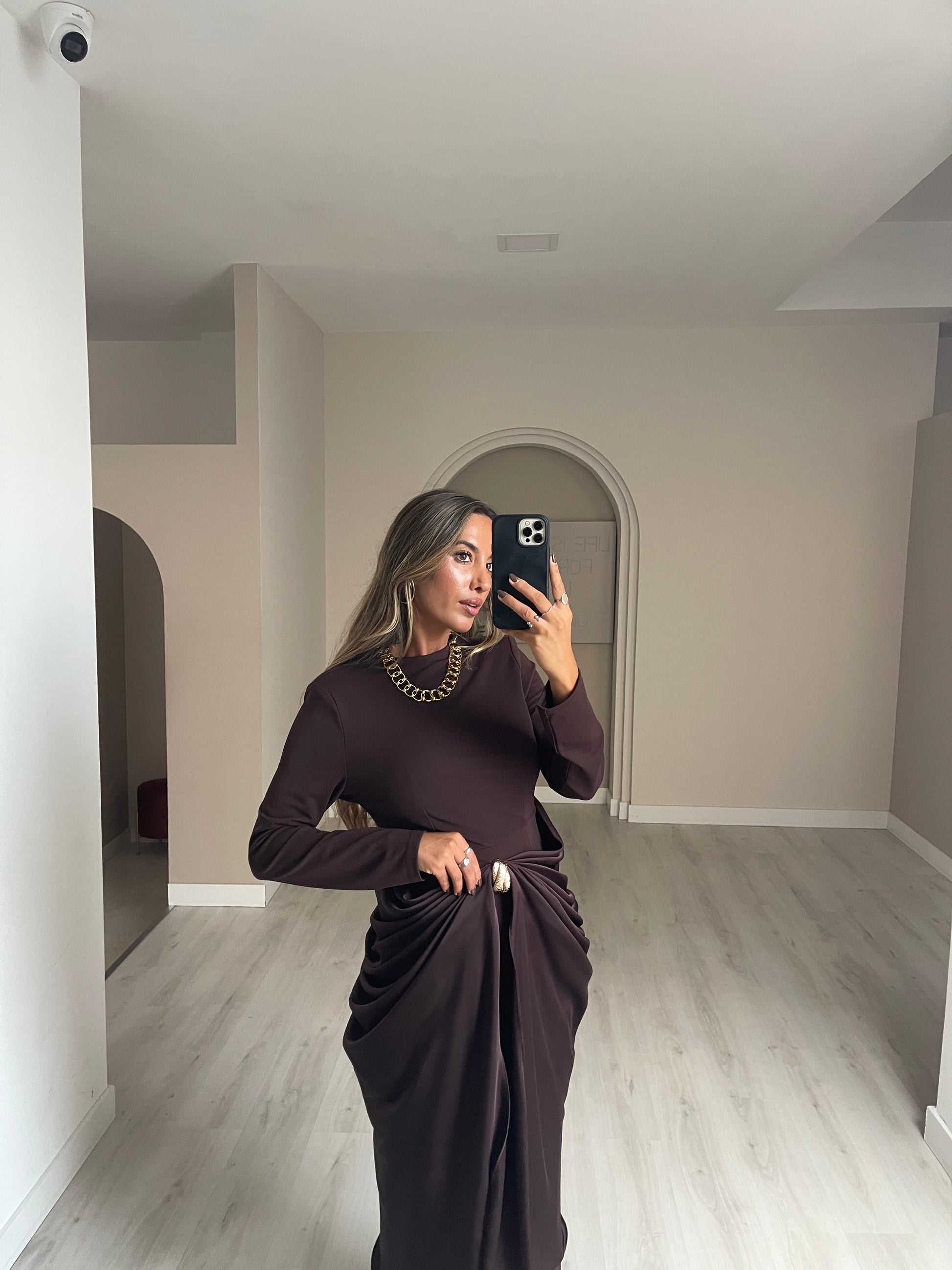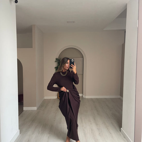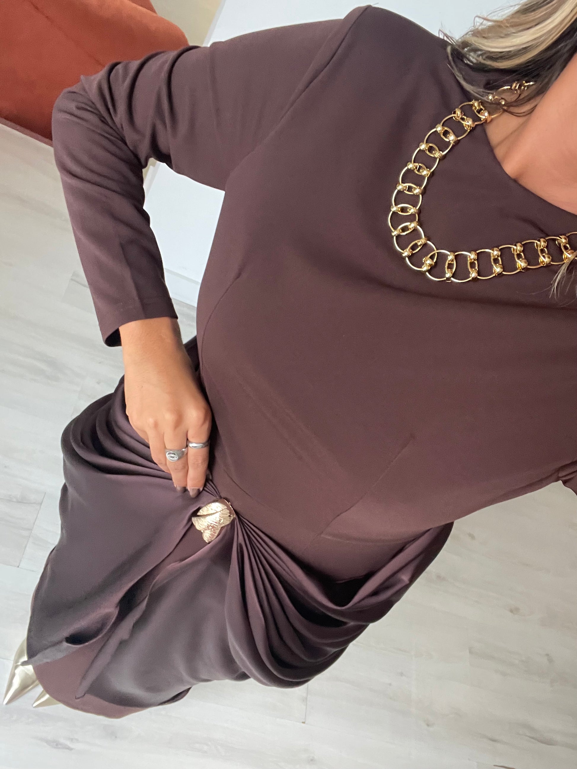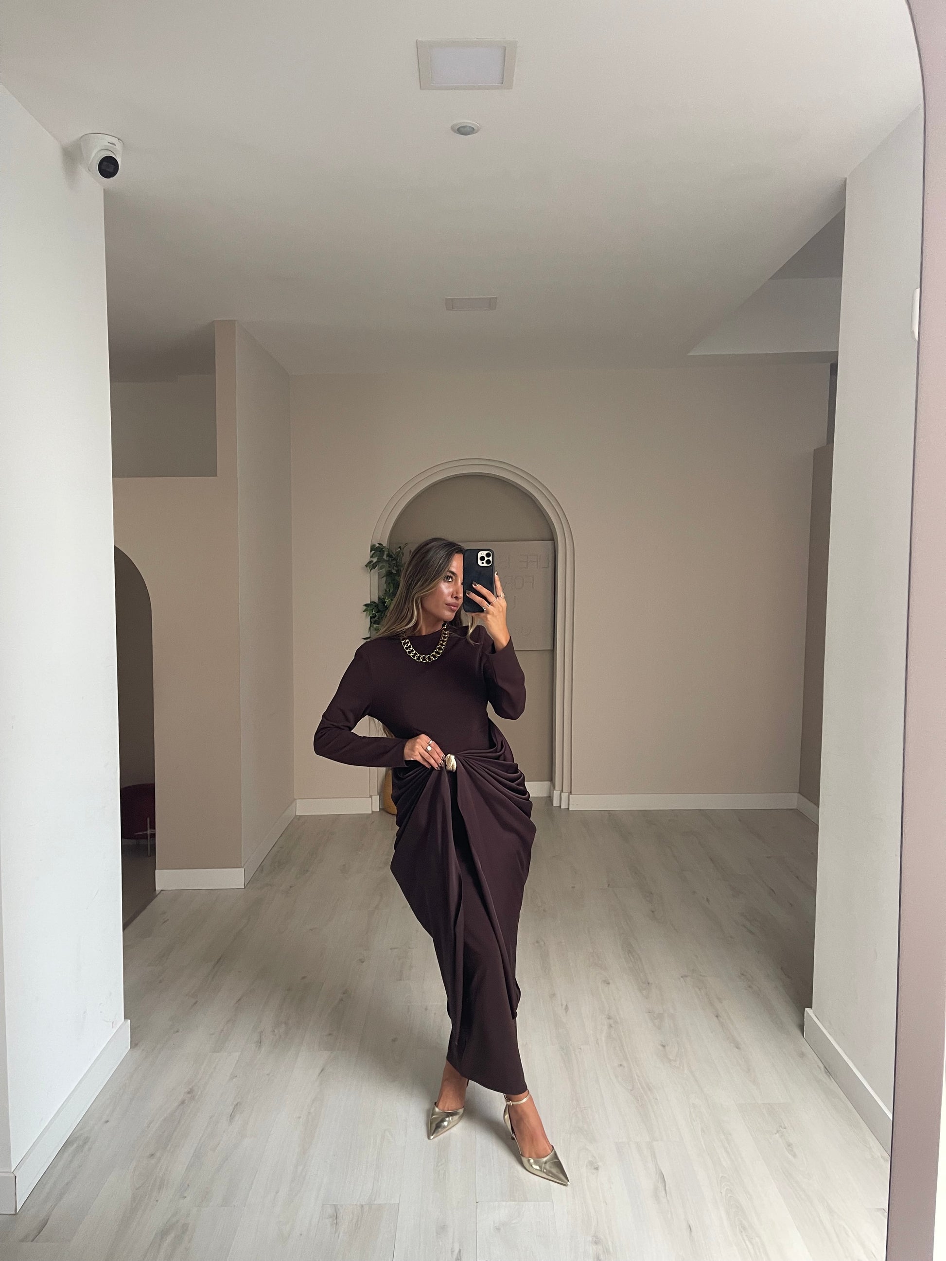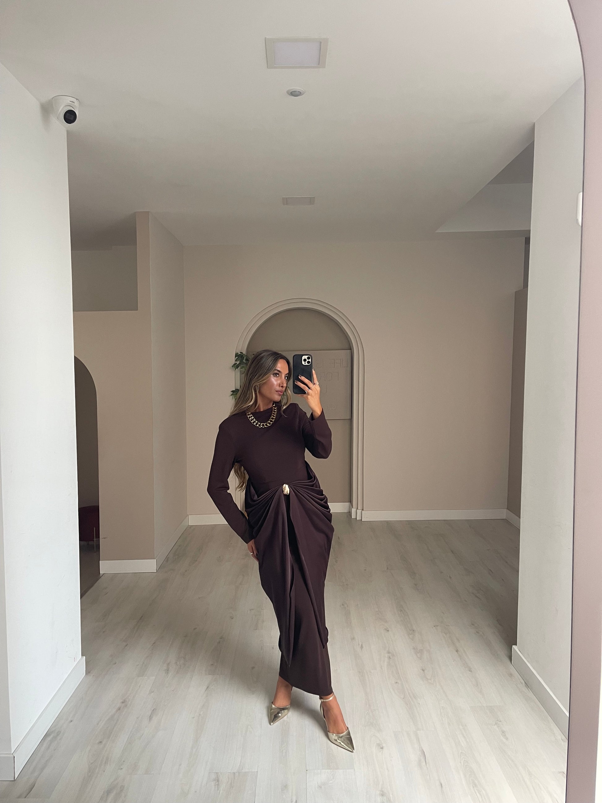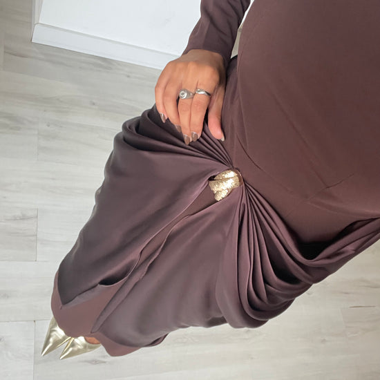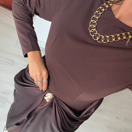 Vestido comprido em cetim com o pormenor de renda na barriga.