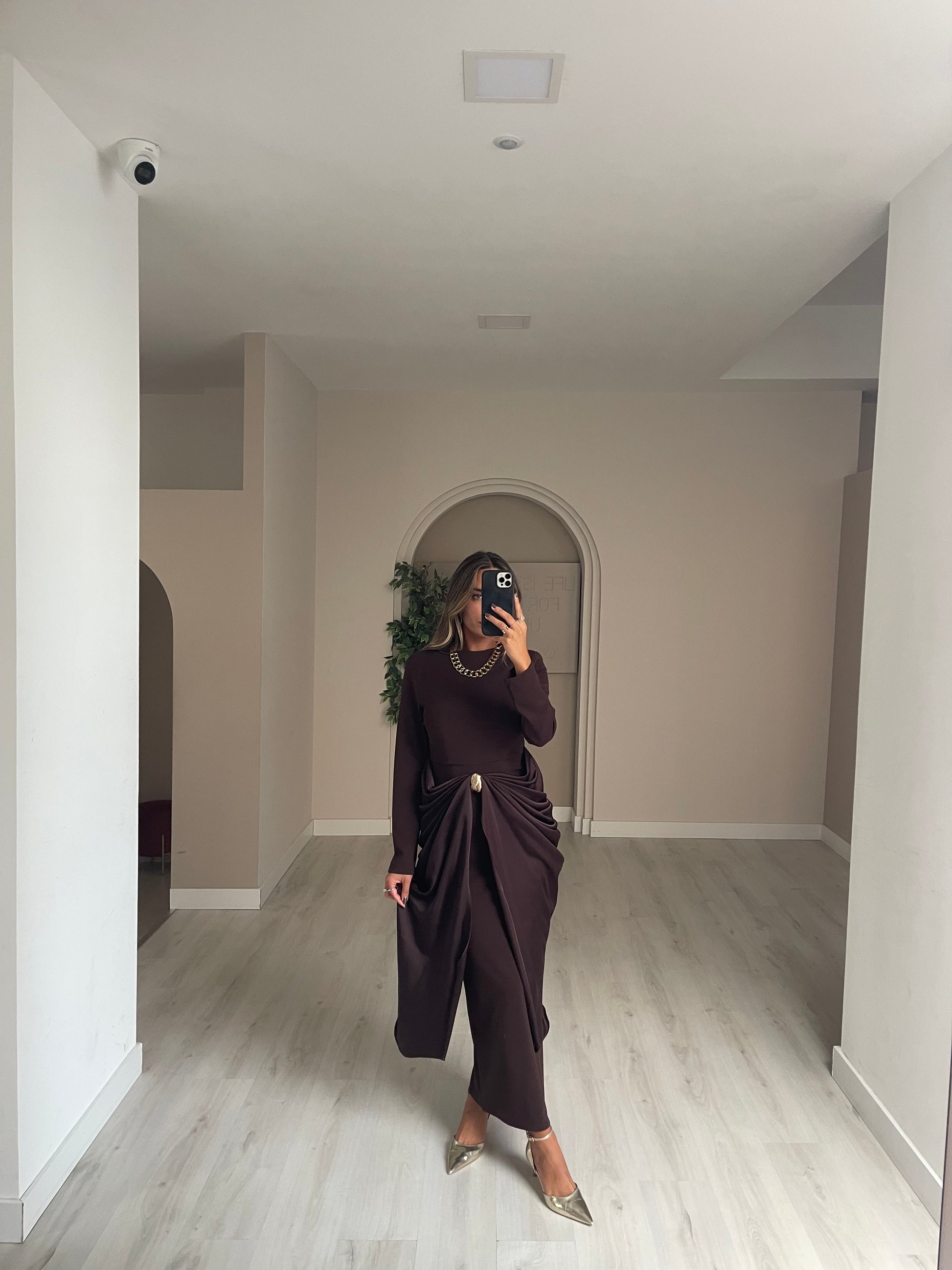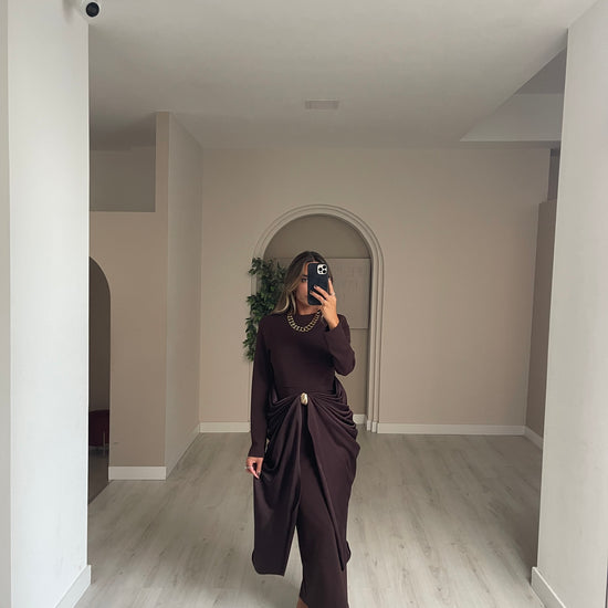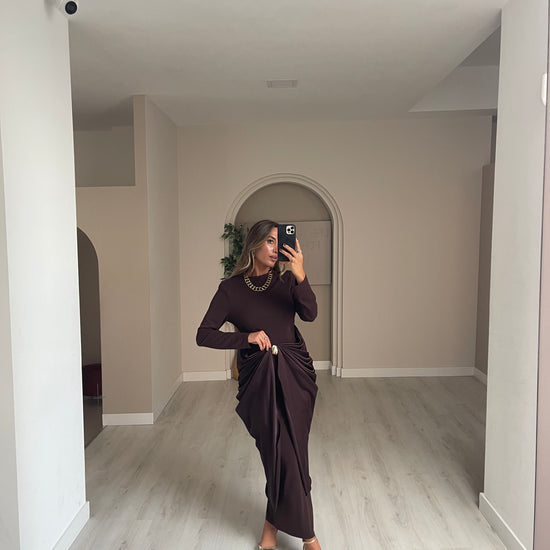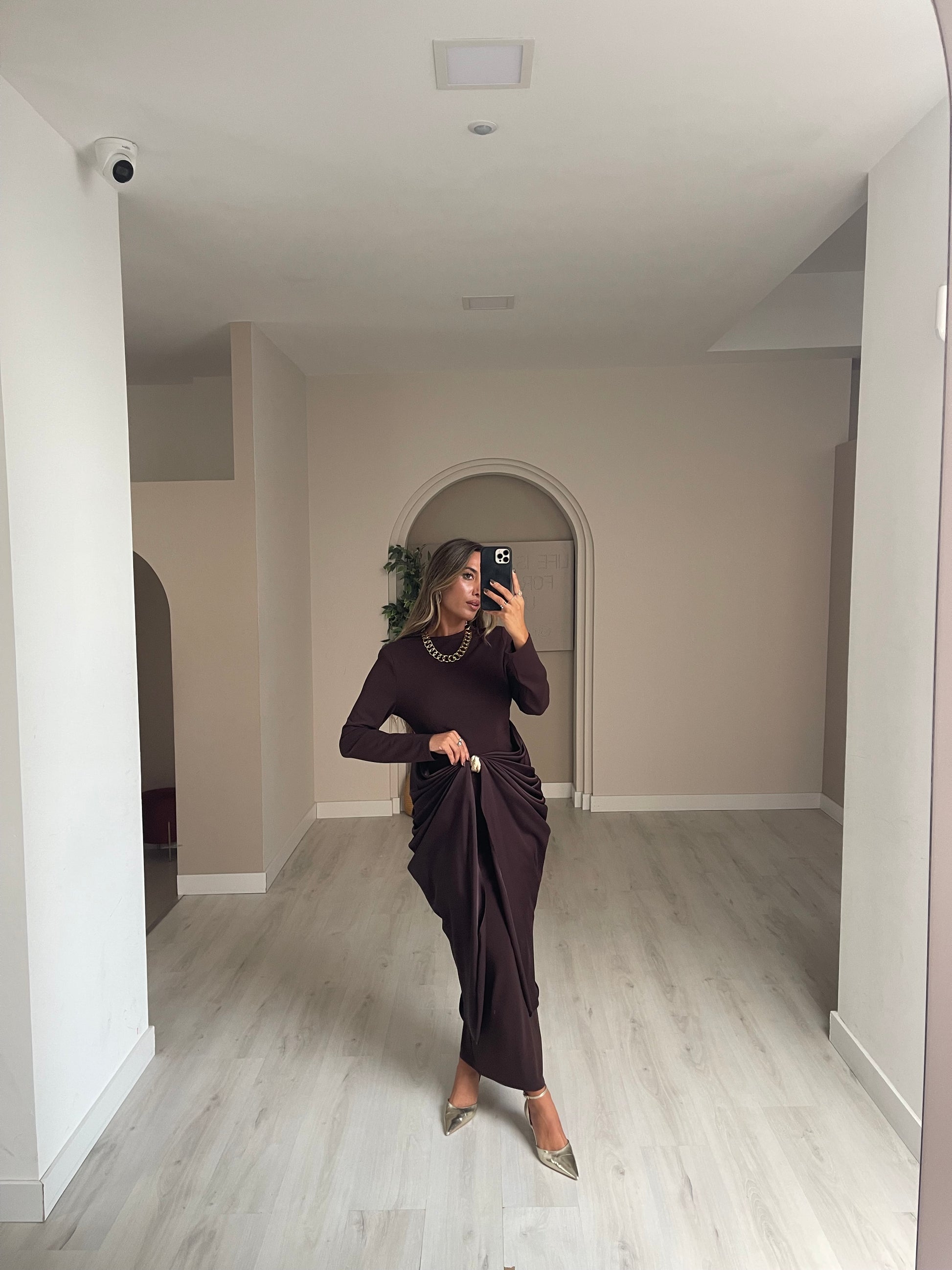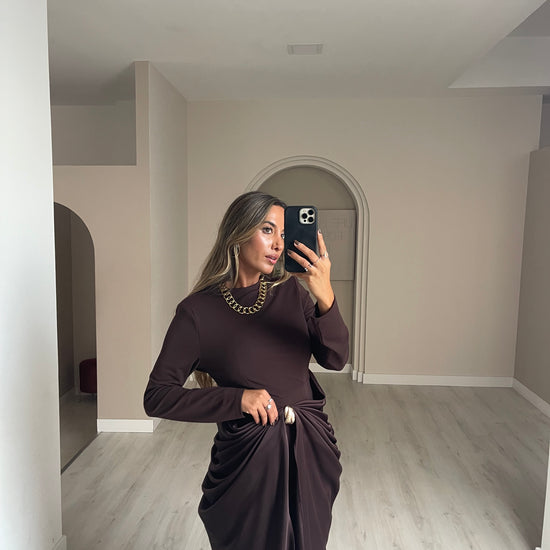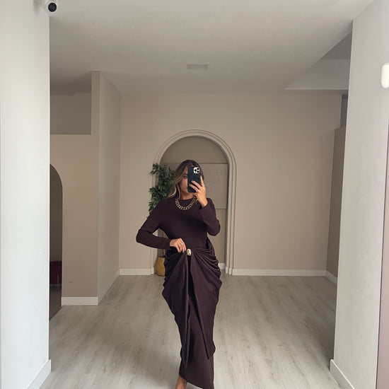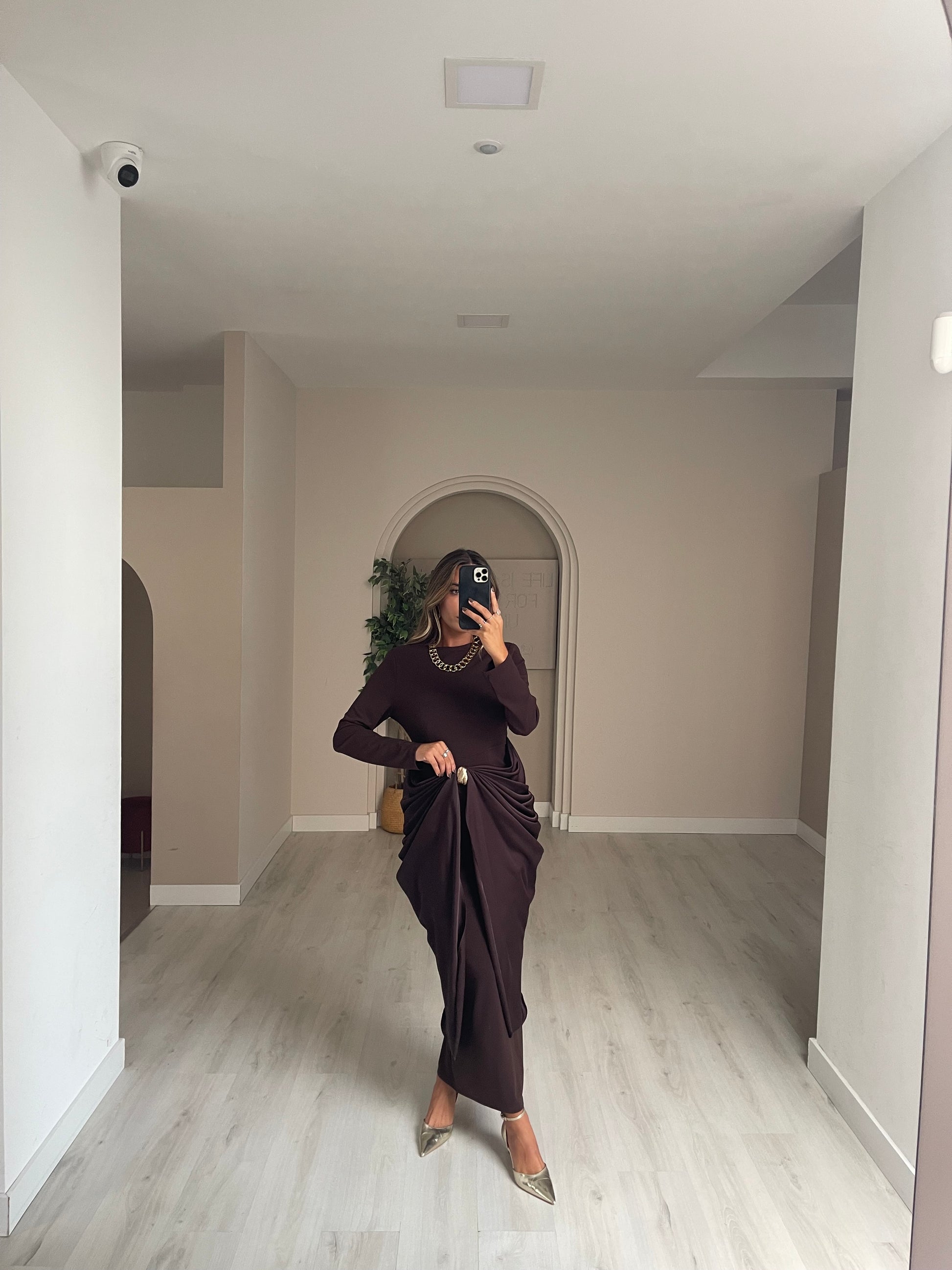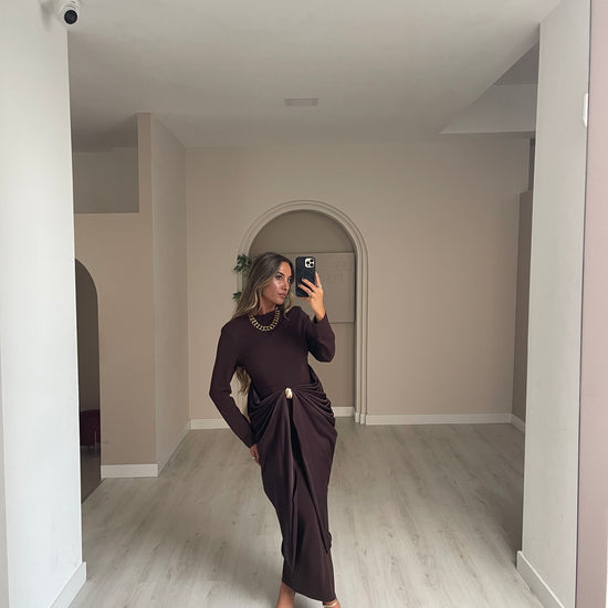 Vestido comprido em cetim com o pormenor de renda na barriga.
