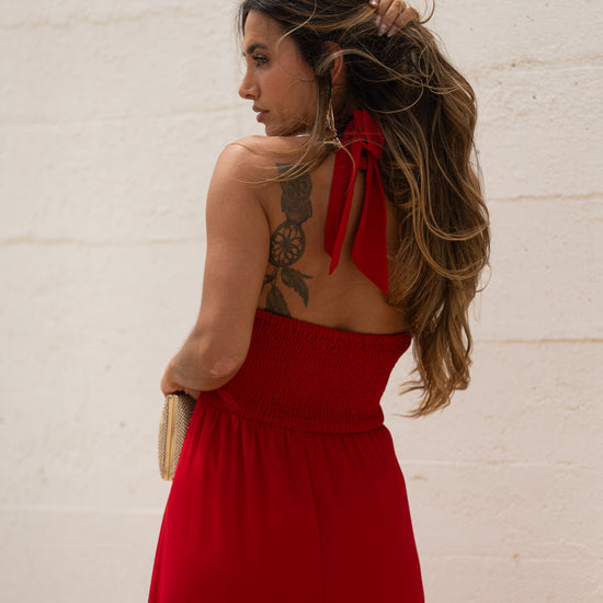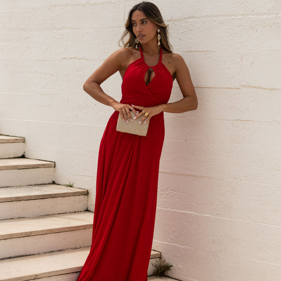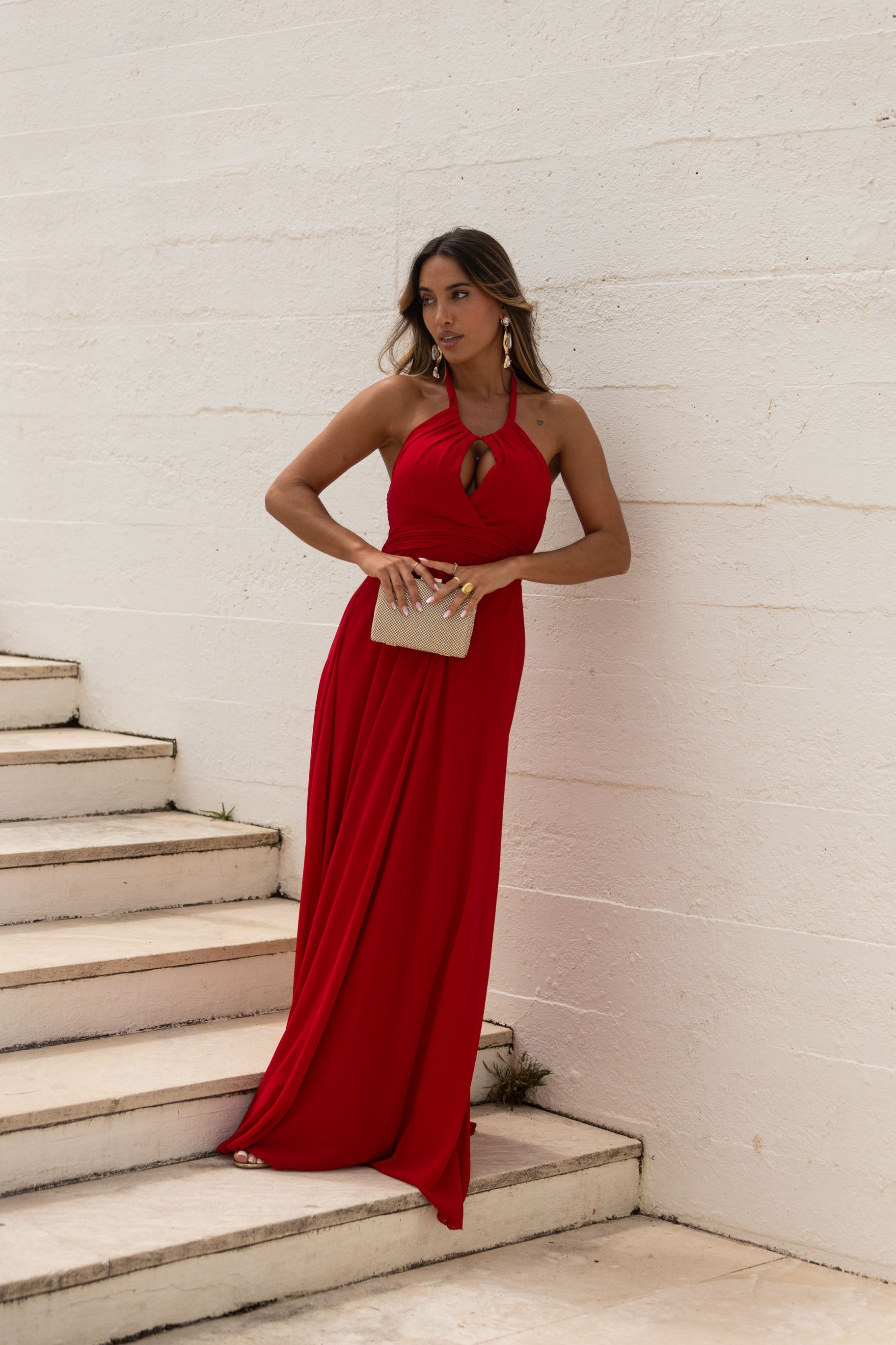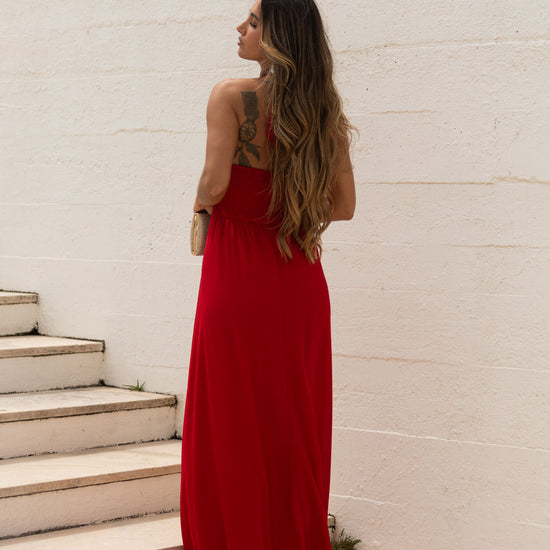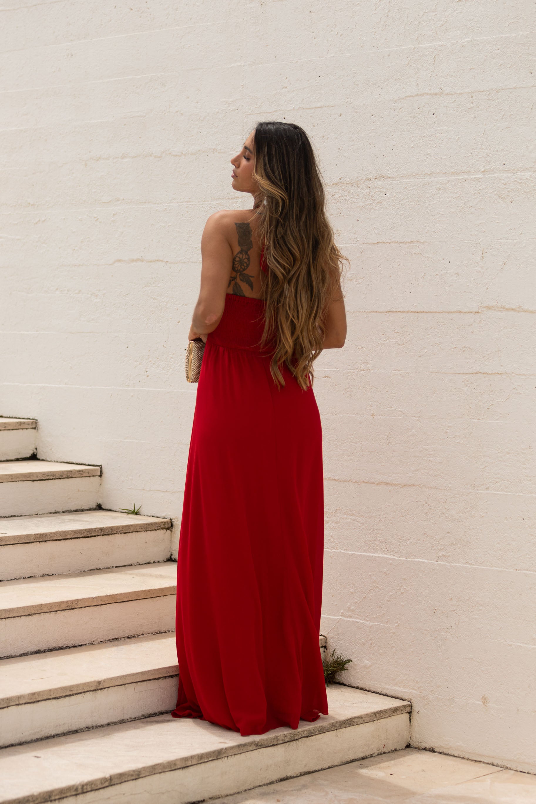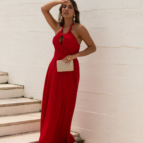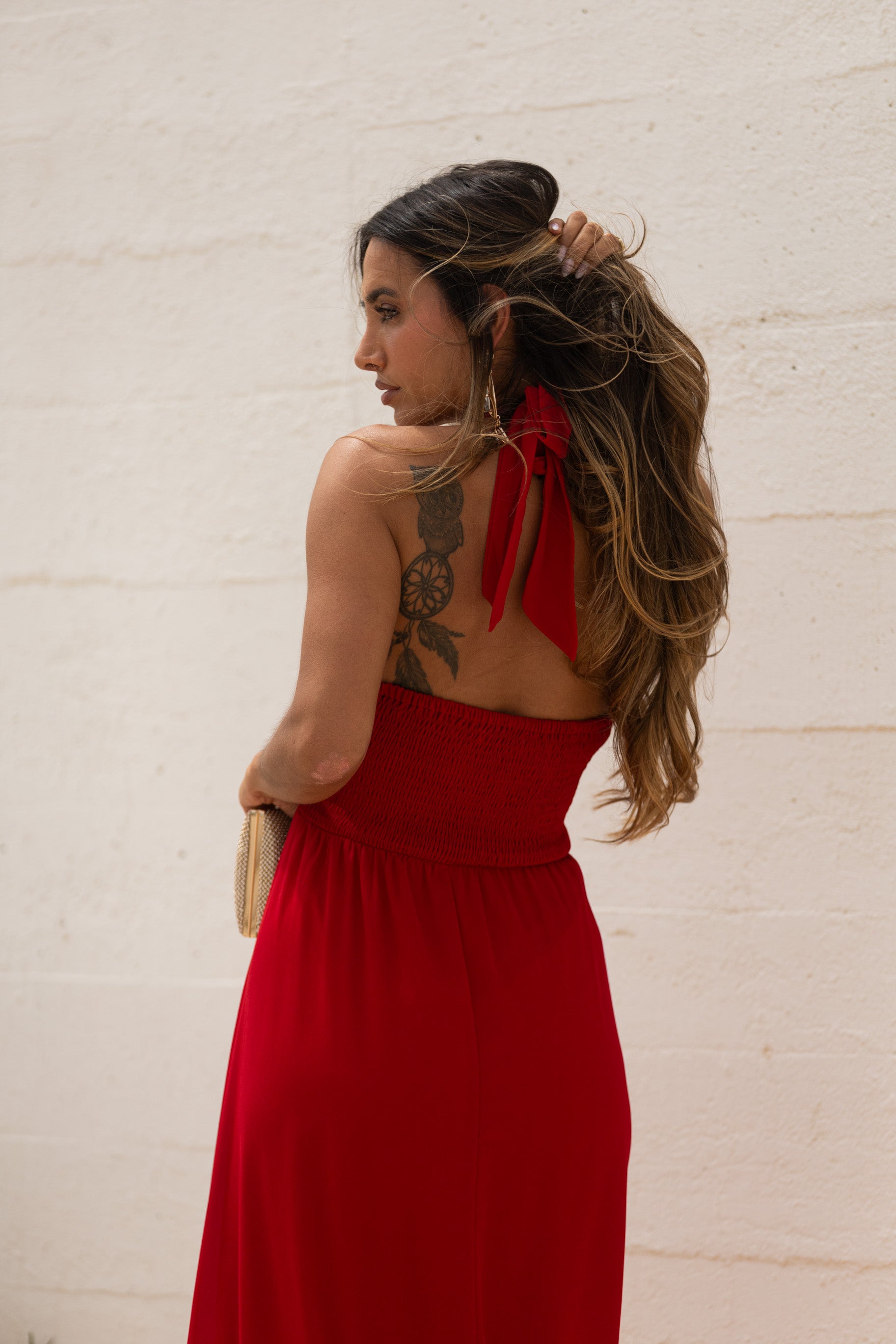 Vestido fluído com abertura no peito. A modelo está a usar S.