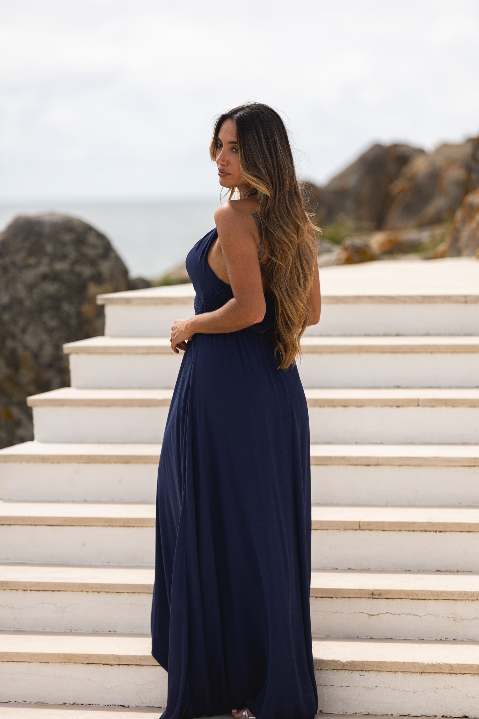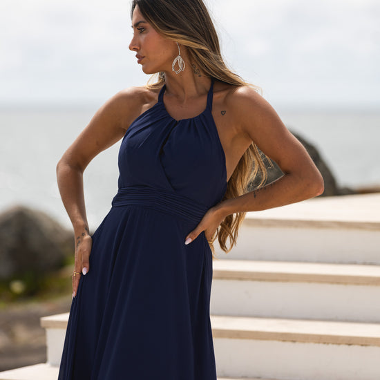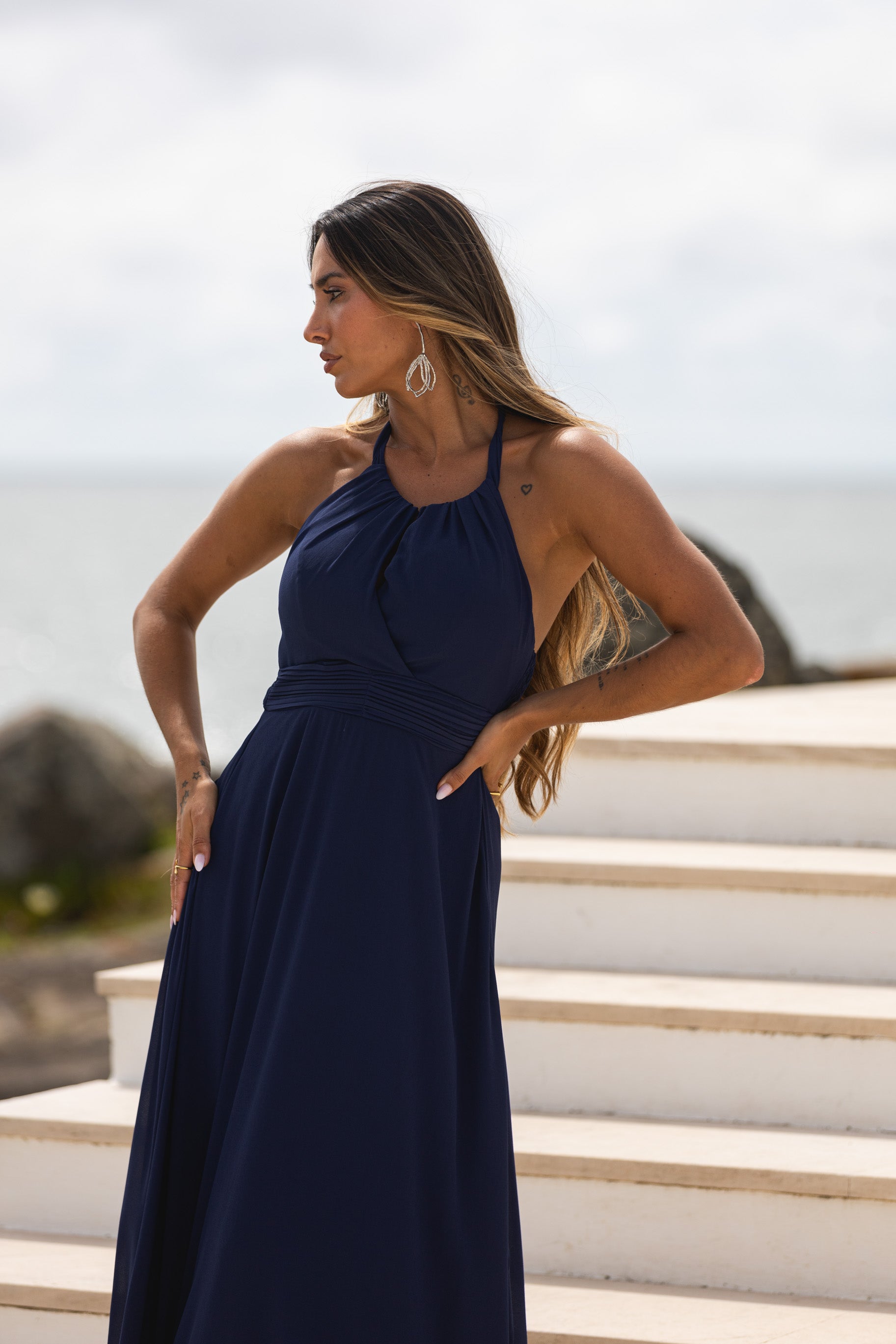 Vestido fluído com abertura no peito. A modelo está a usar S.