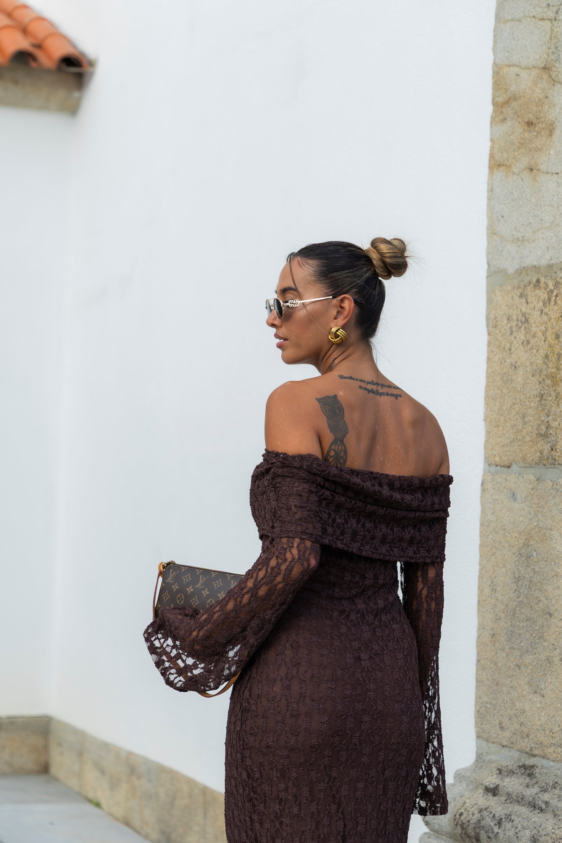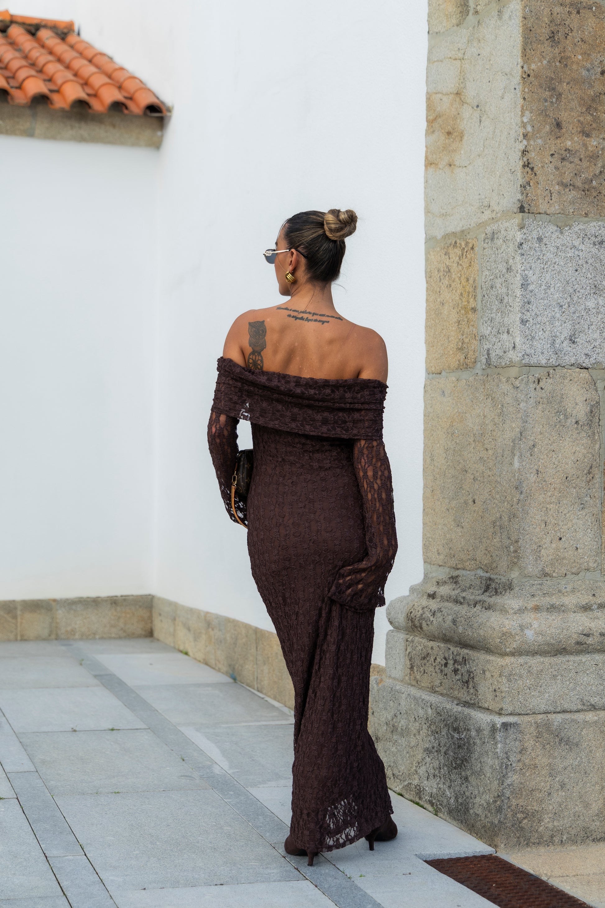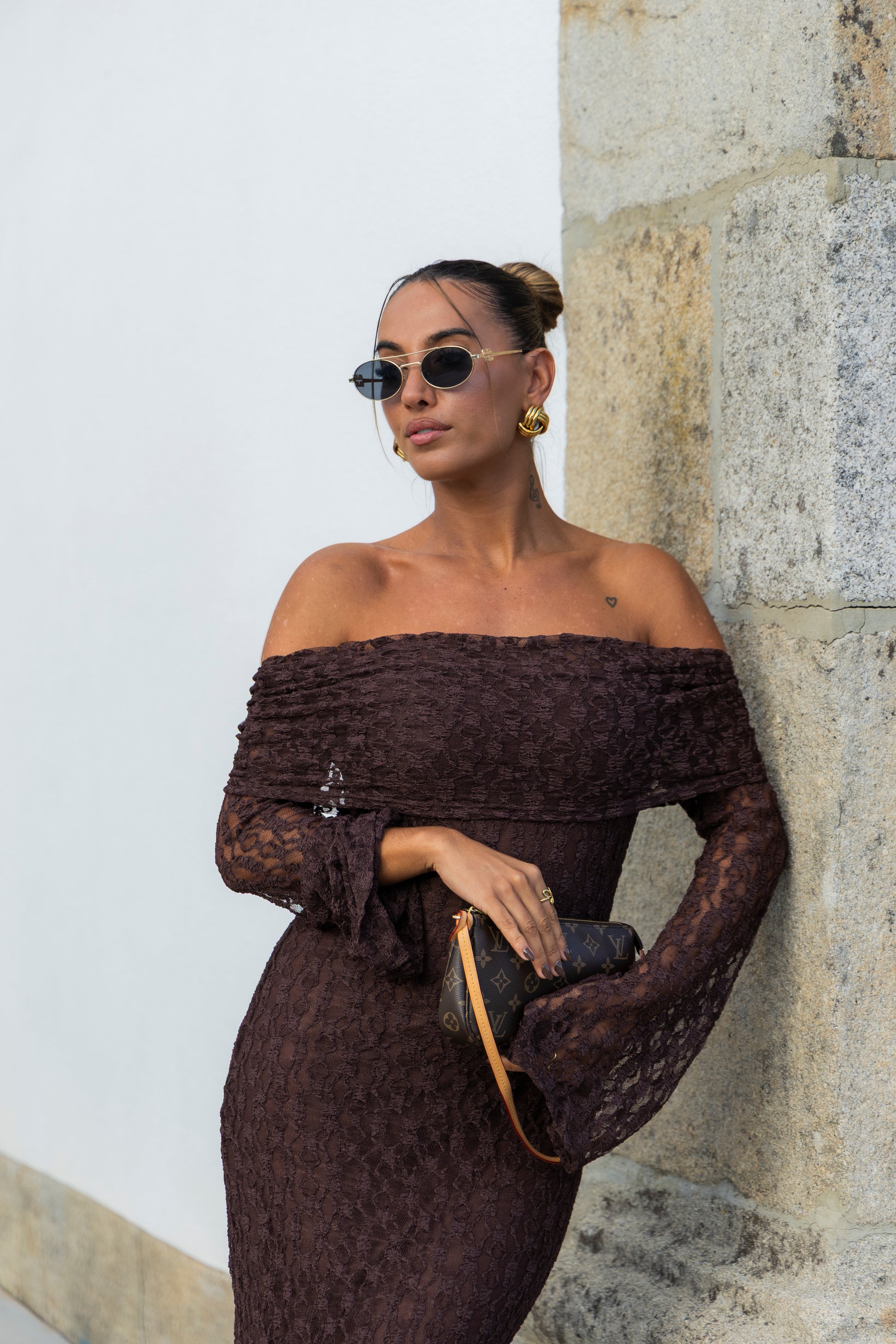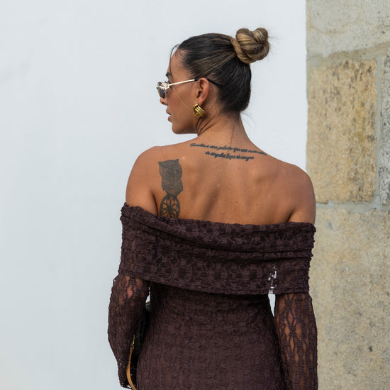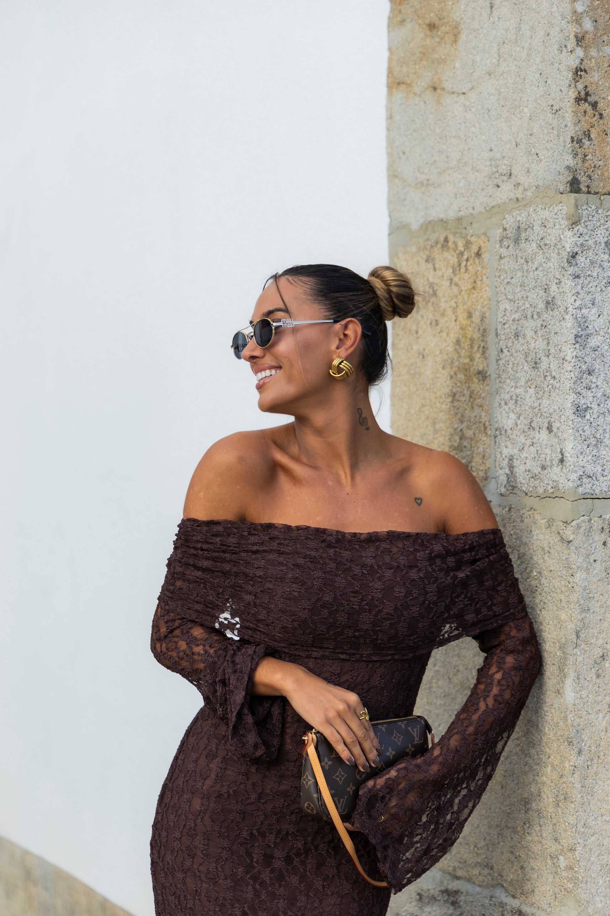 Vestido curto, com camadas de folhos num tecido acetinado.