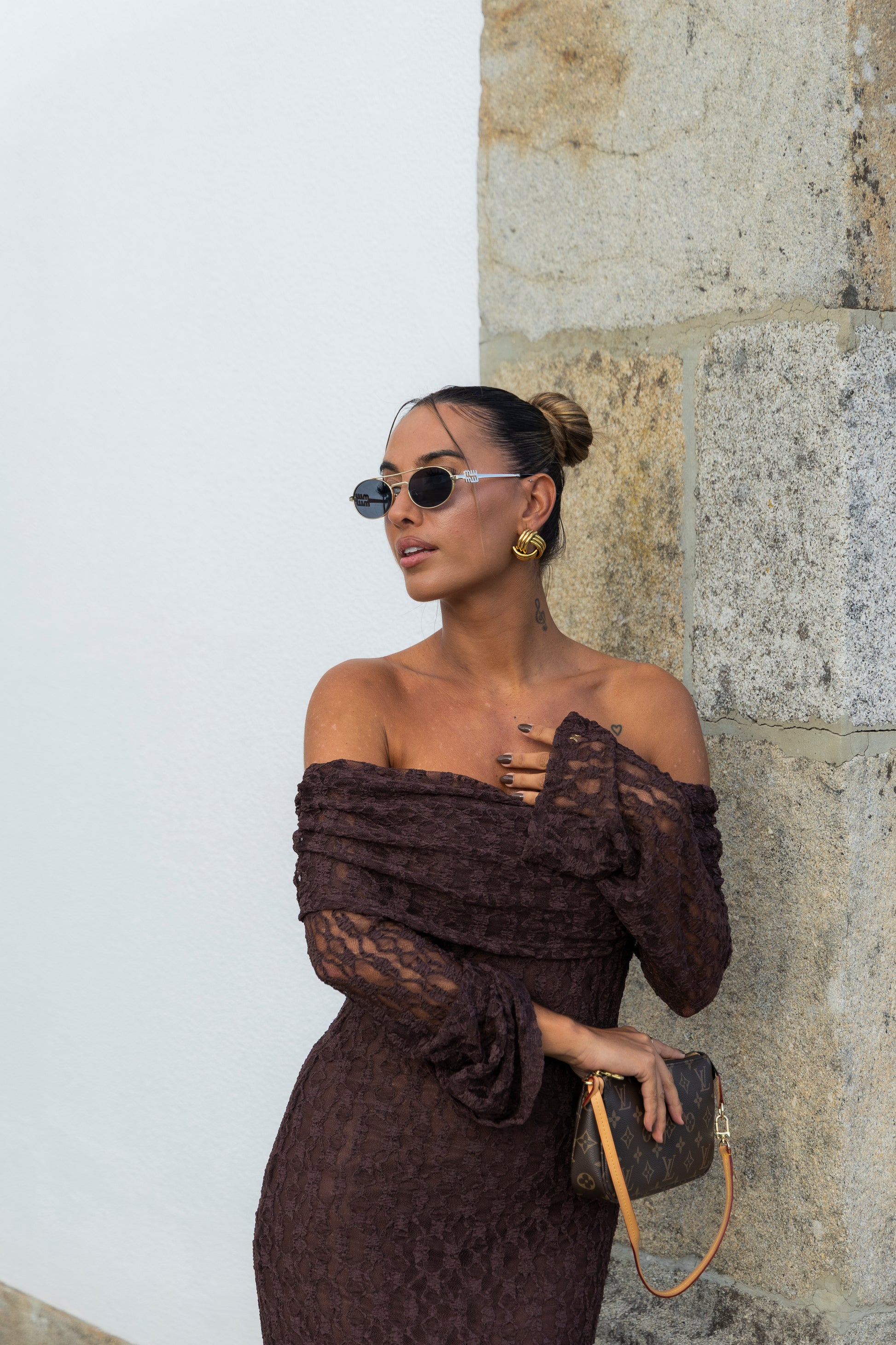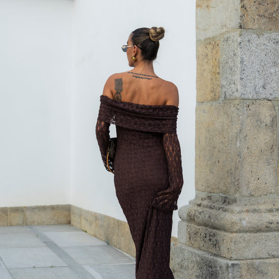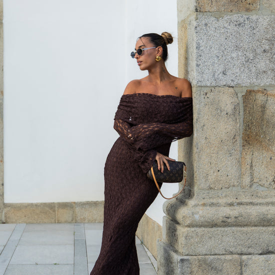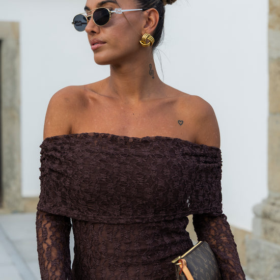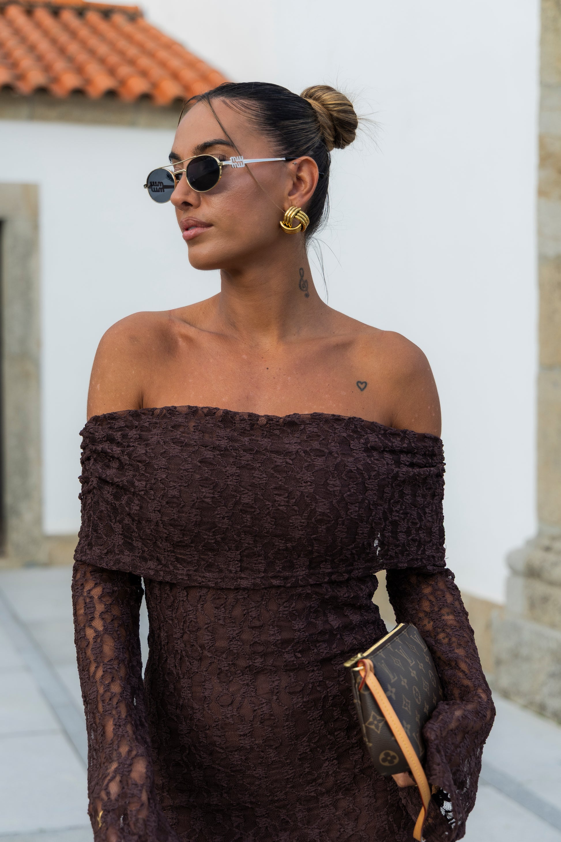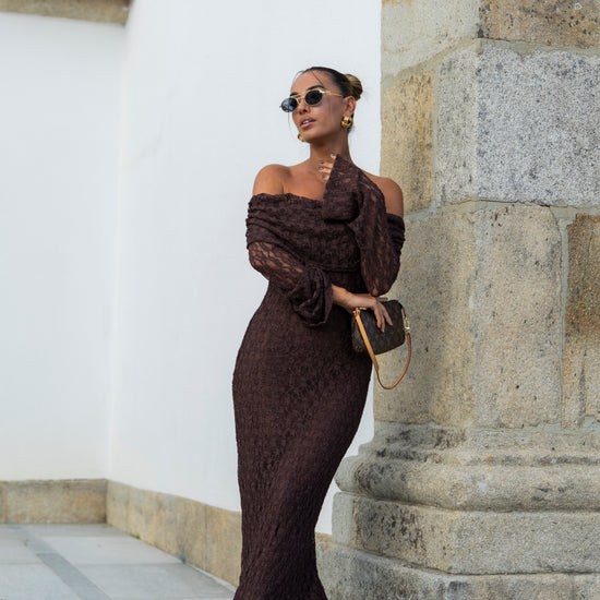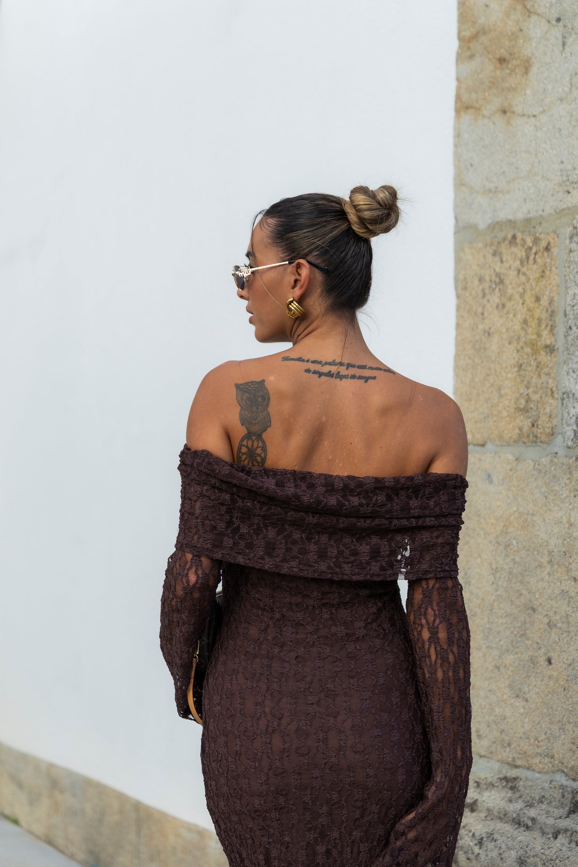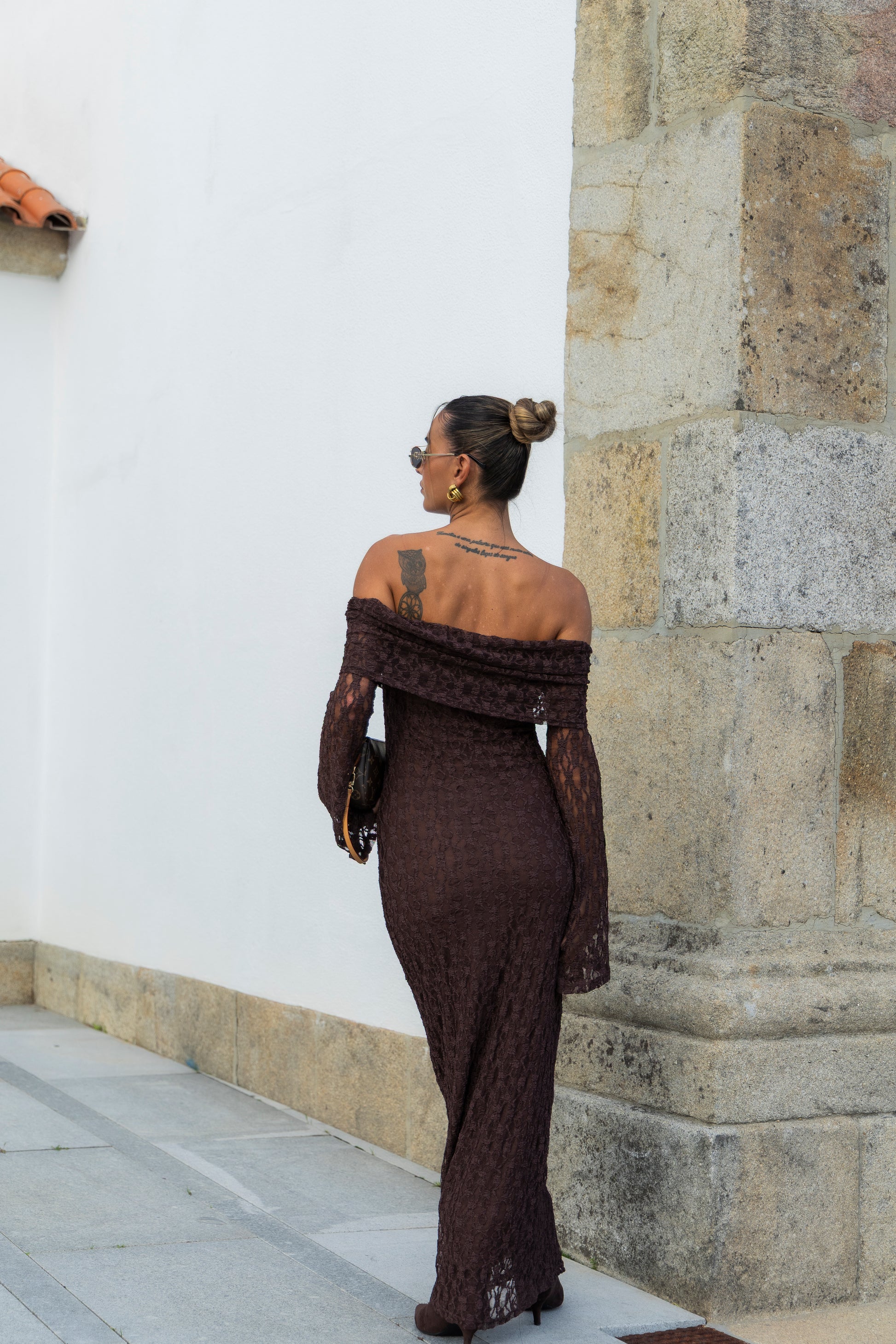 Vestido curto, com camadas de folhos num tecido acetinado.