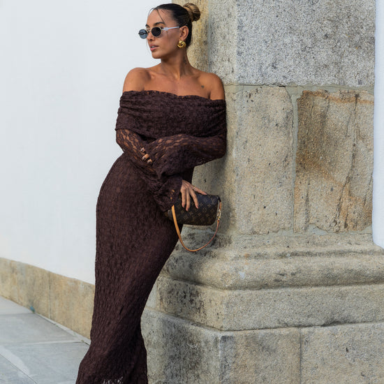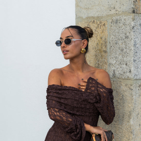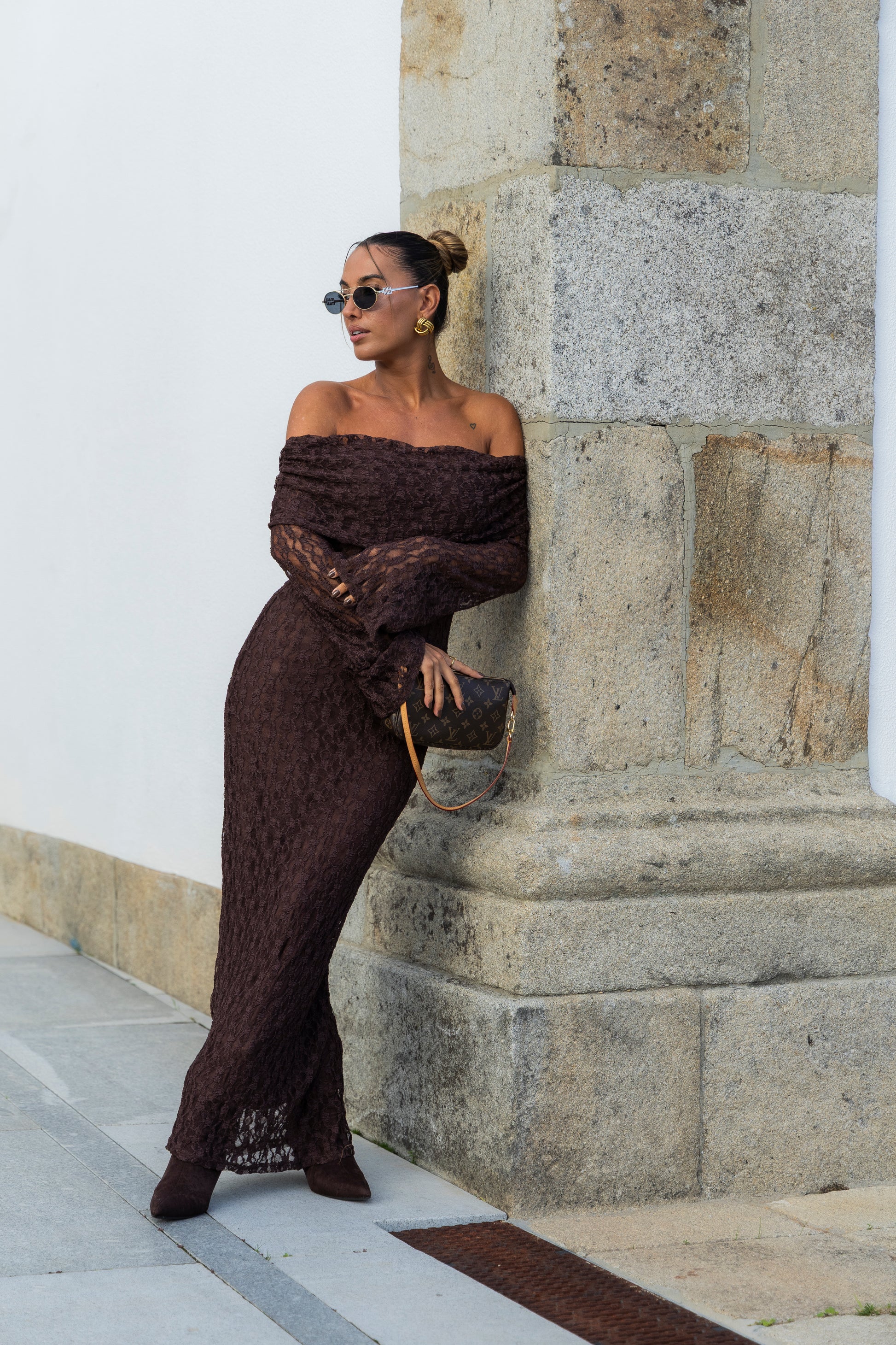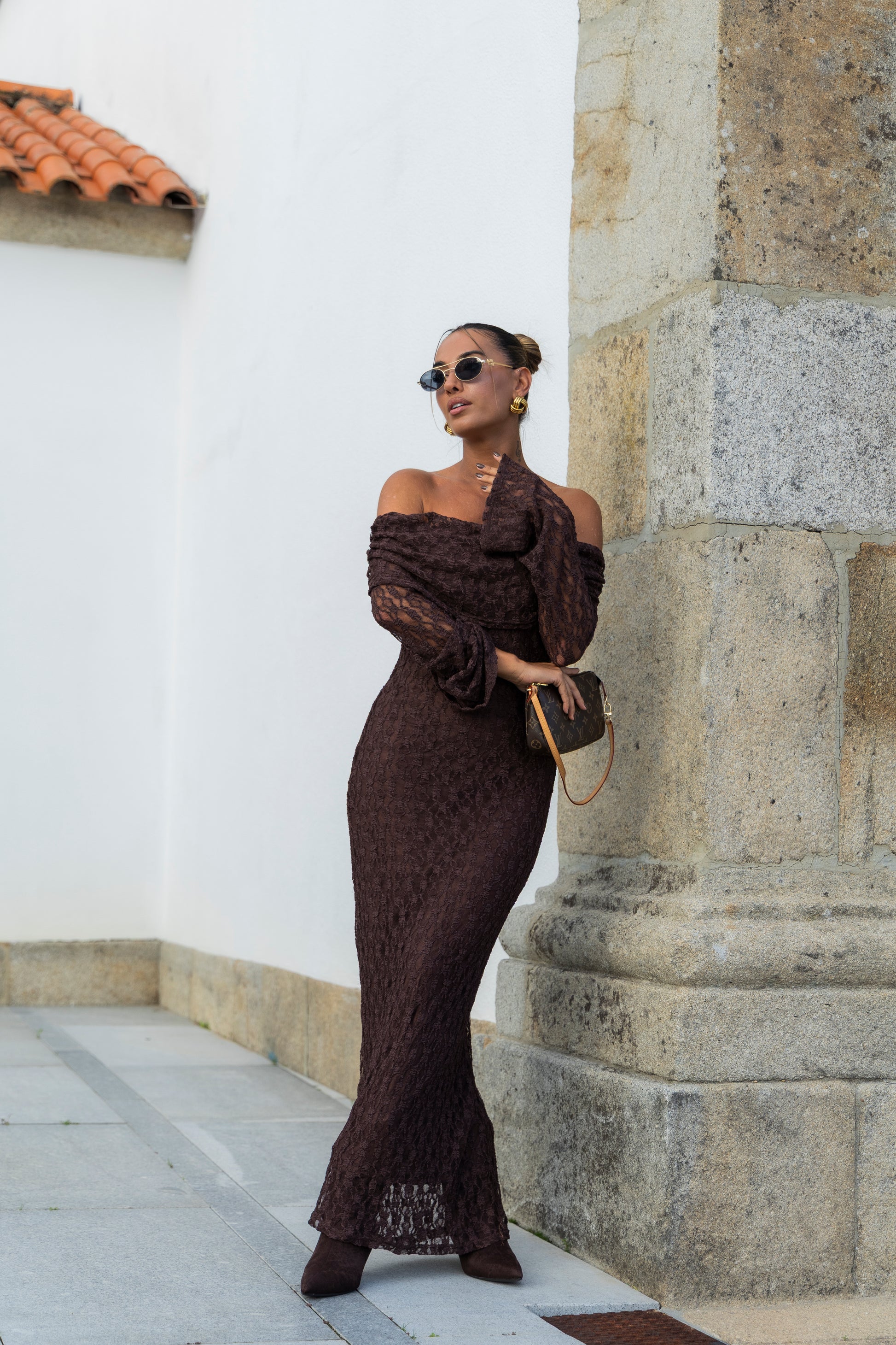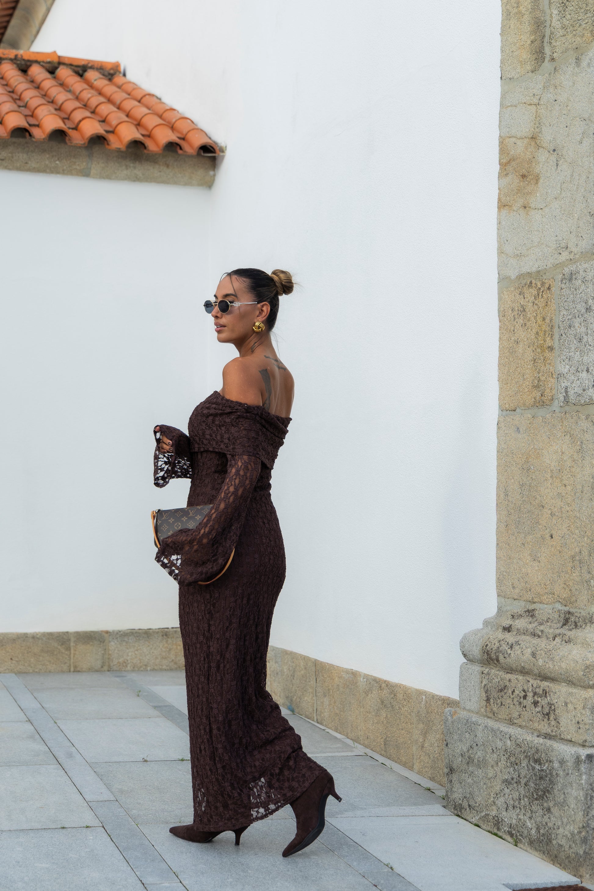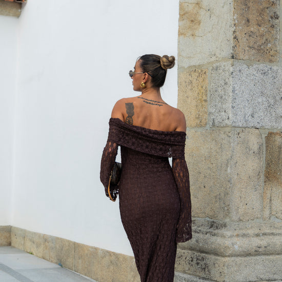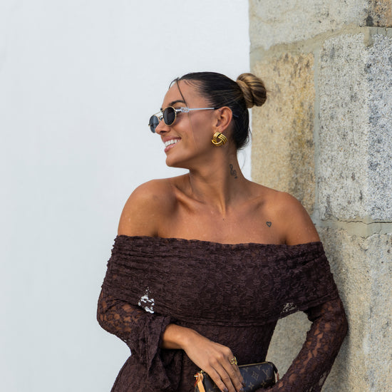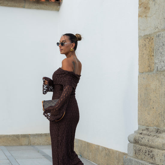 Vestido curto, com camadas de folhos num tecido acetinado.