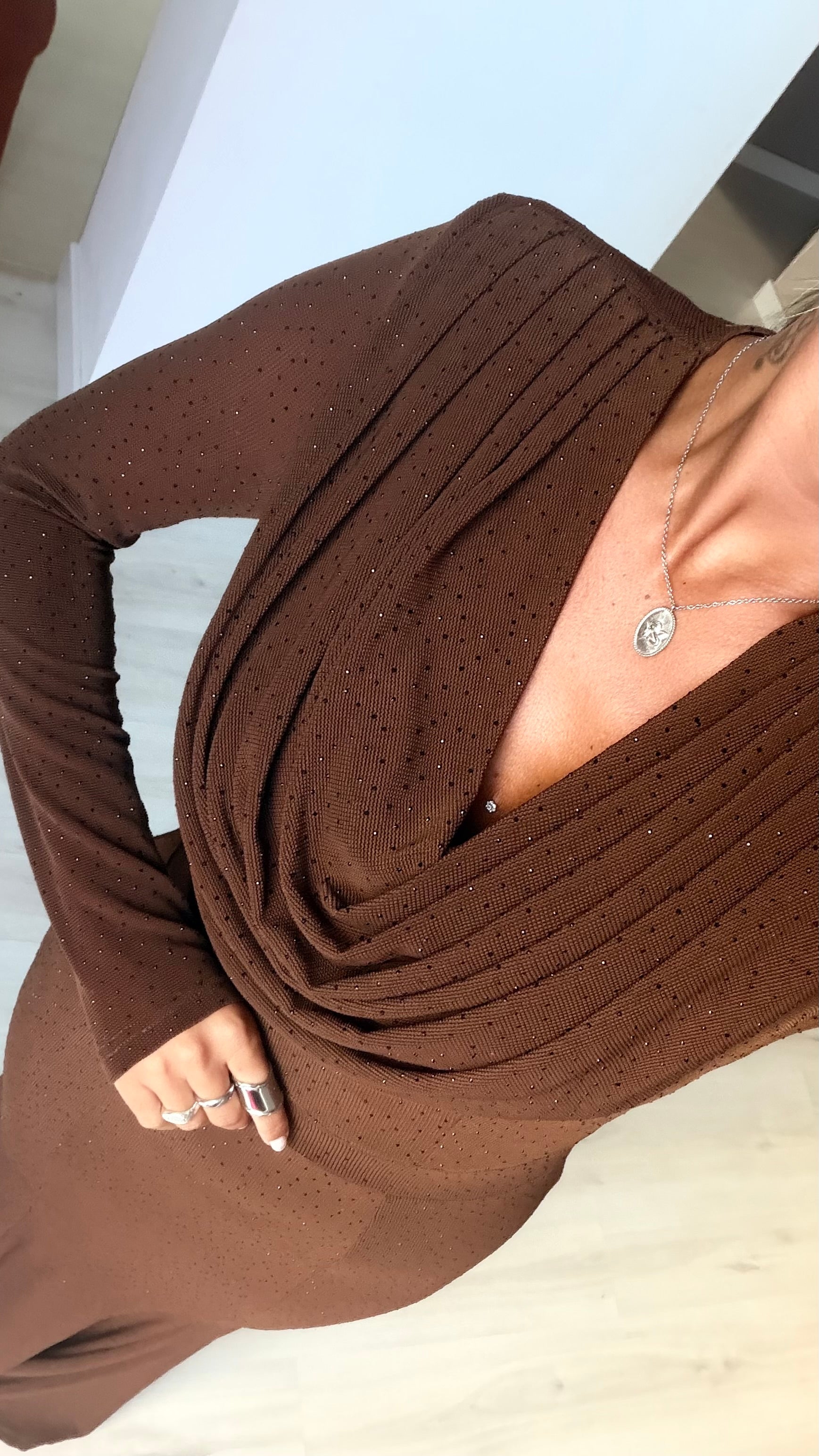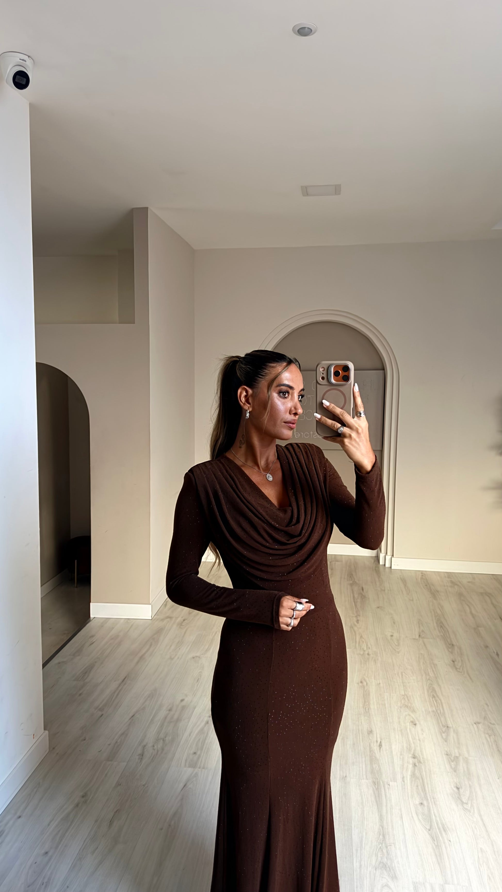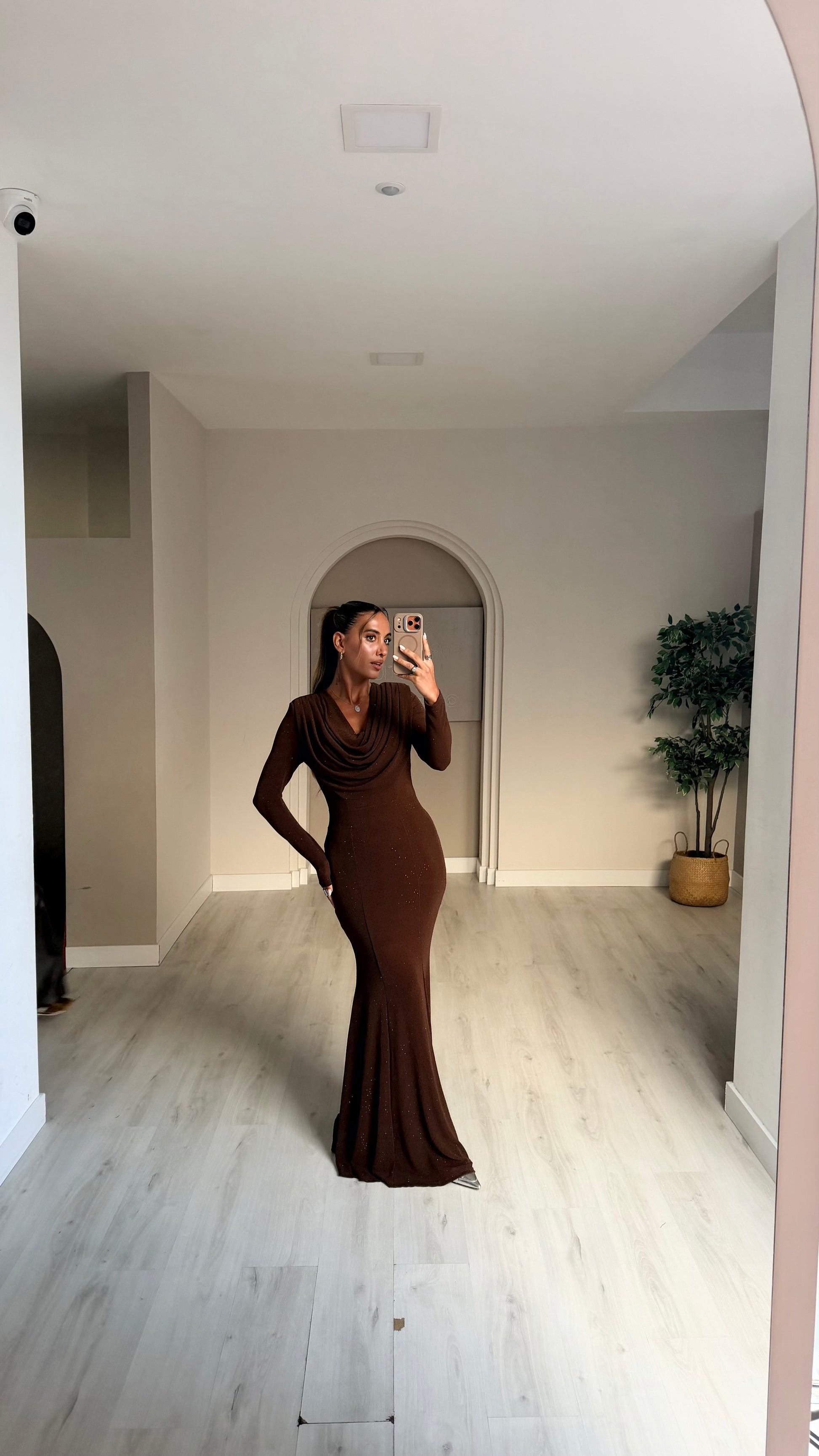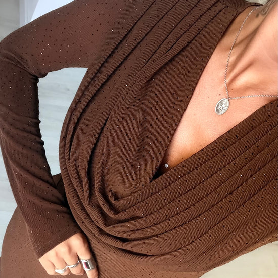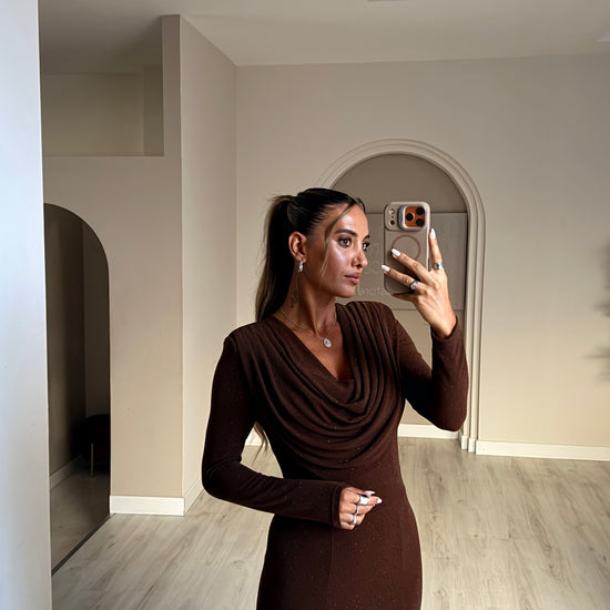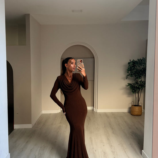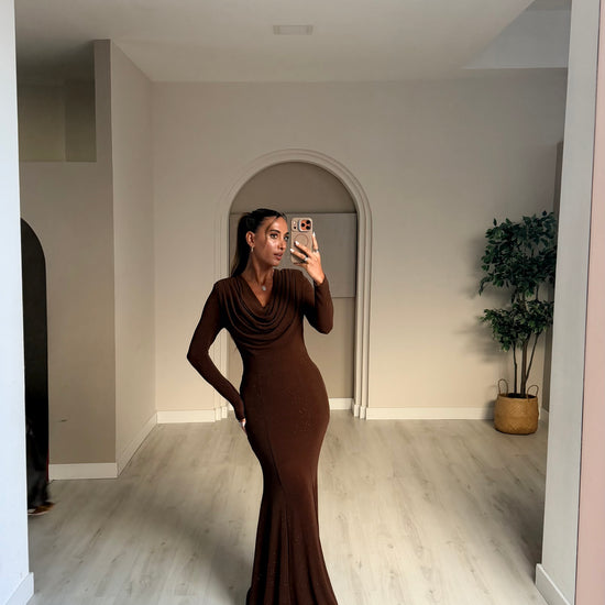 Vestido comprido com drapeado no decote - castanho