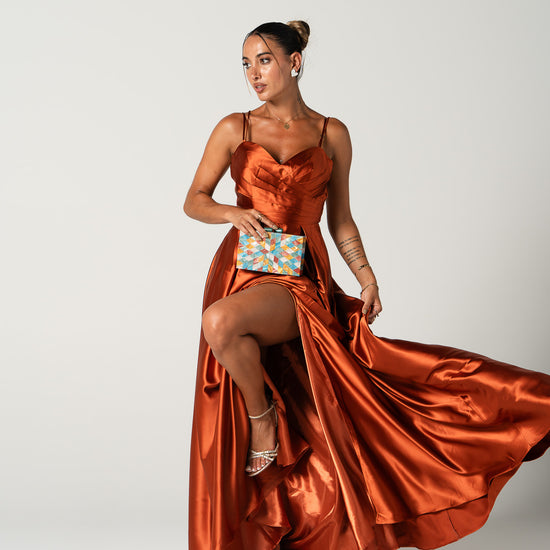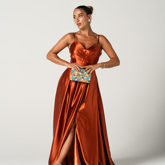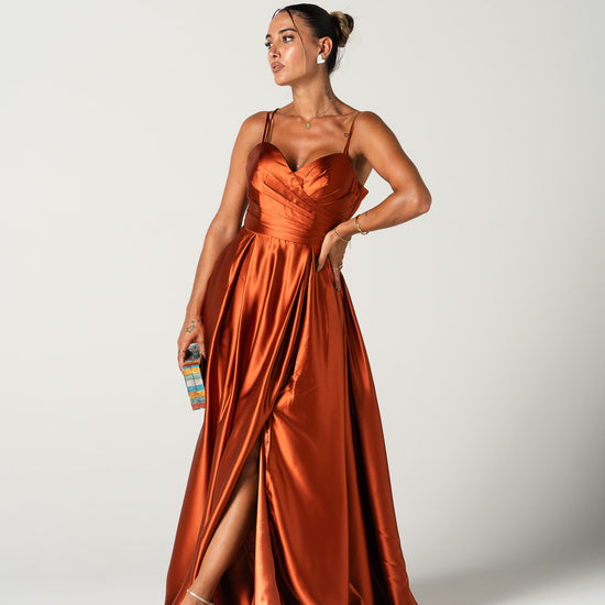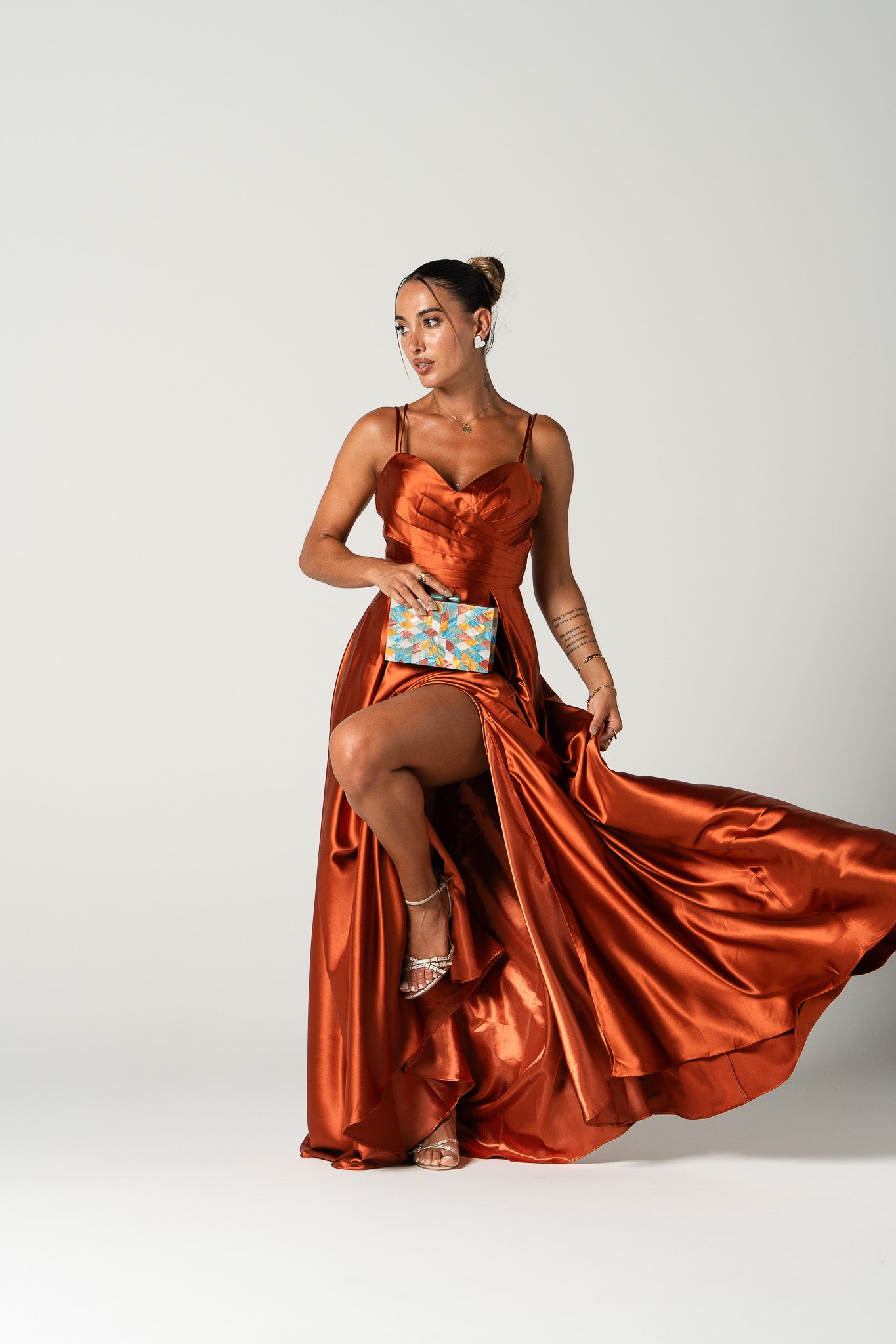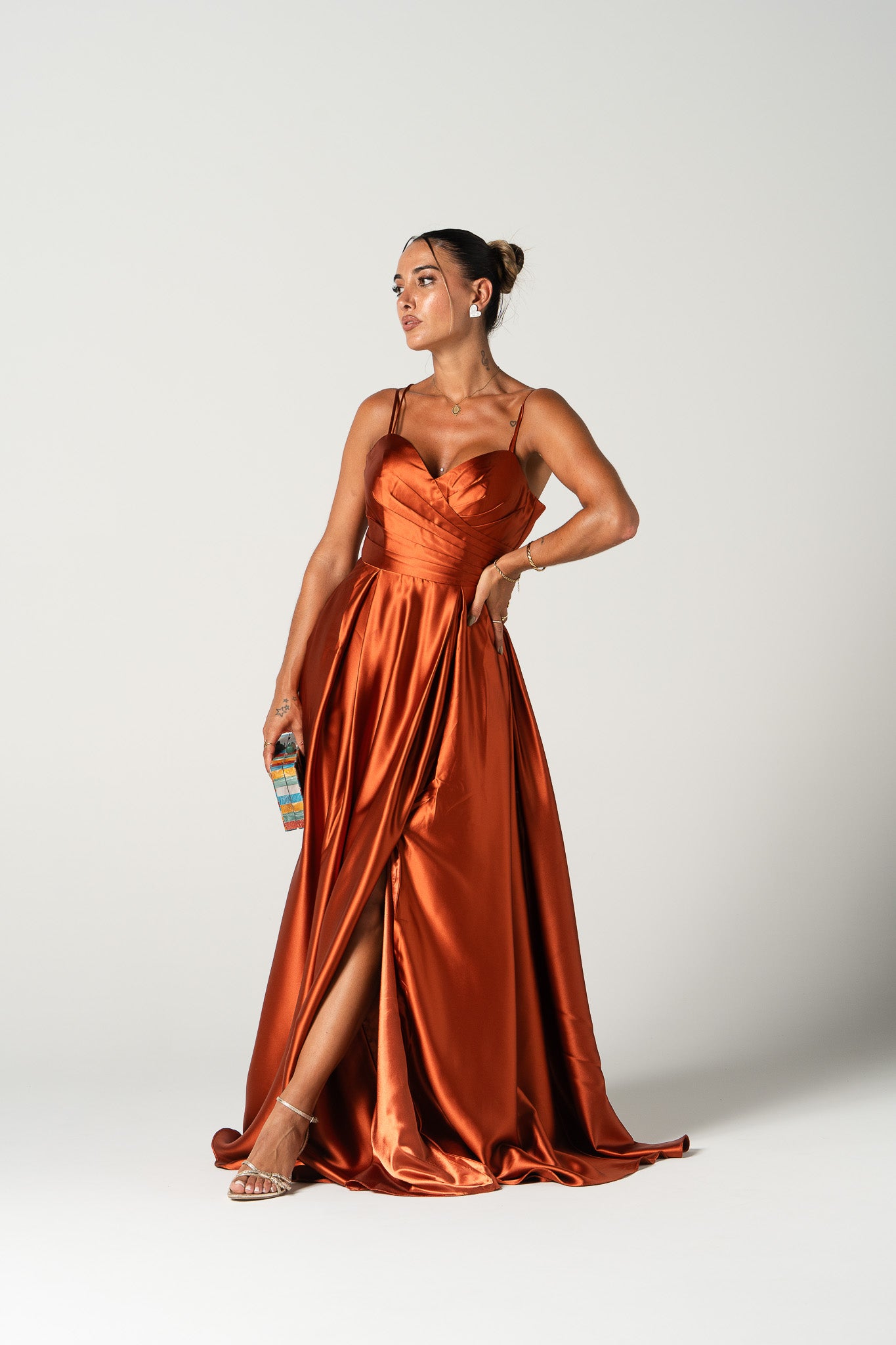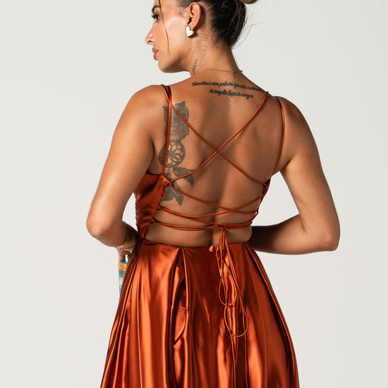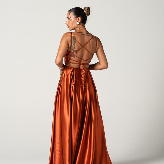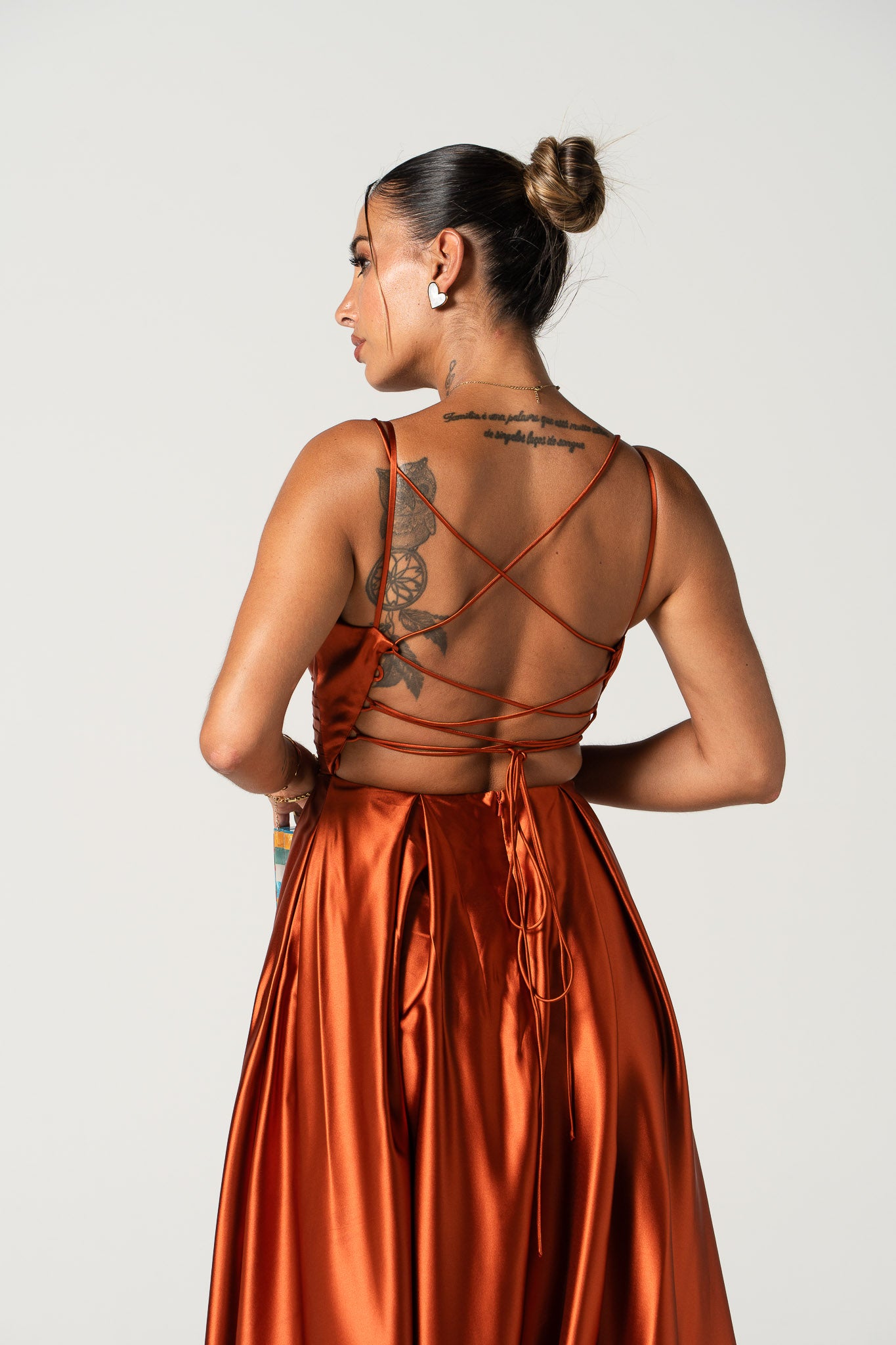 Vestido em cetim de alta qualidade, com fecho nas costas, atilhos ajustáveis e bolsos.