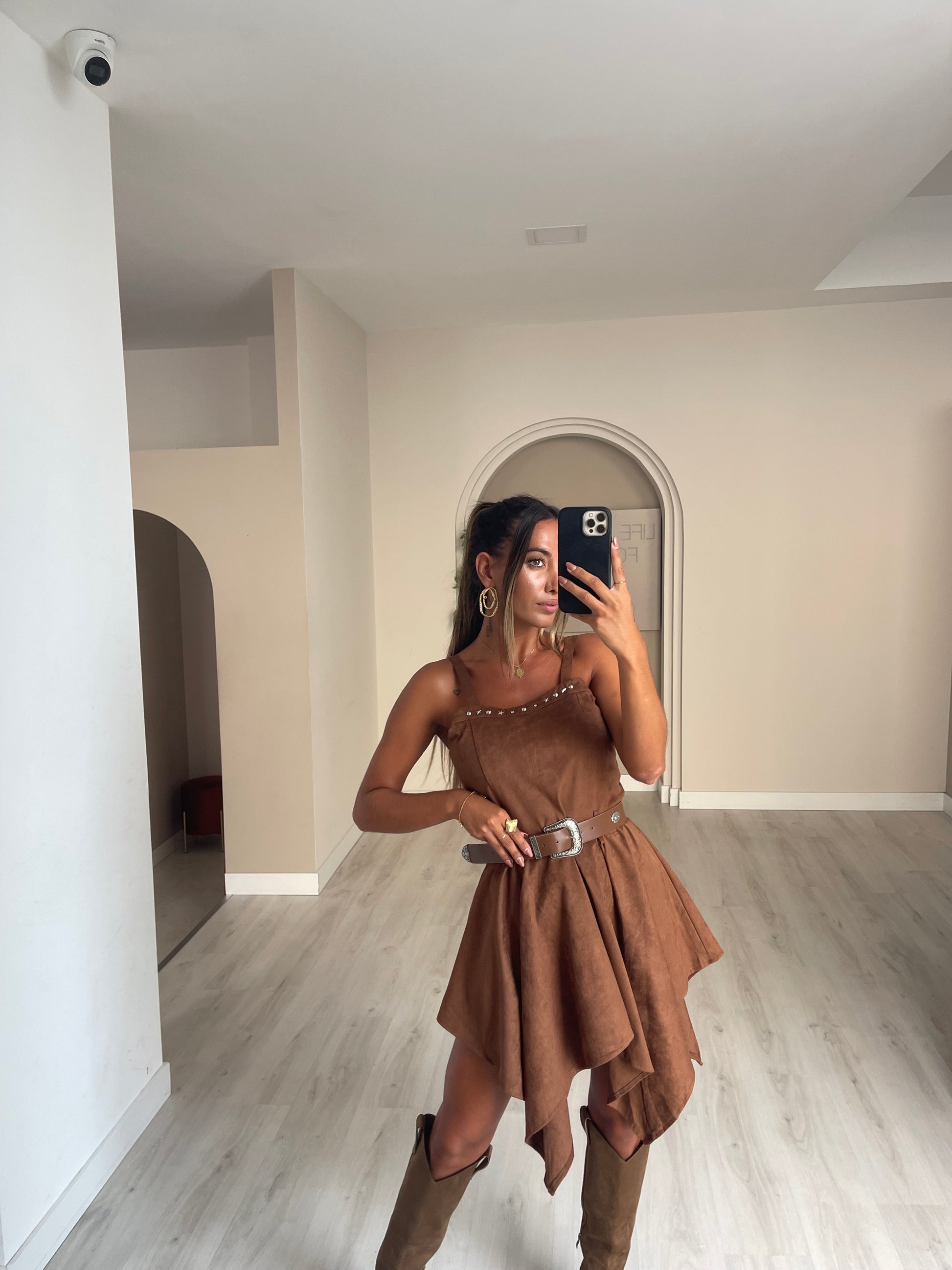 Vestido em pele de pêssego com cinto incluido.