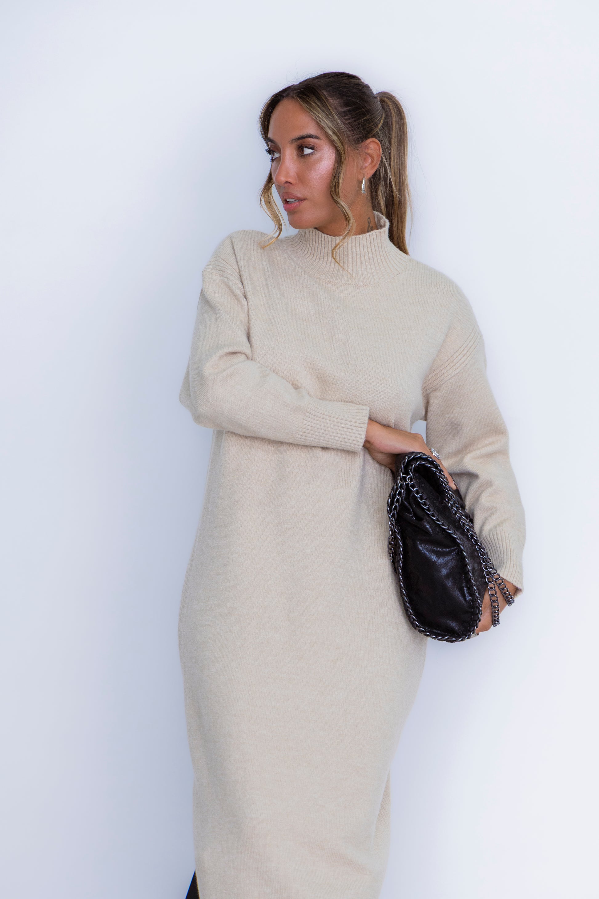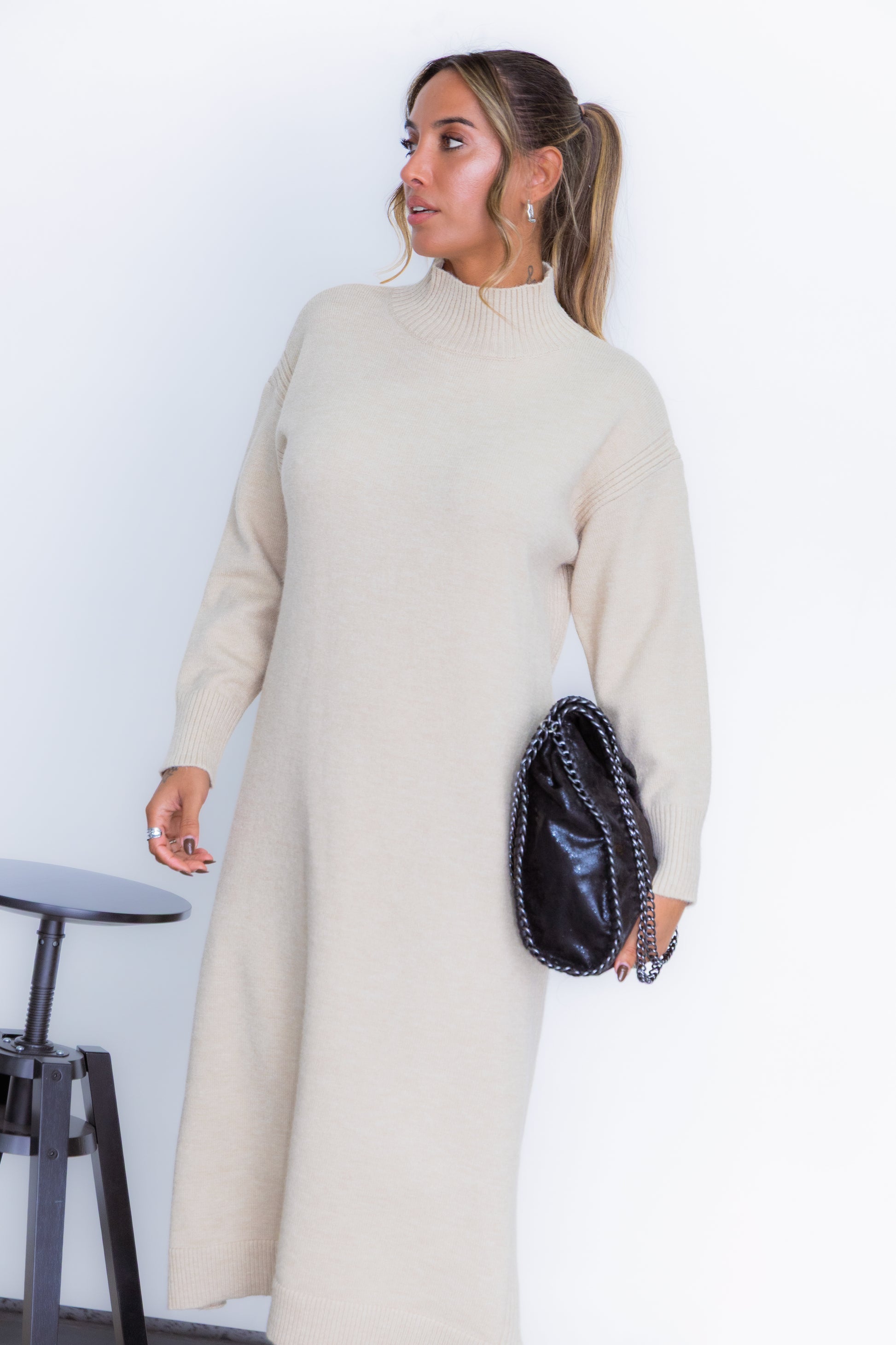 Vestido em malha com pormenor de canelado lateral.Tamanho único serve até L/XL.