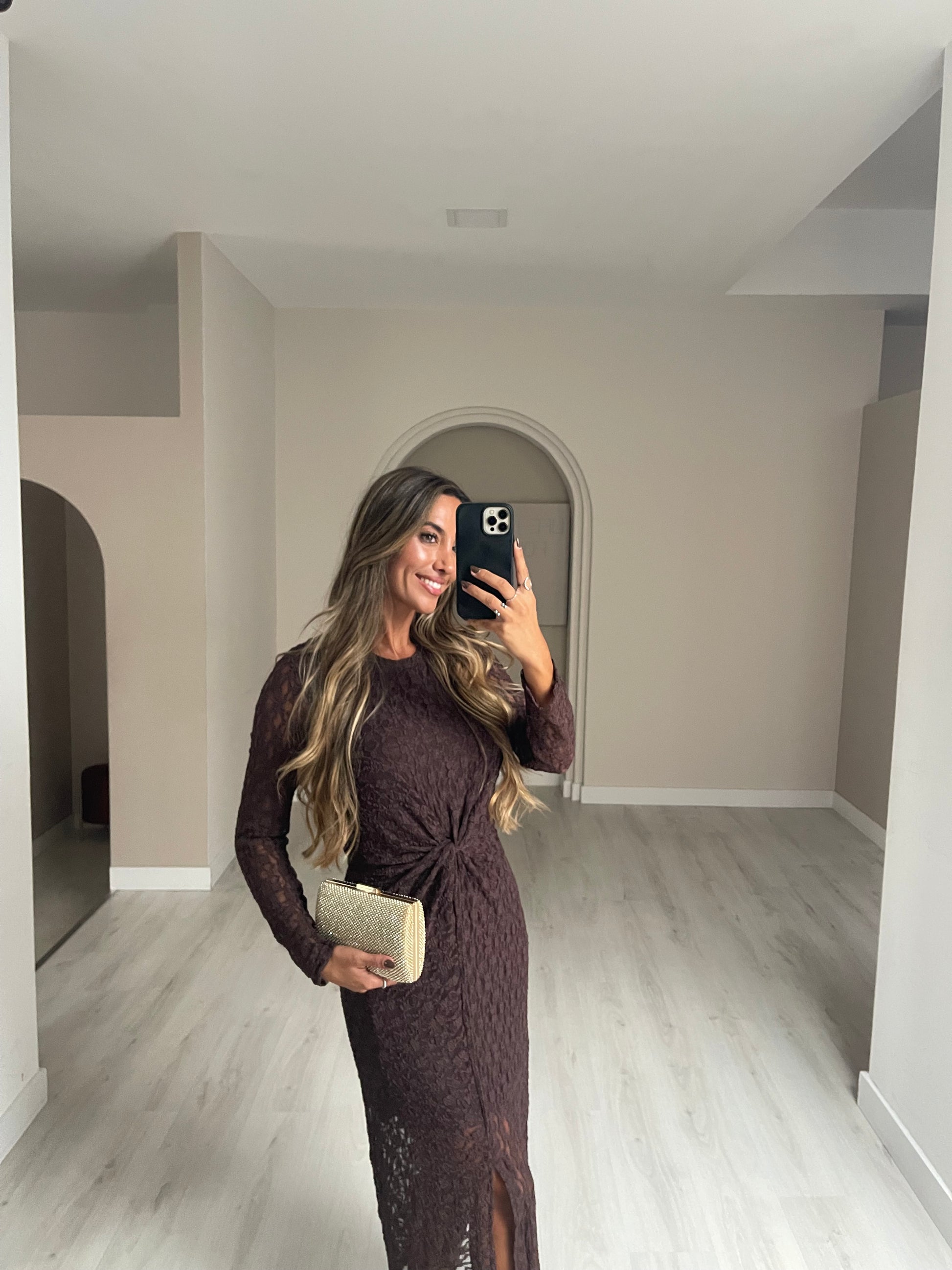 Vestido c drapeado na barriga. a modelo está com o S