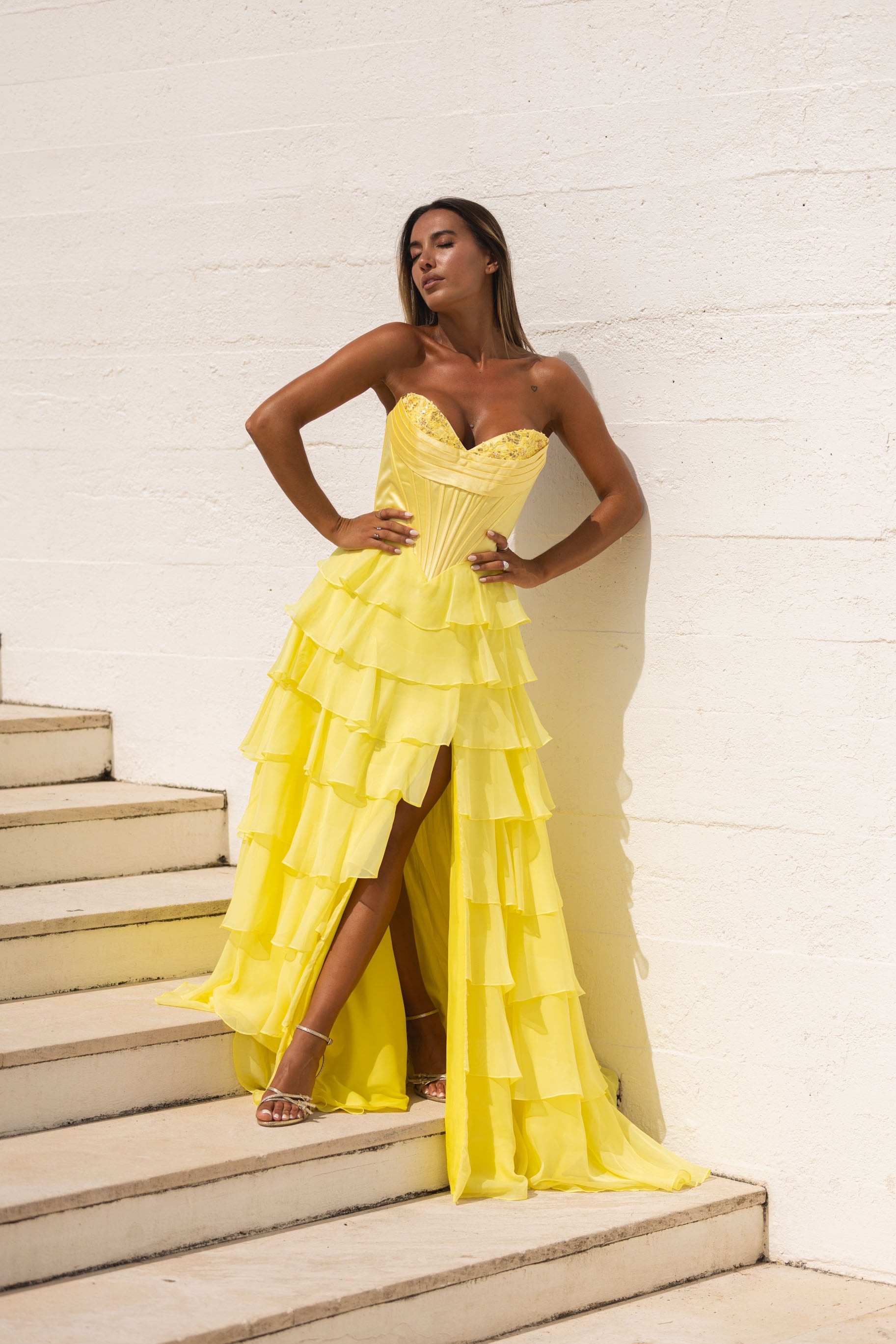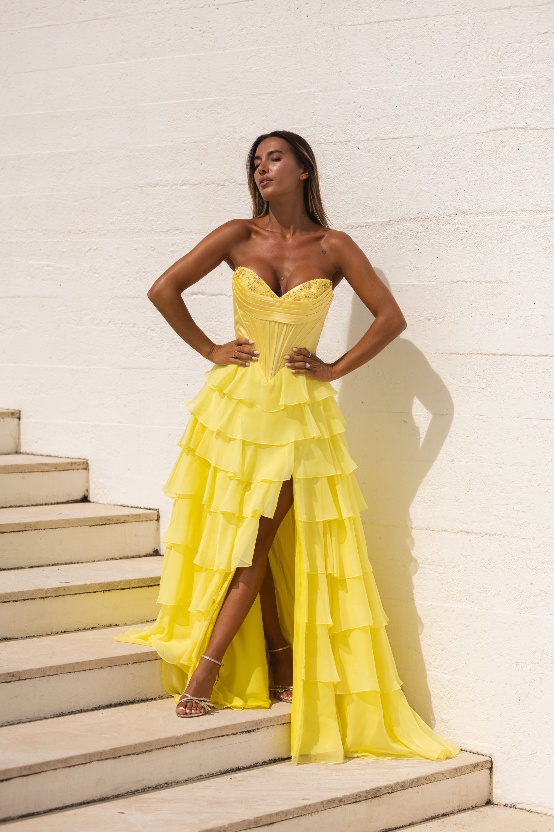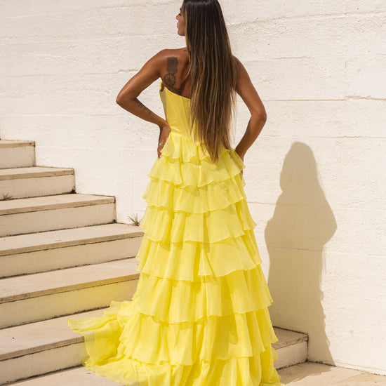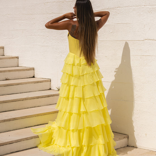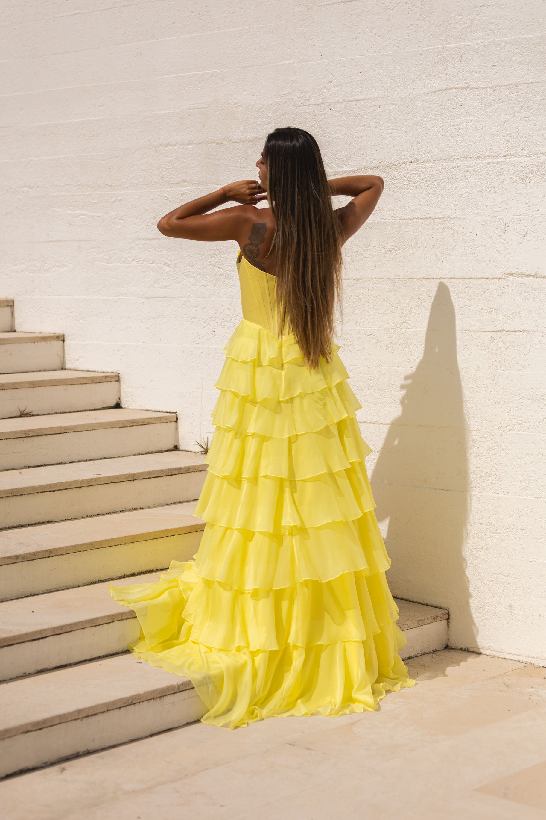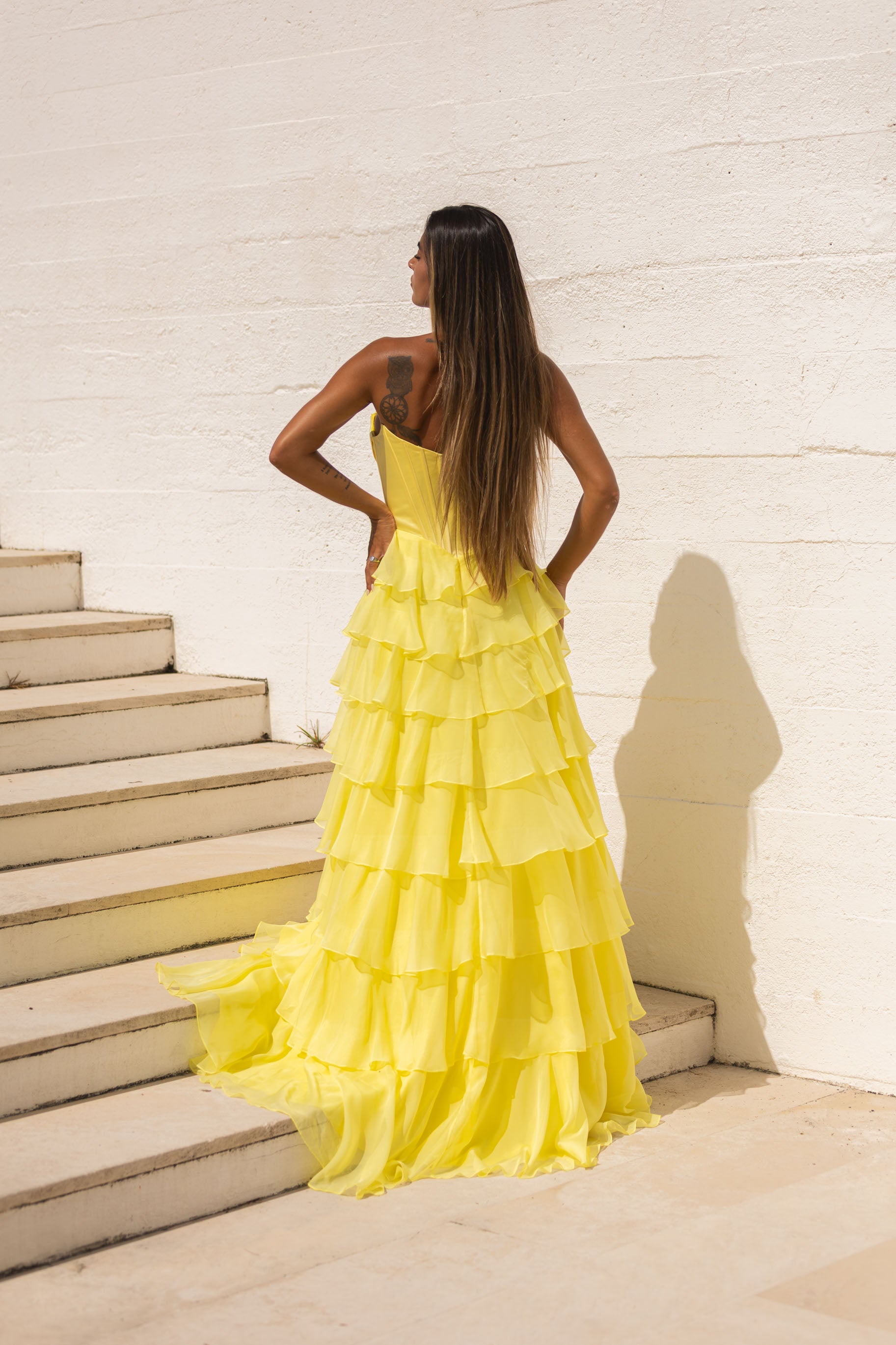 Fluido e marcante, é uma peça que encanta à primeira vista. Com camadas leves de tecido estampado, ele mistura sensualidade com romantismo boho-chic. Ideal para ocasiões especiais ao pôr do sol ou festas de verão onde a elegância precisa brilhar.