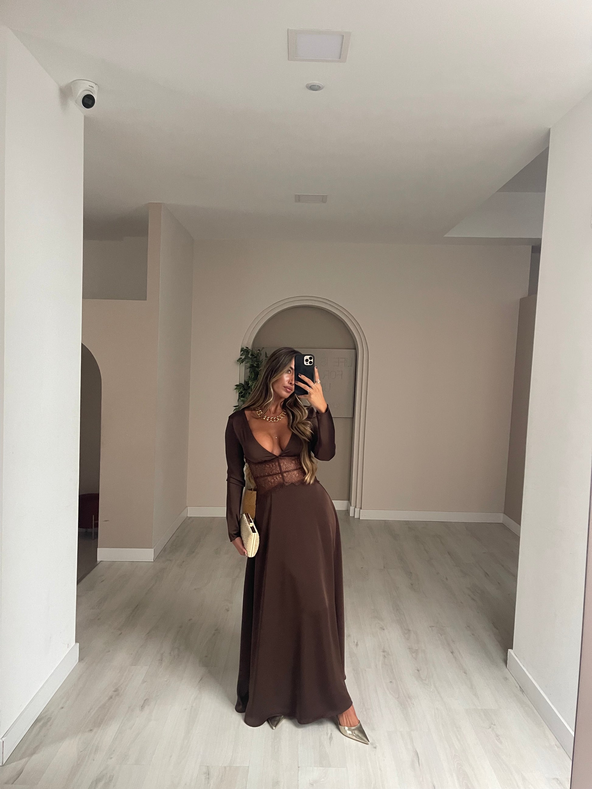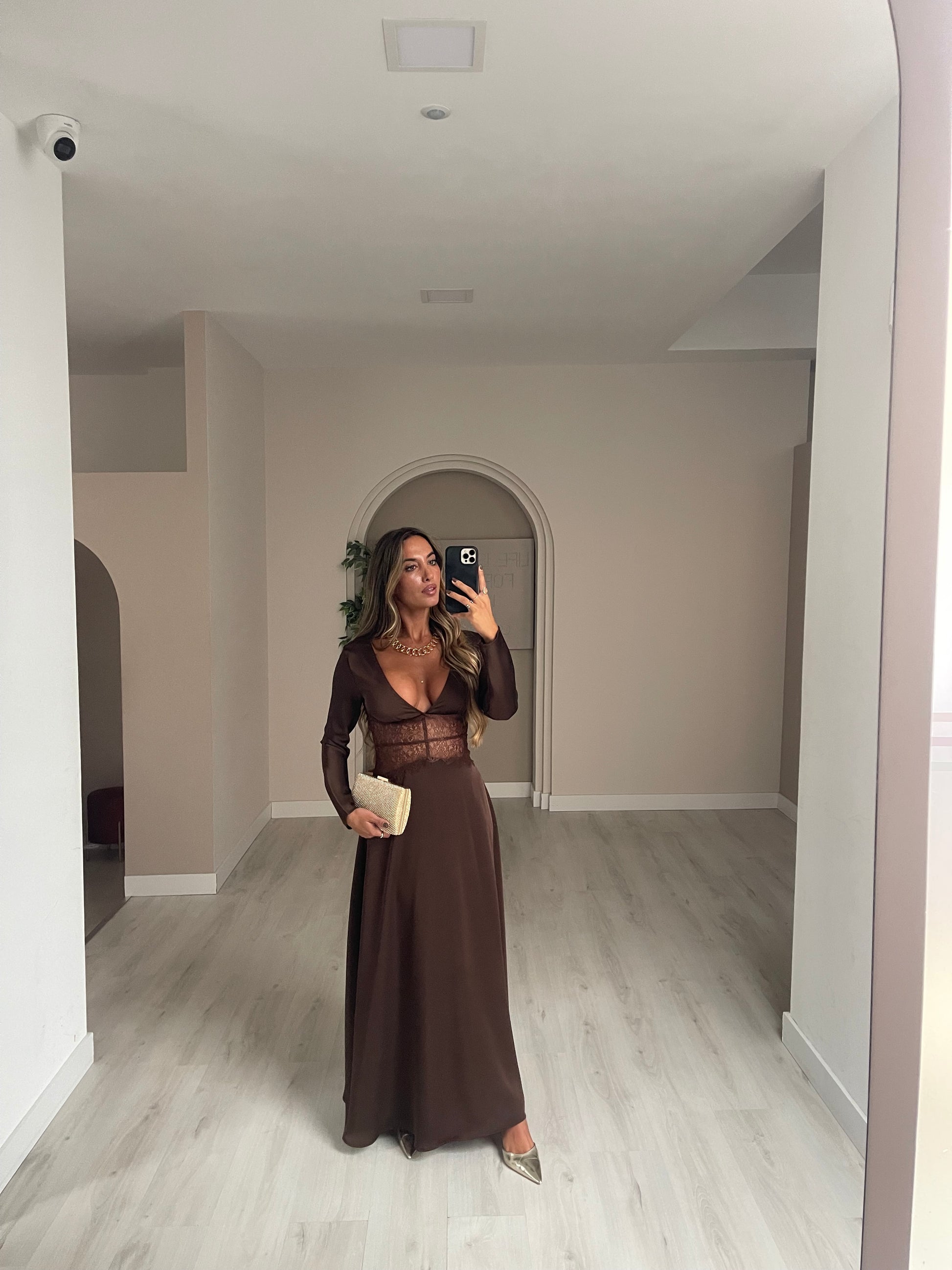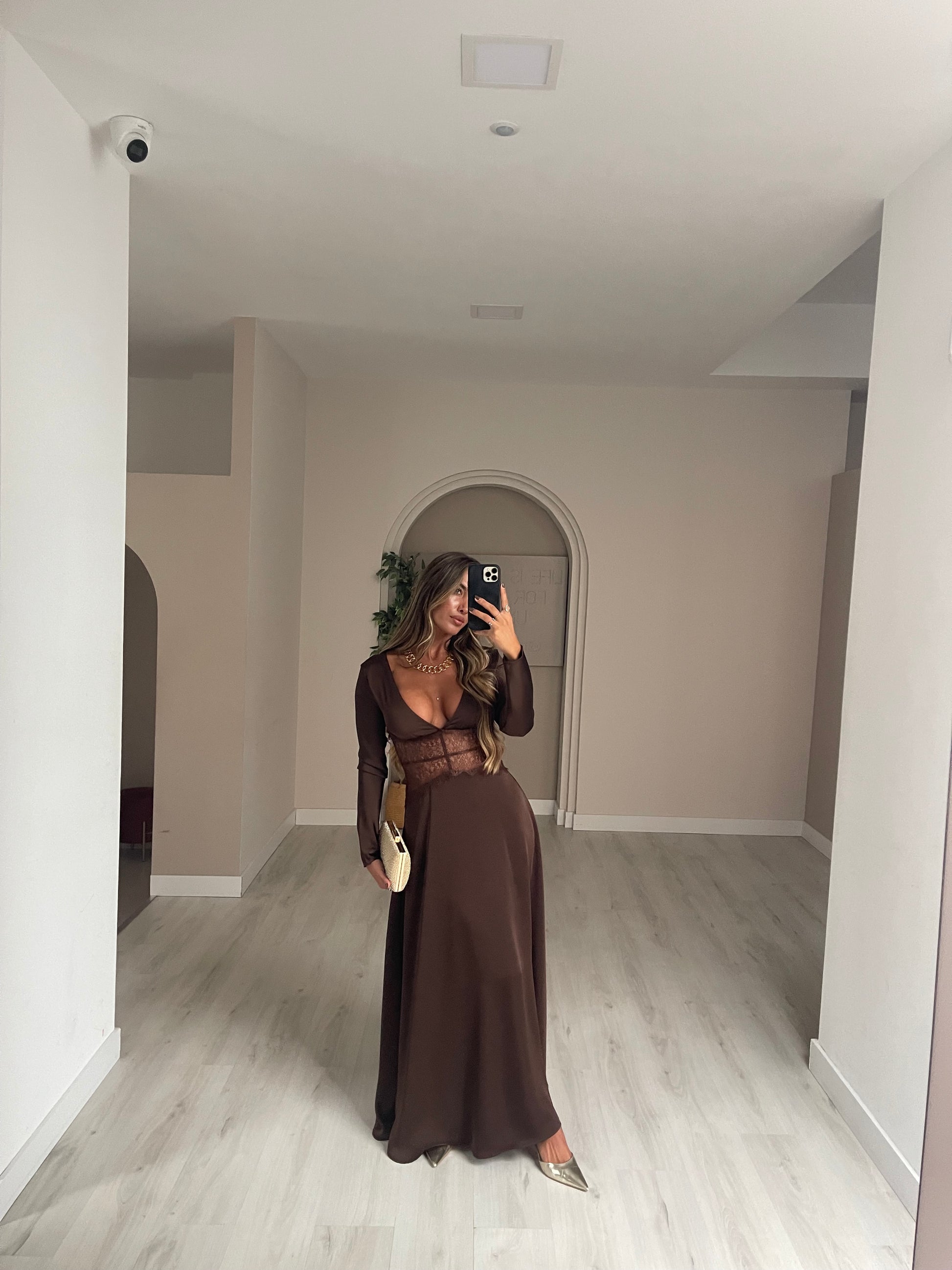 Vestido comprido em cetim com o pormenor de renda na barriga.