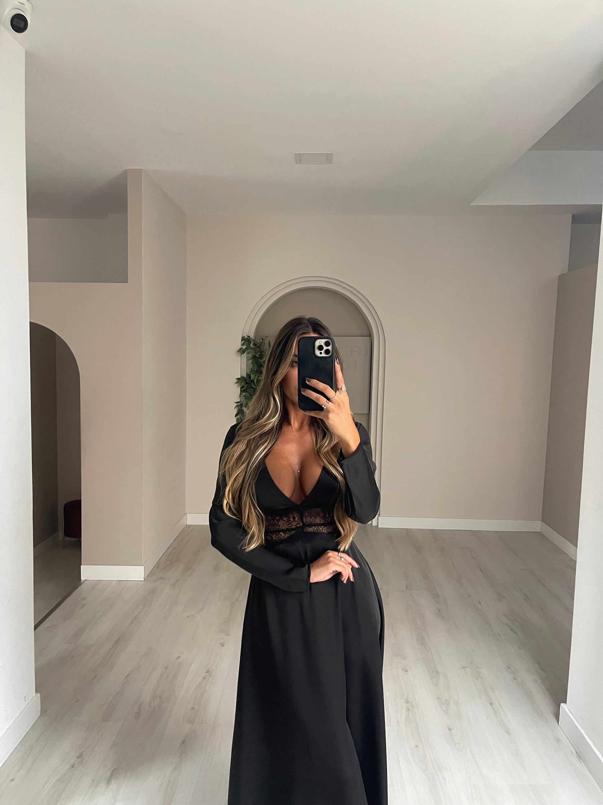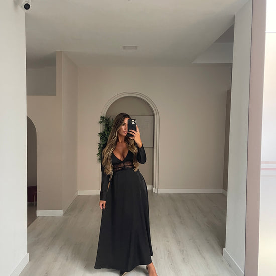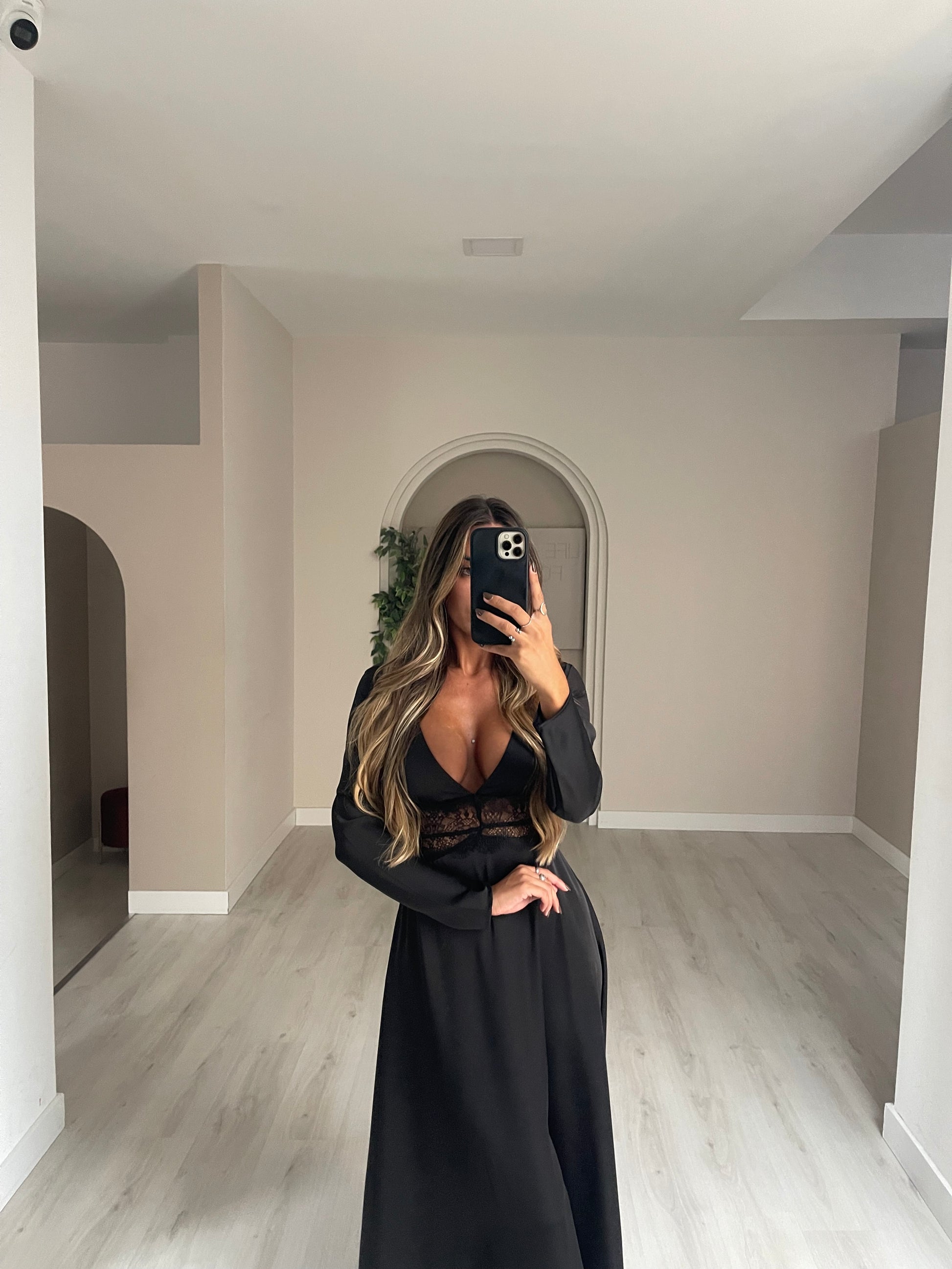 Vestido comprido em cetim com o pormenor de renda na barriga.