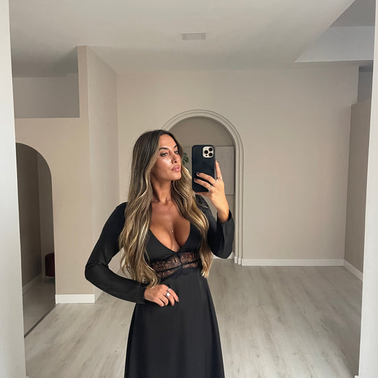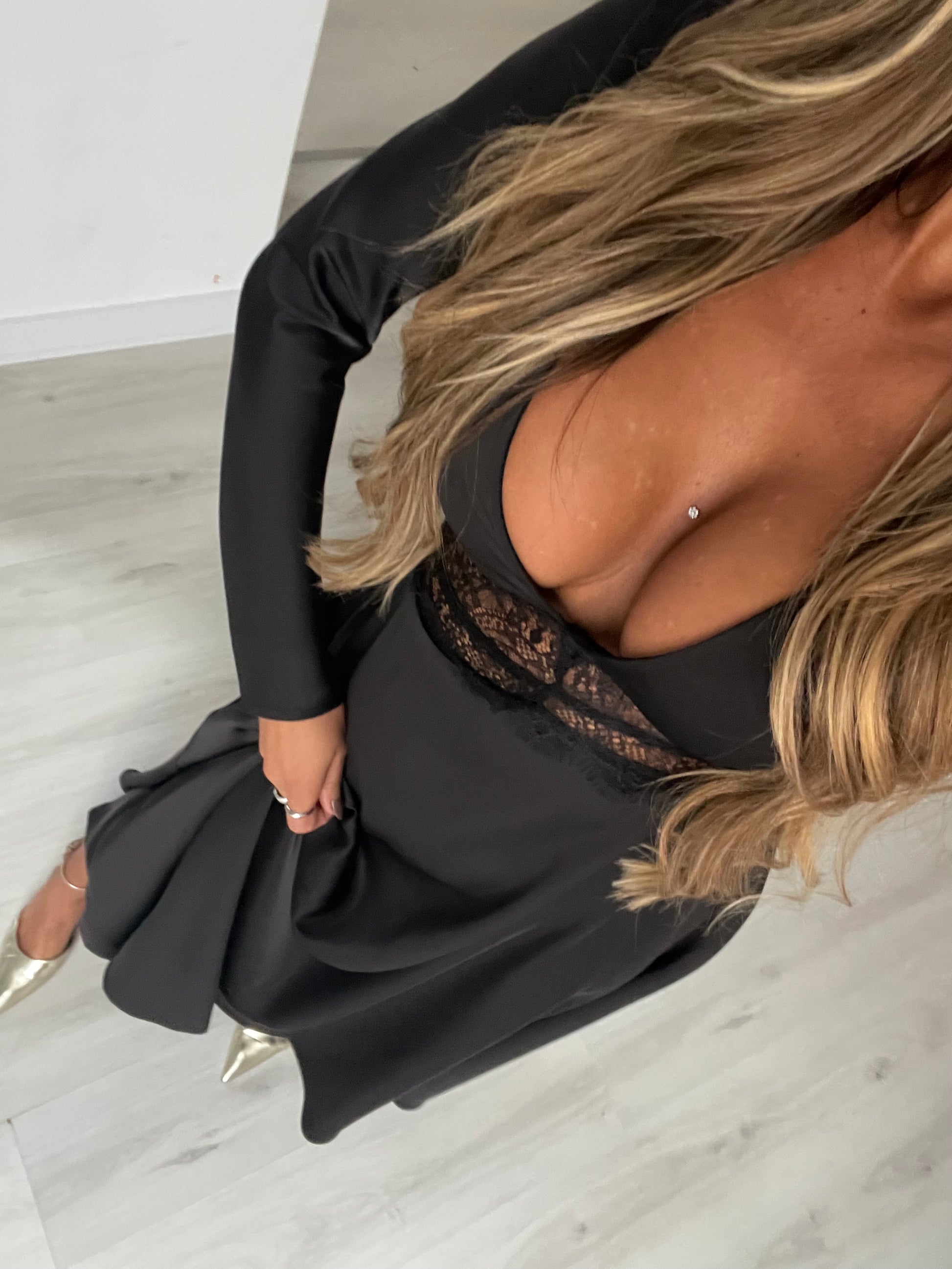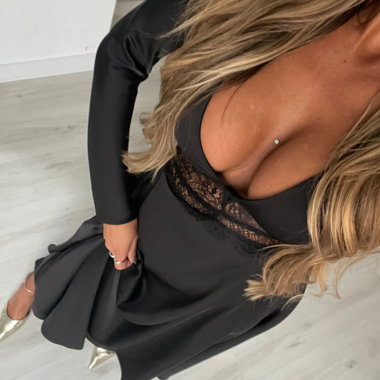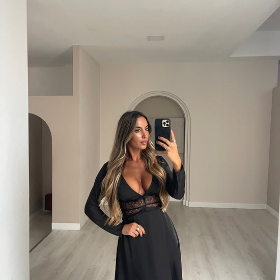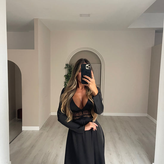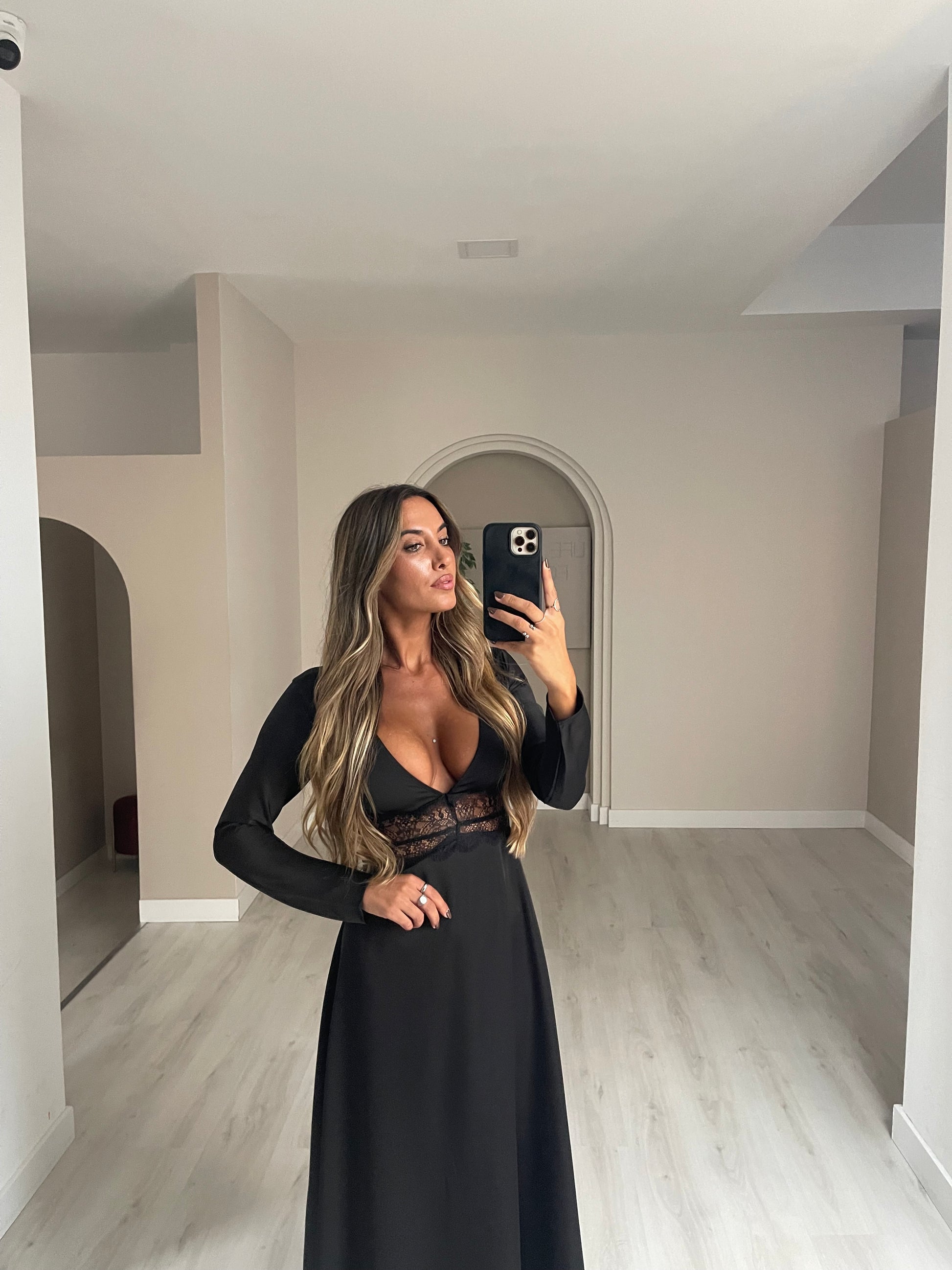 Vestido comprido em cetim com o pormenor de renda na barriga.