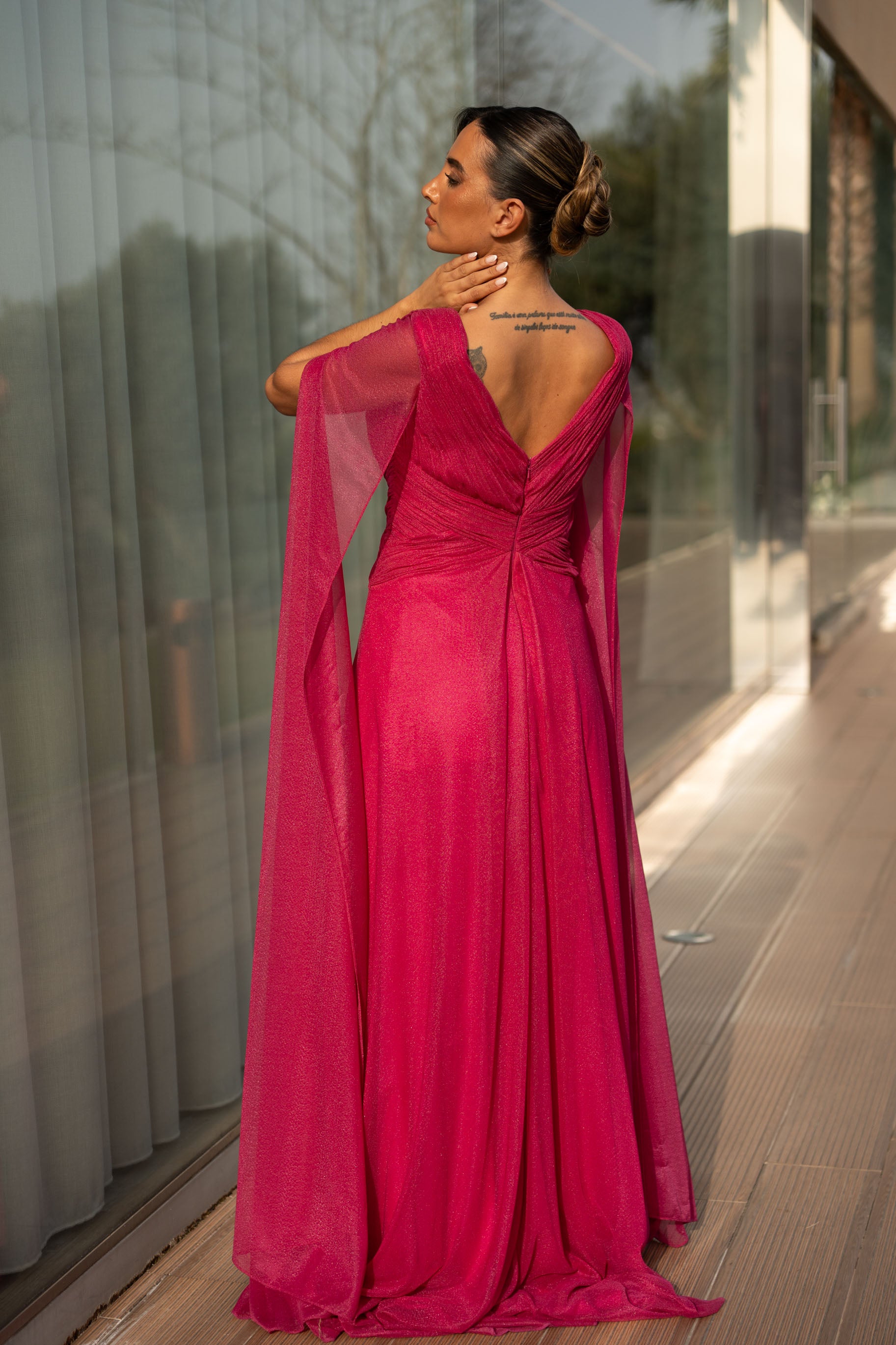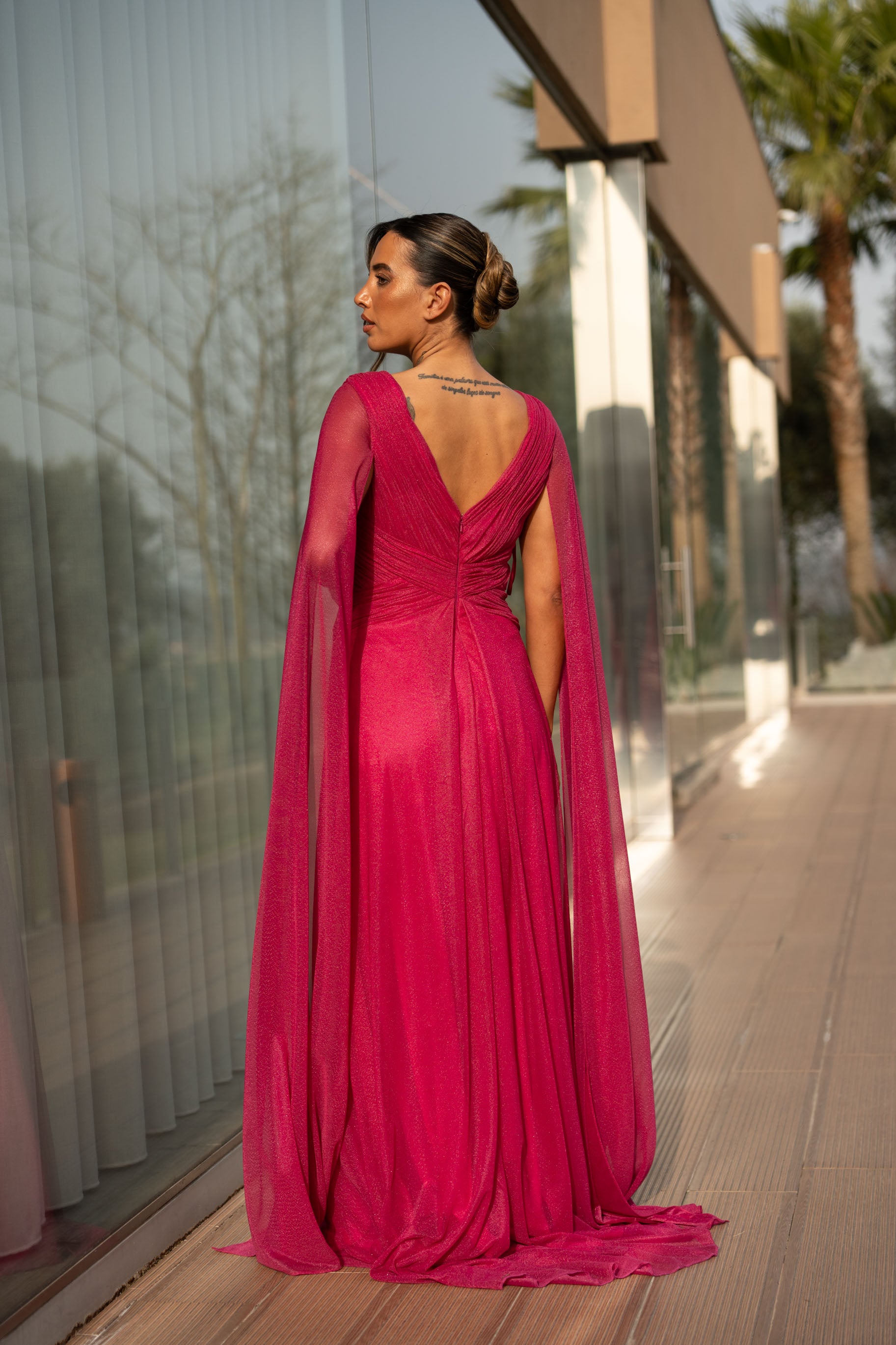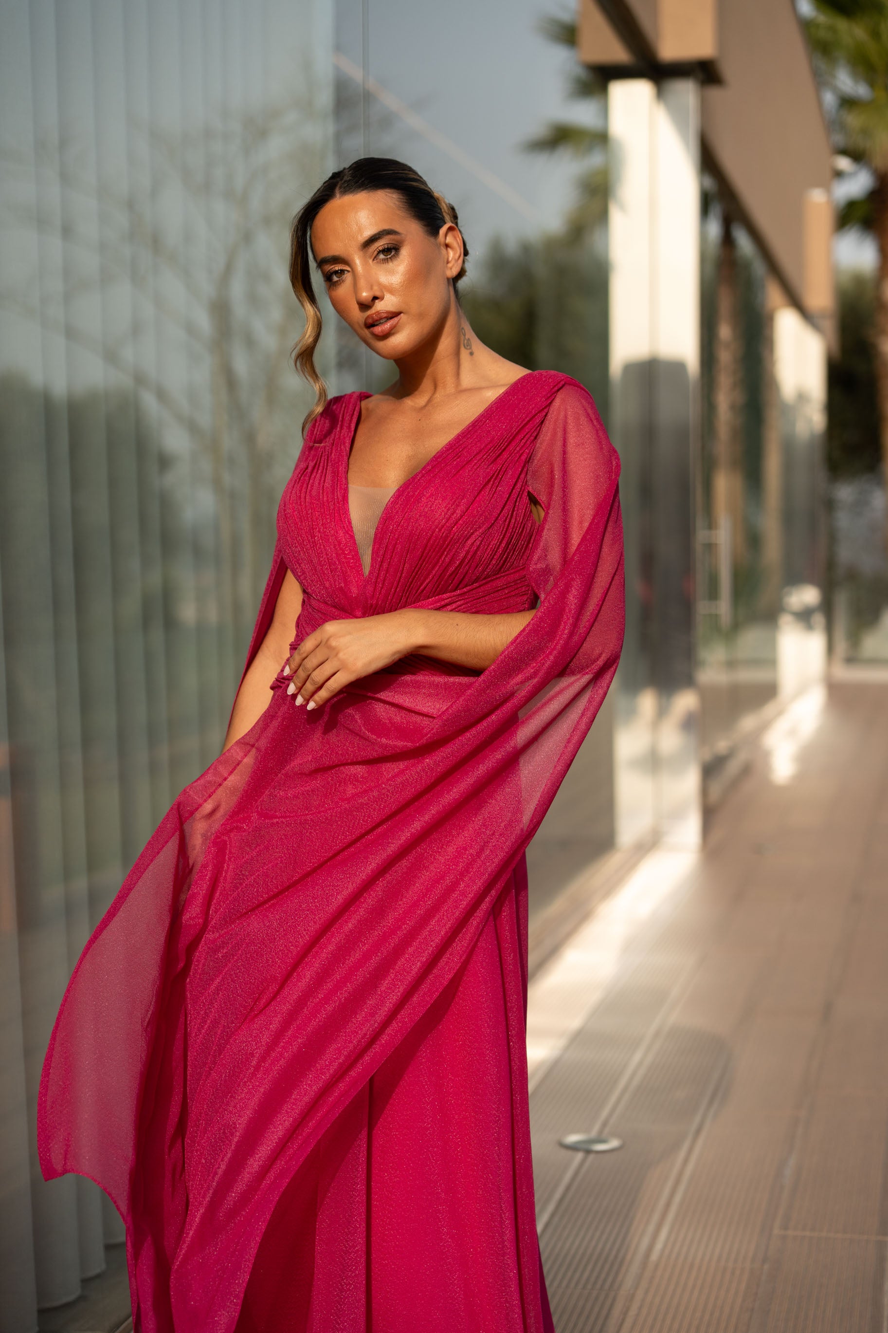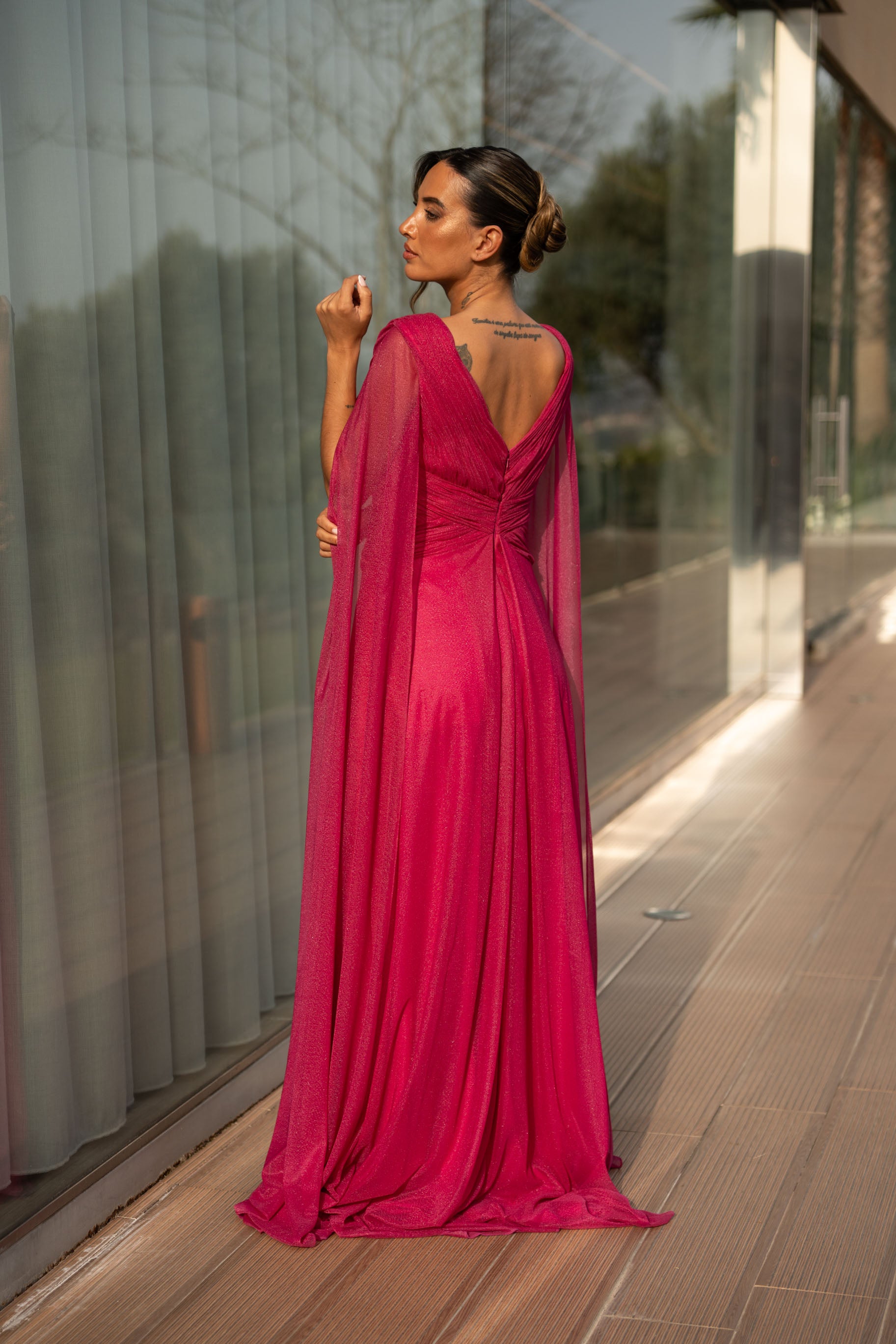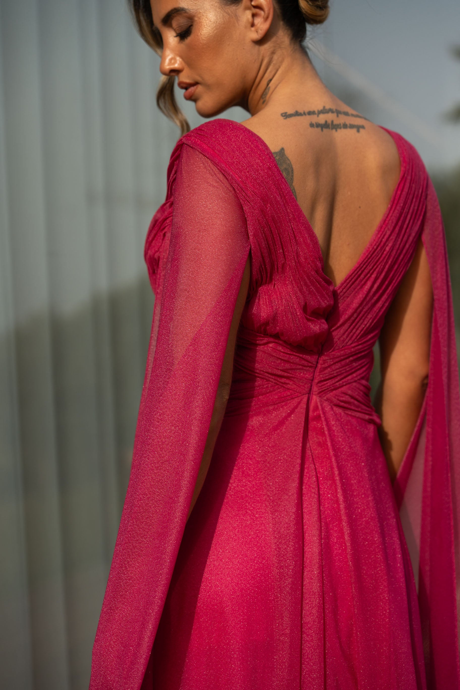 Vestido em viscose com pormenor de glitter por todo. Veste o tamanho certo, a modelo está com o M.