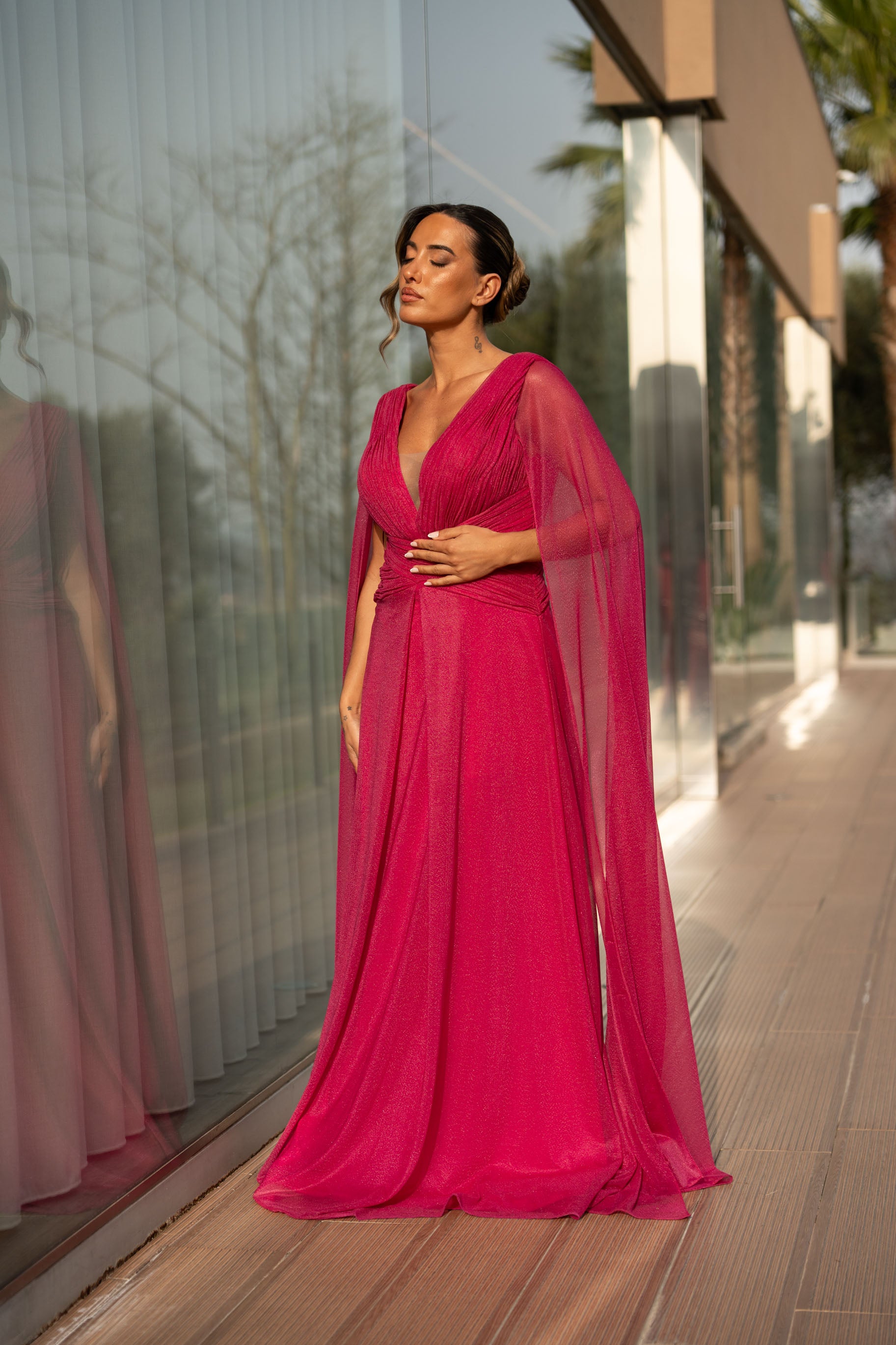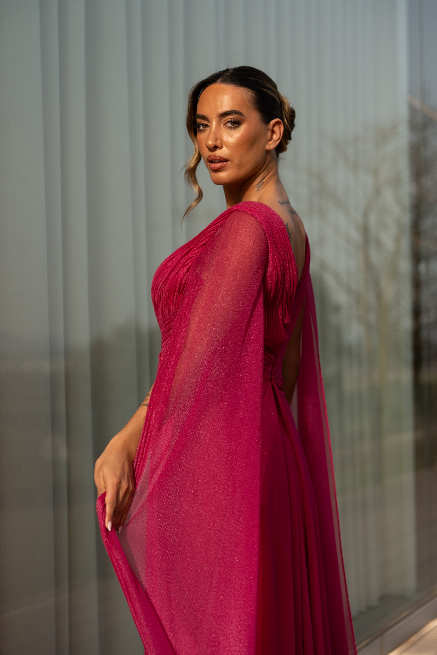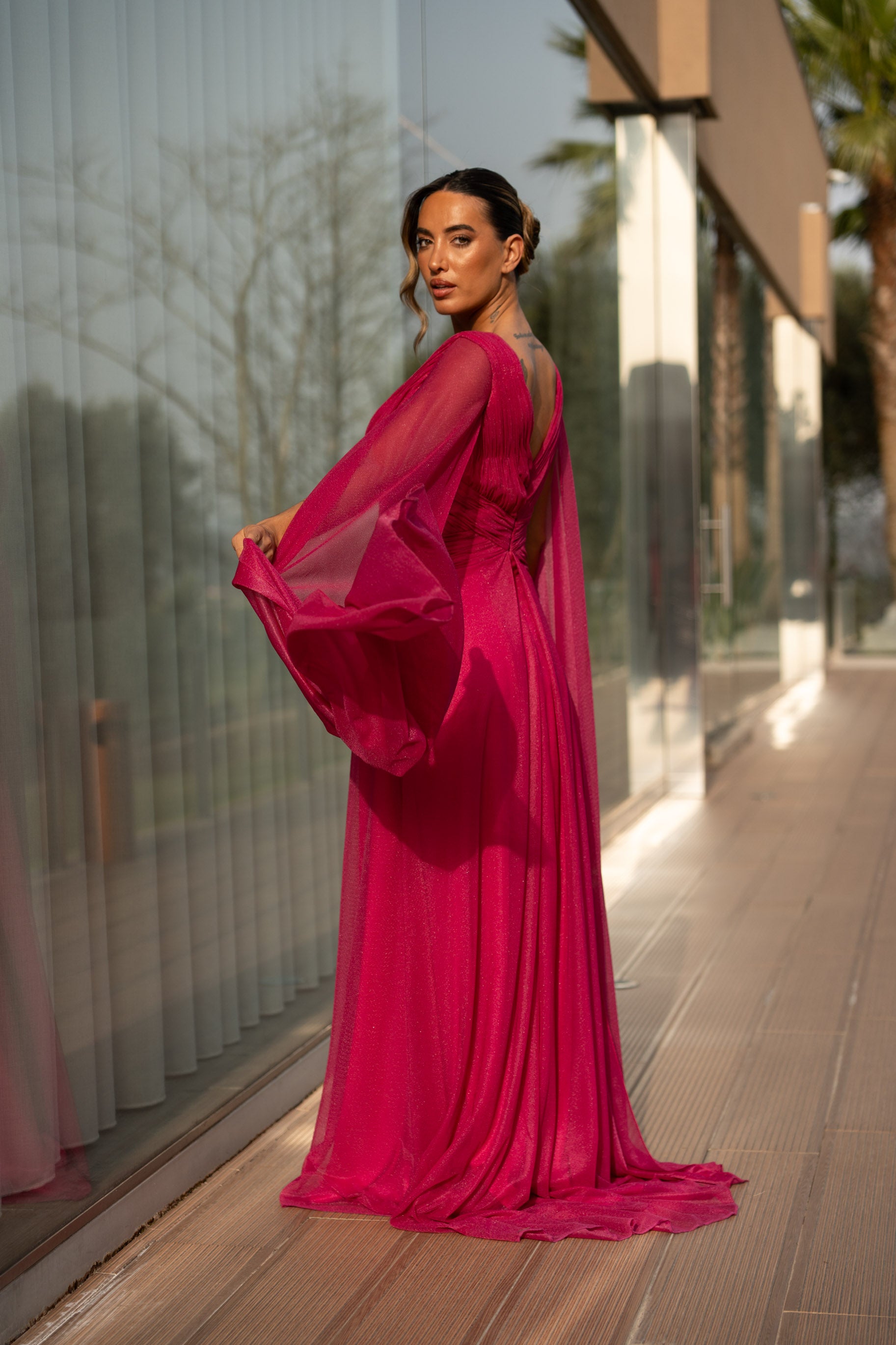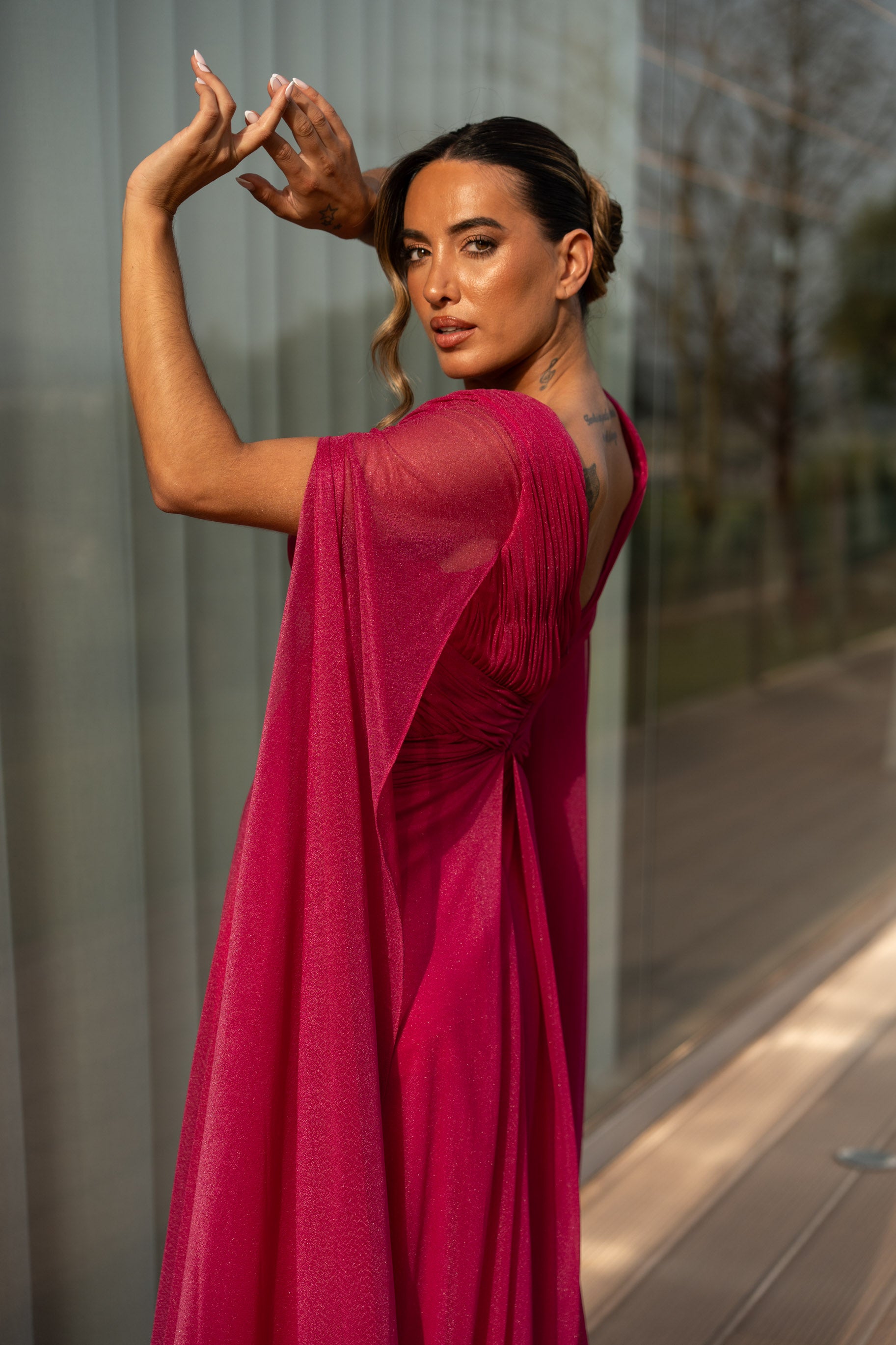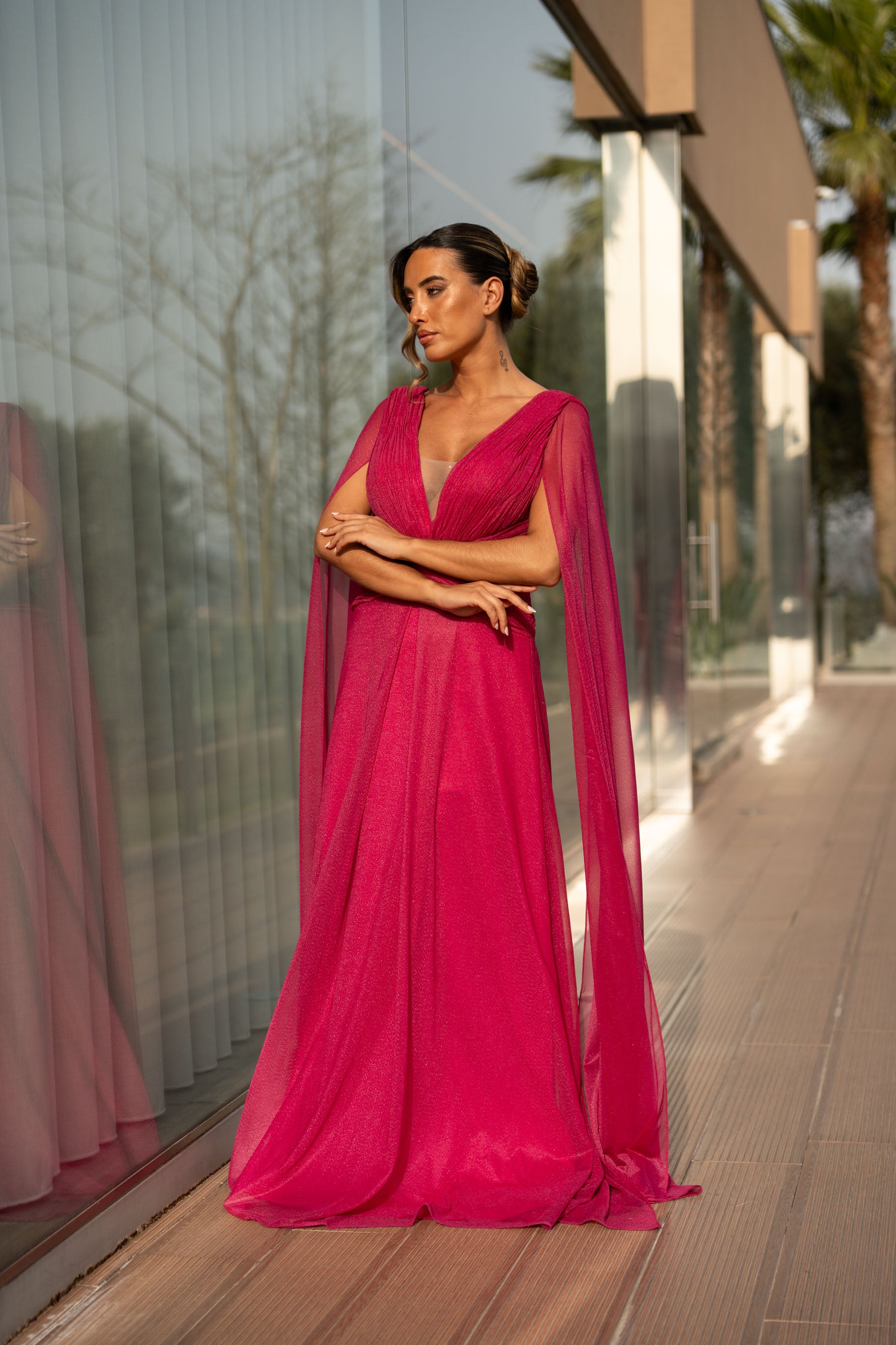 Vestido em viscose com pormenor de glitter por todo. Veste o tamanho certo, a modelo está com o M.