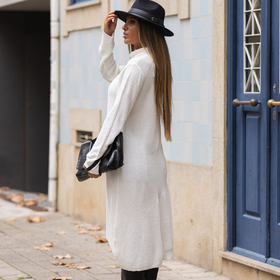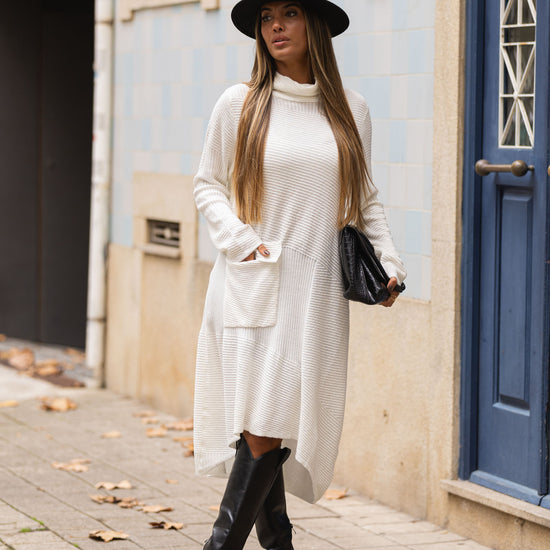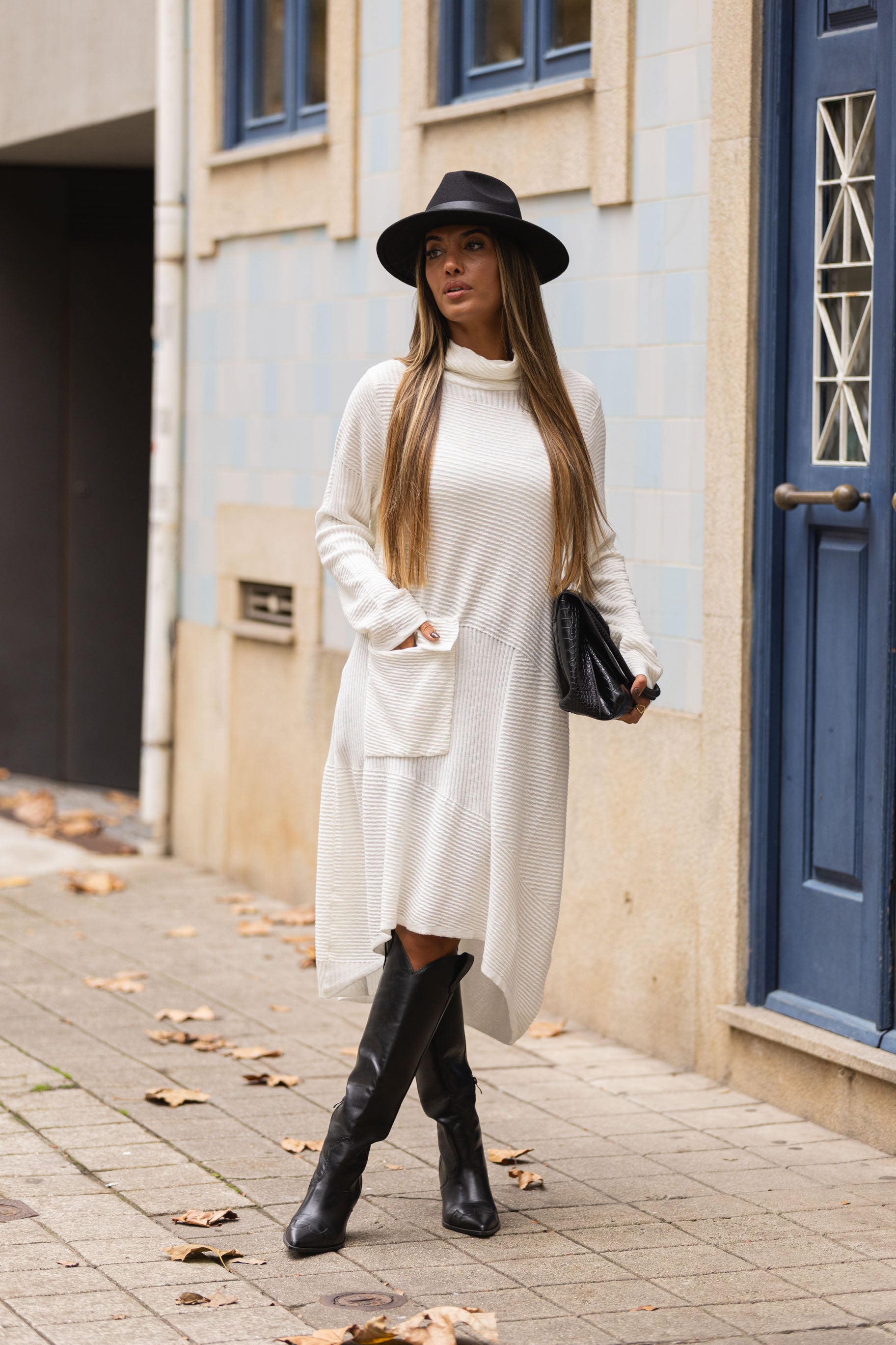 Vestudo em malha com meia gola e manga comprida. Super confortável, a malha nao pica e veste soltinho. A modelo está com o S/M.