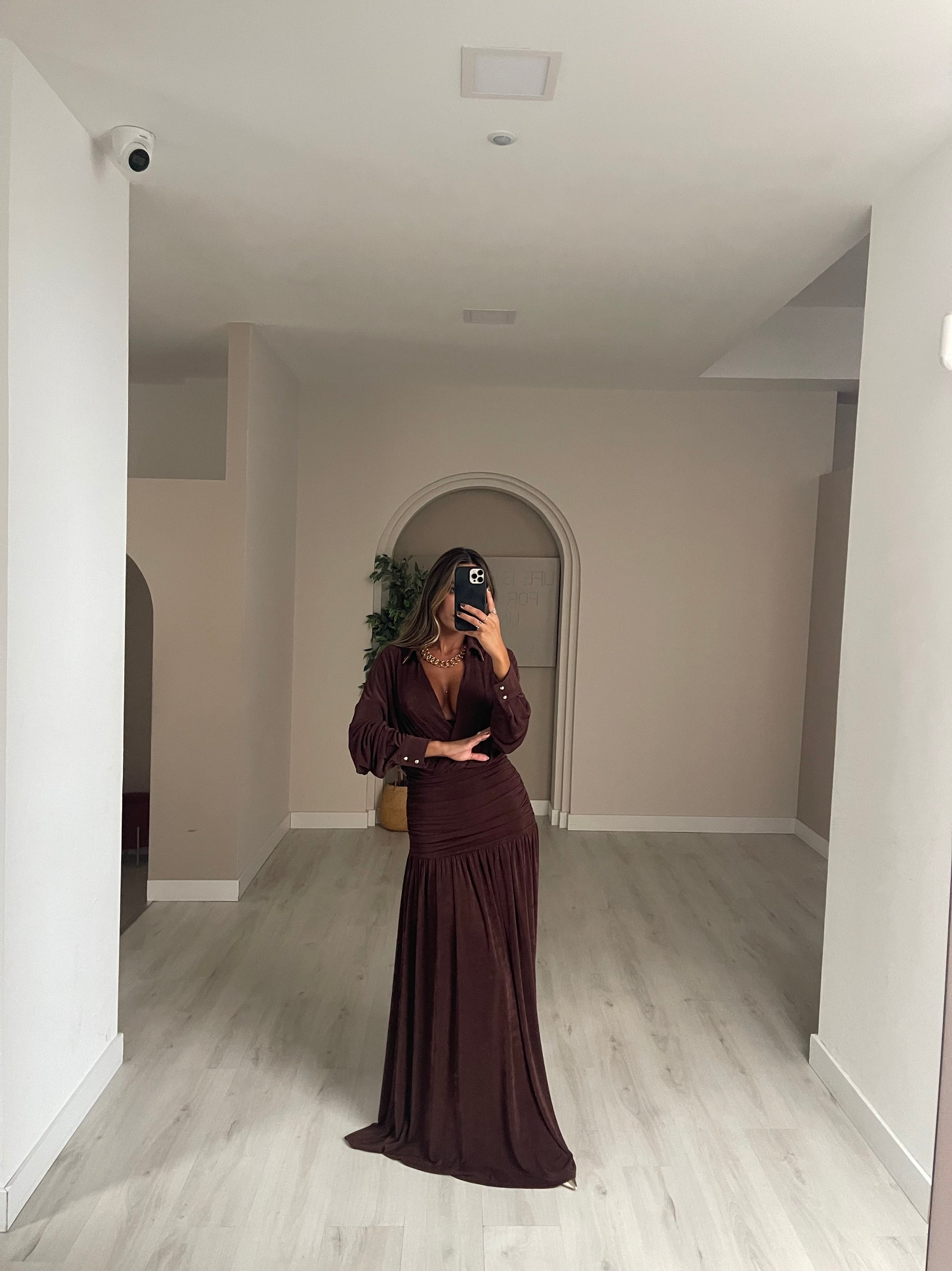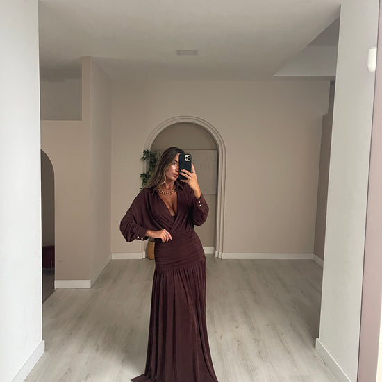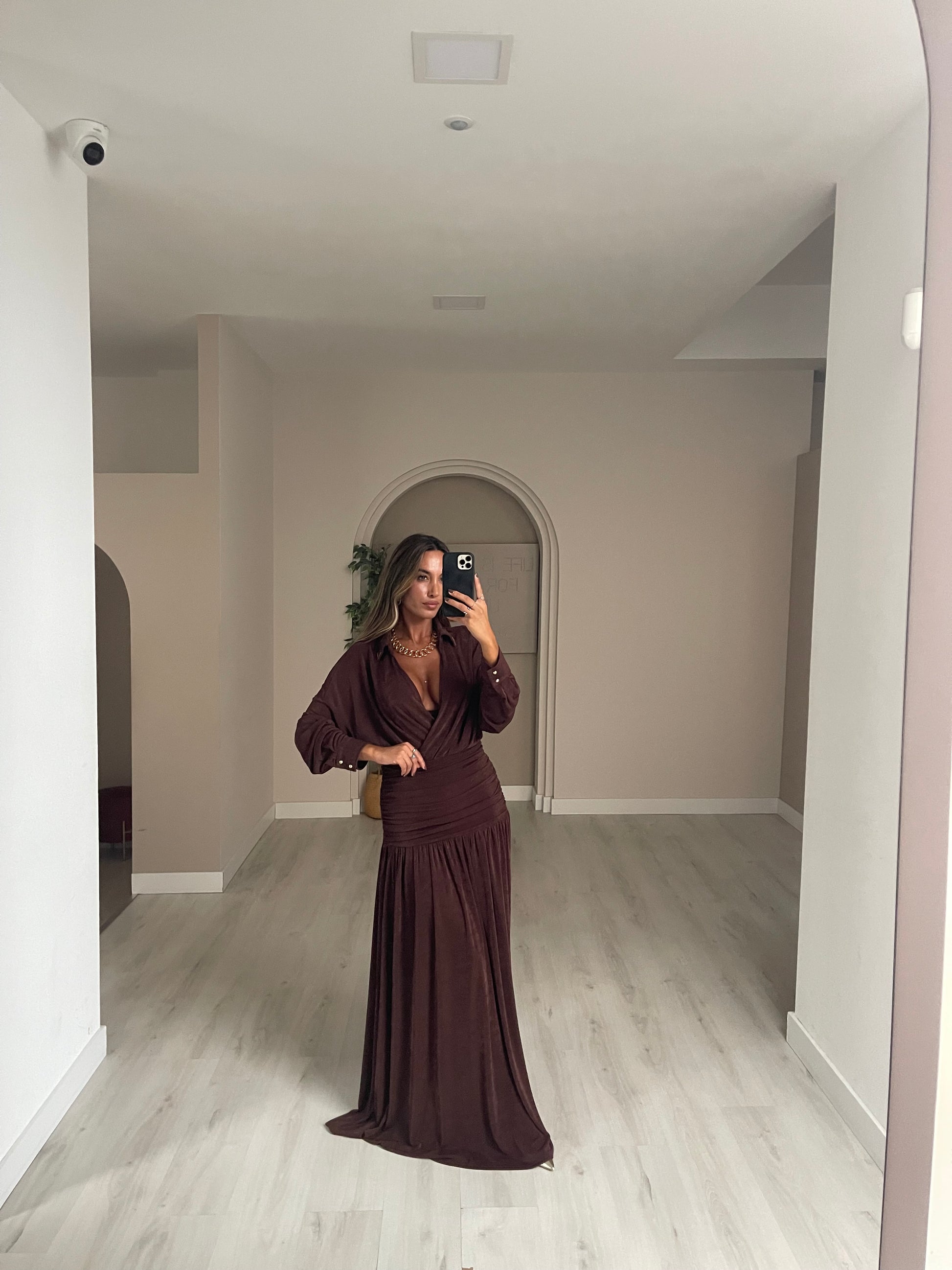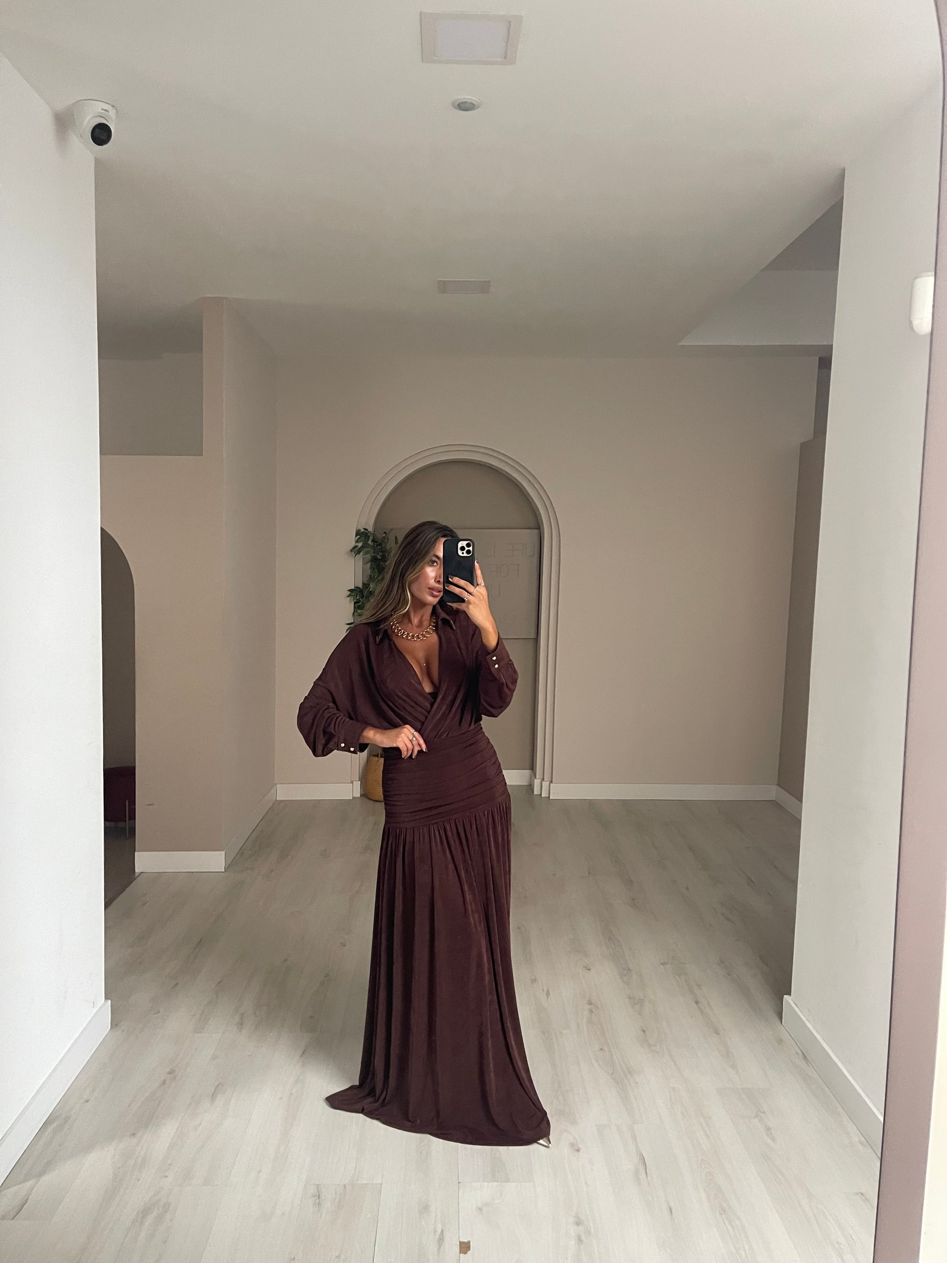 Vestido comprido em malha fria com o pormenor de drapeado na barriga.