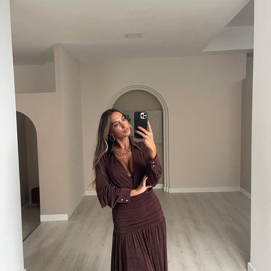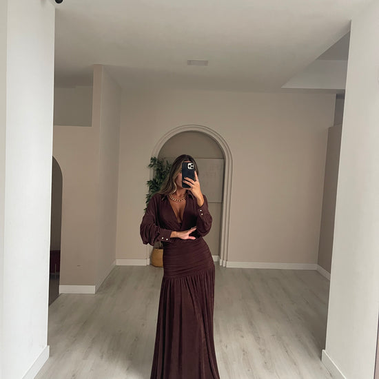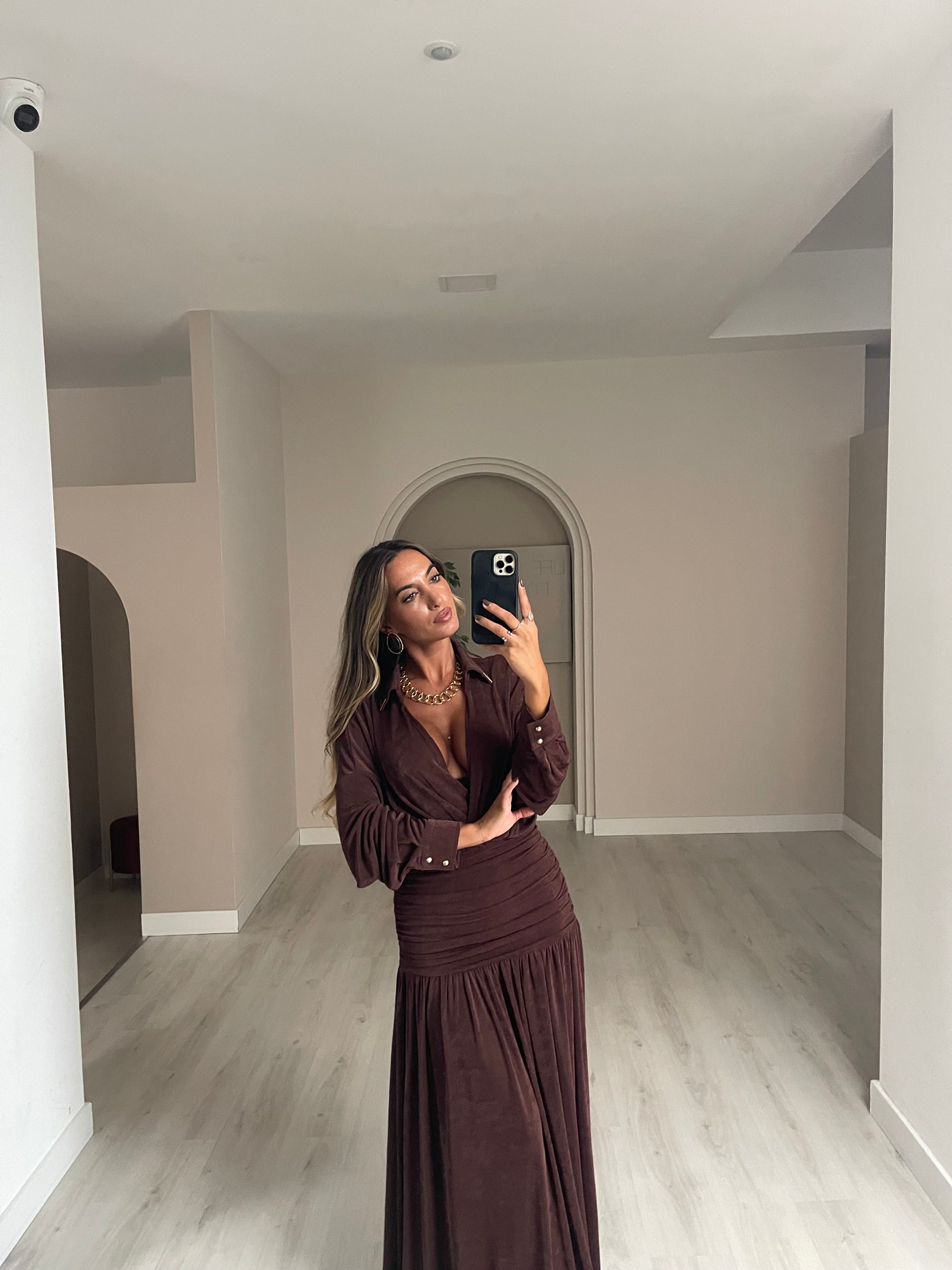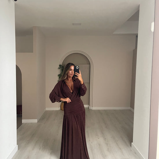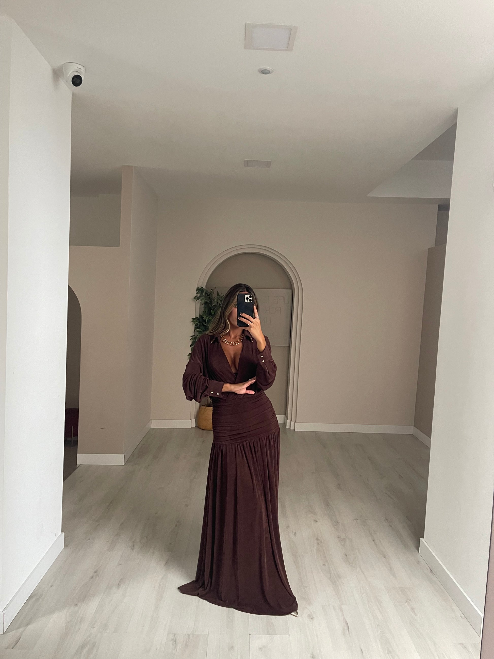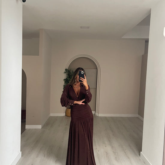 Vestido comprido em malha fria com o pormenor de drapeado na barriga.